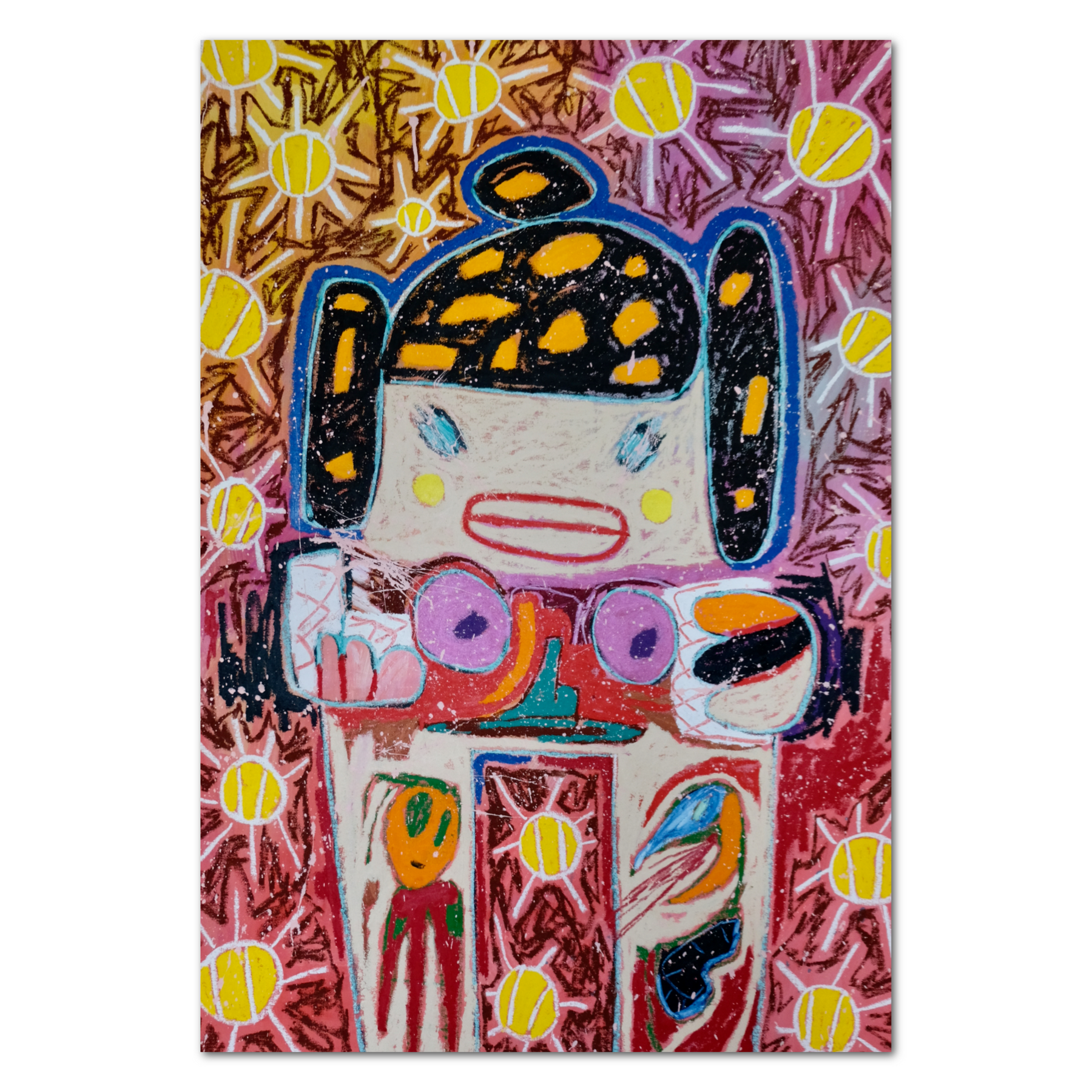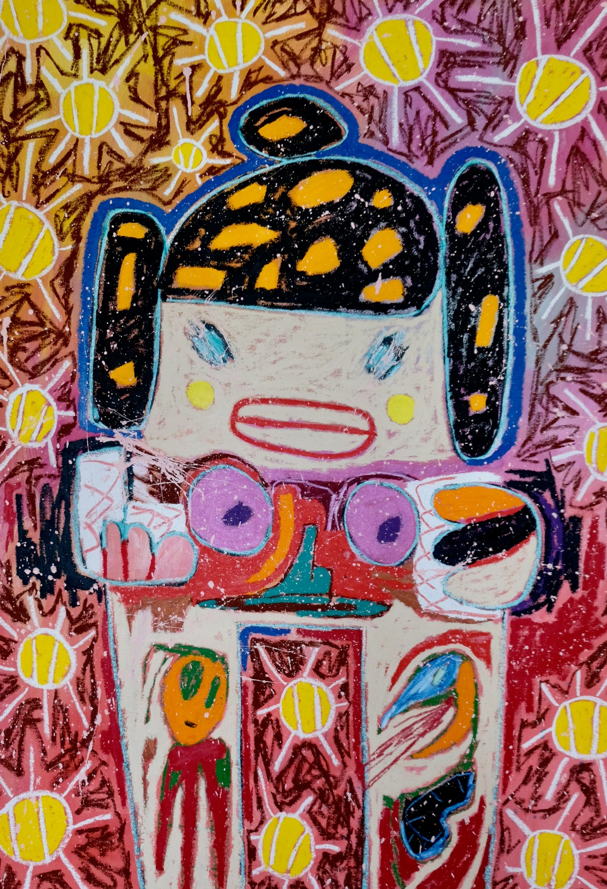 Using acrylic paint, oil stick, pencil, and markers, Handler’s child-like and passionate drawing technique produce distinctive outlined characters which almost appear flat, with little to no depth of field. The backgrounds of his works are highly detailed, but rough, vigorously drawn with scratches and markings that appear to spill over the edge of the canvas, conveying a hurried and improvised feeling.