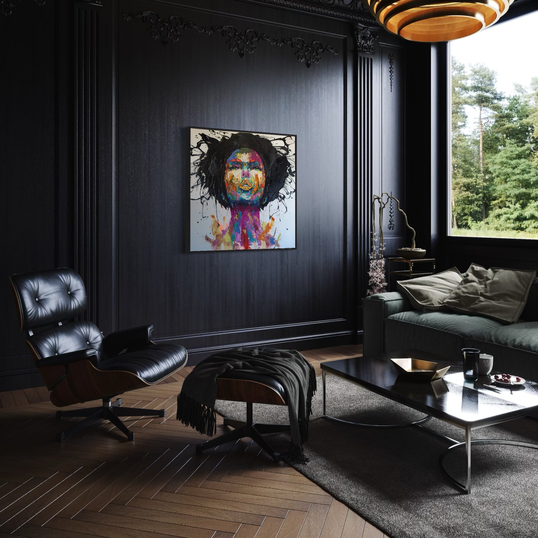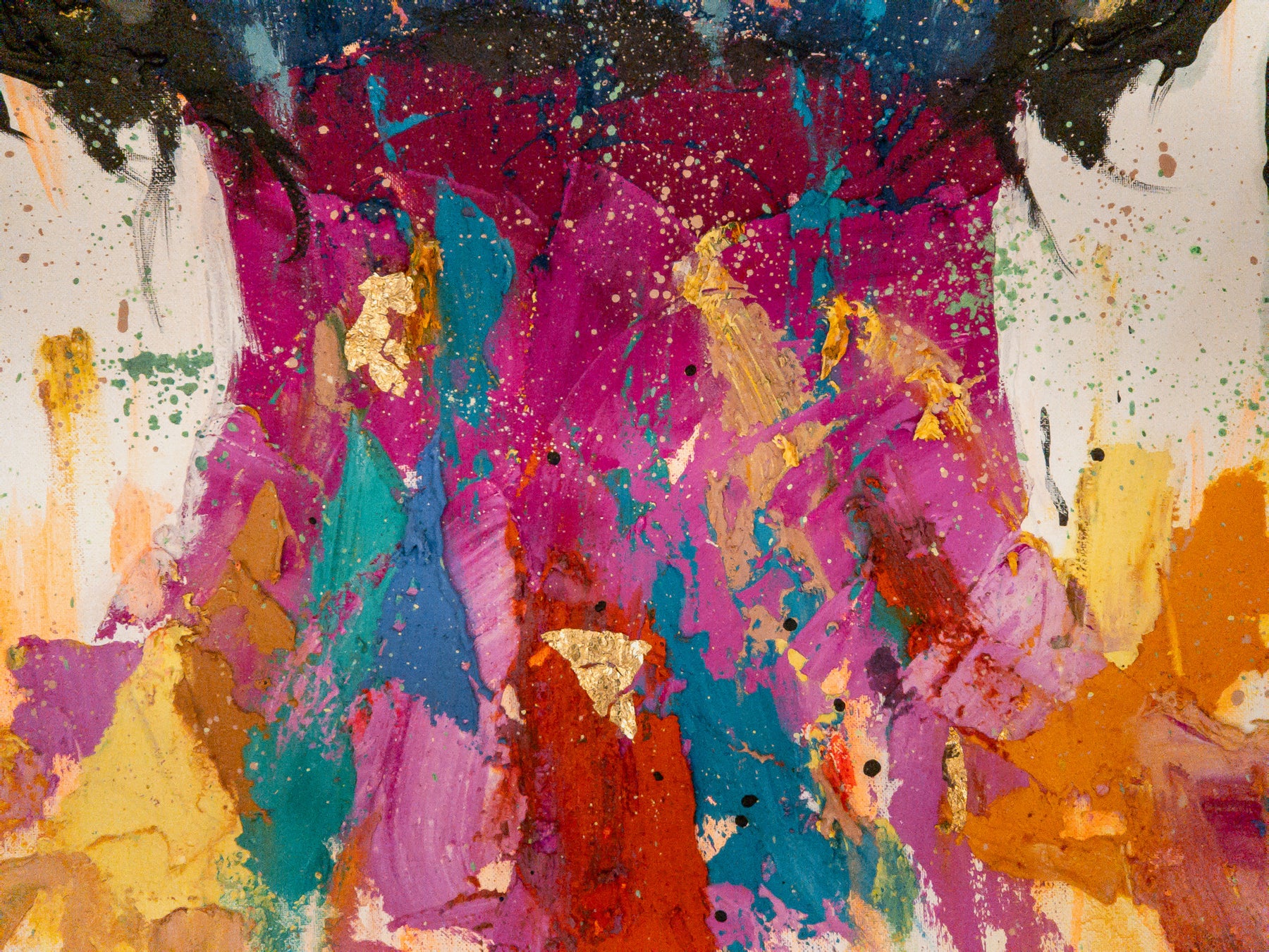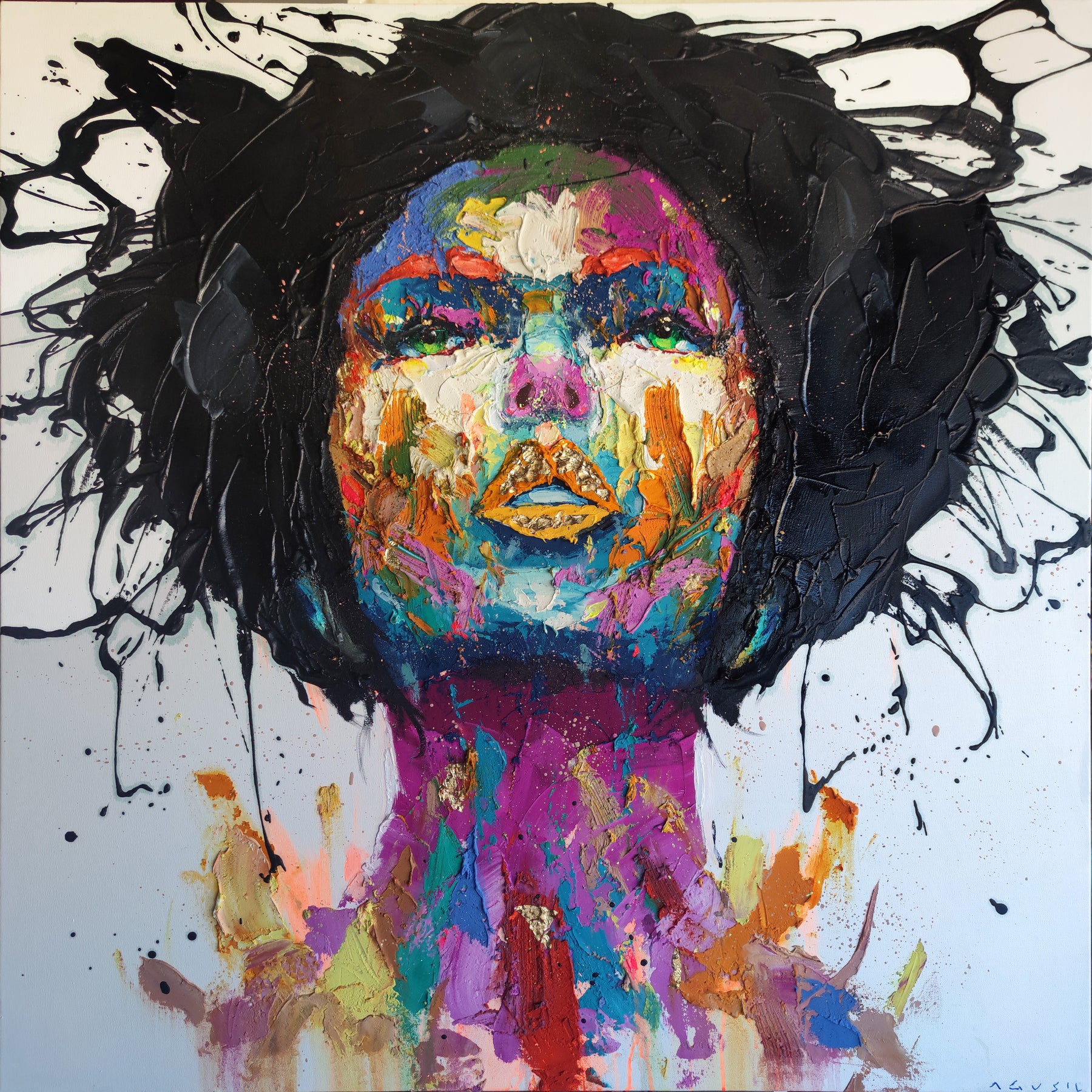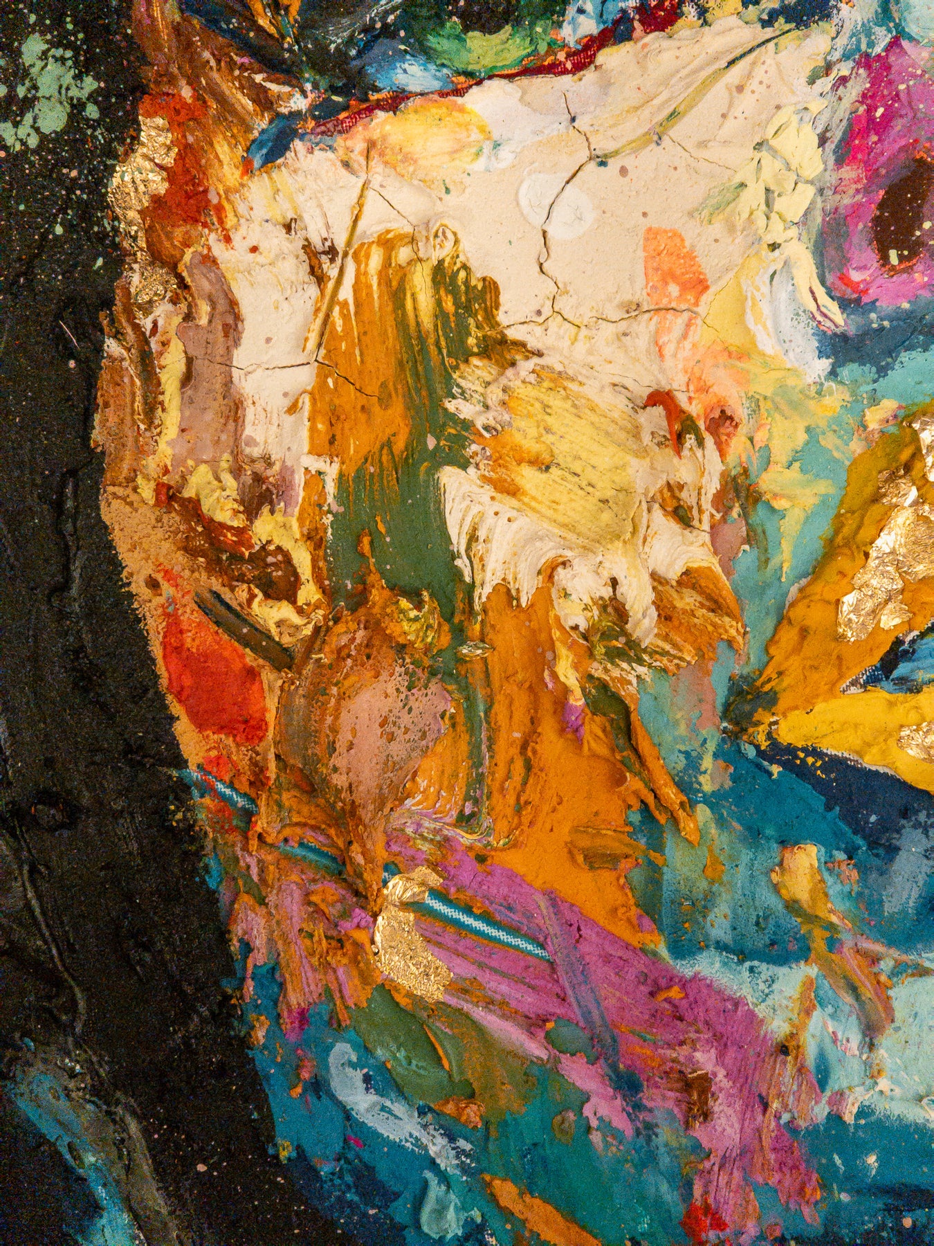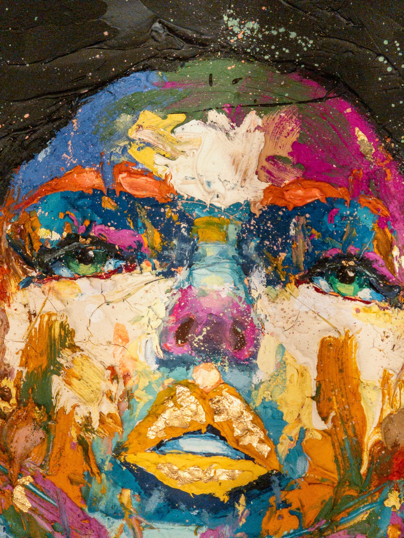 straight on portrait womans head looking up with green eyes multicolored face painted thick and abstract with black splatter hair and gold foil