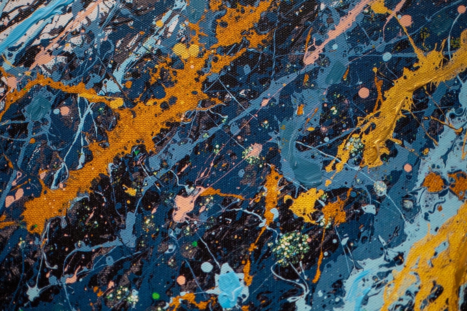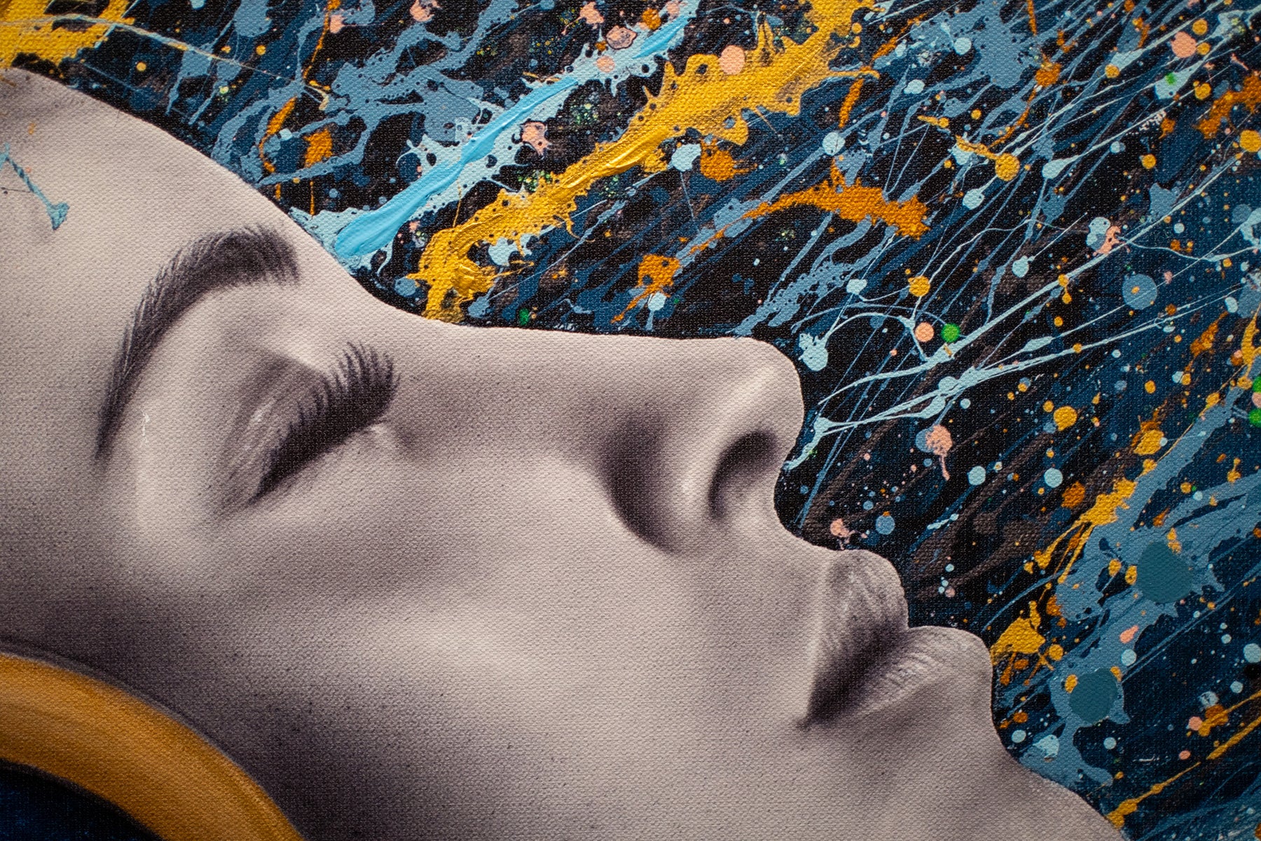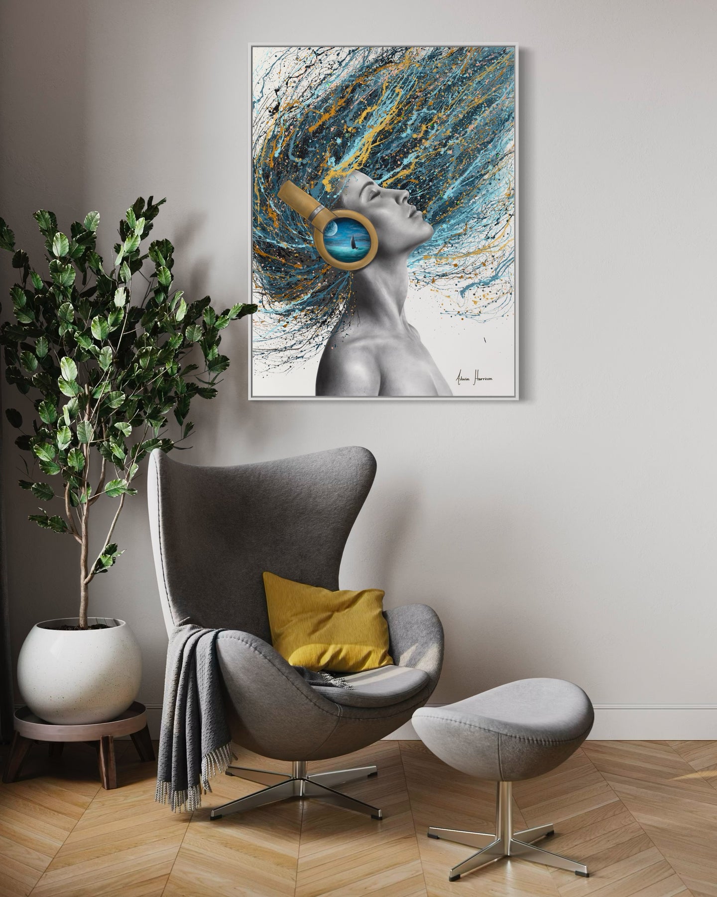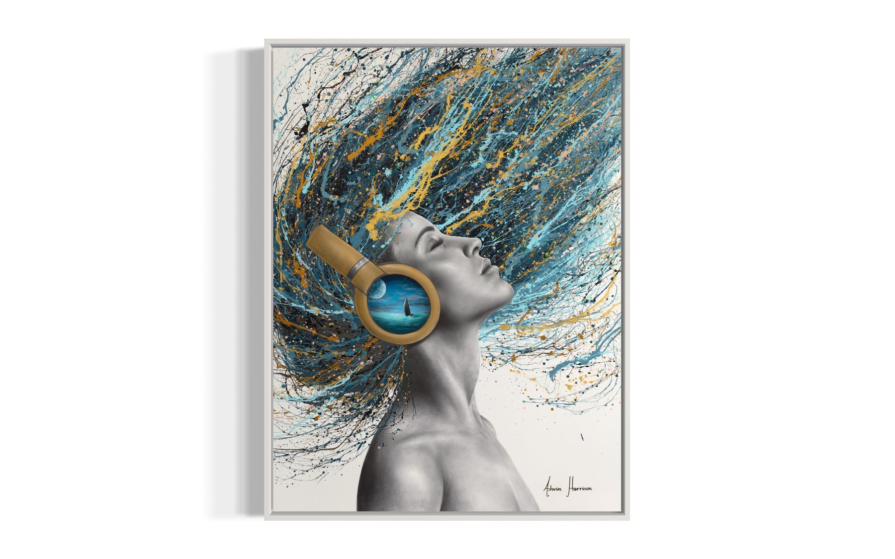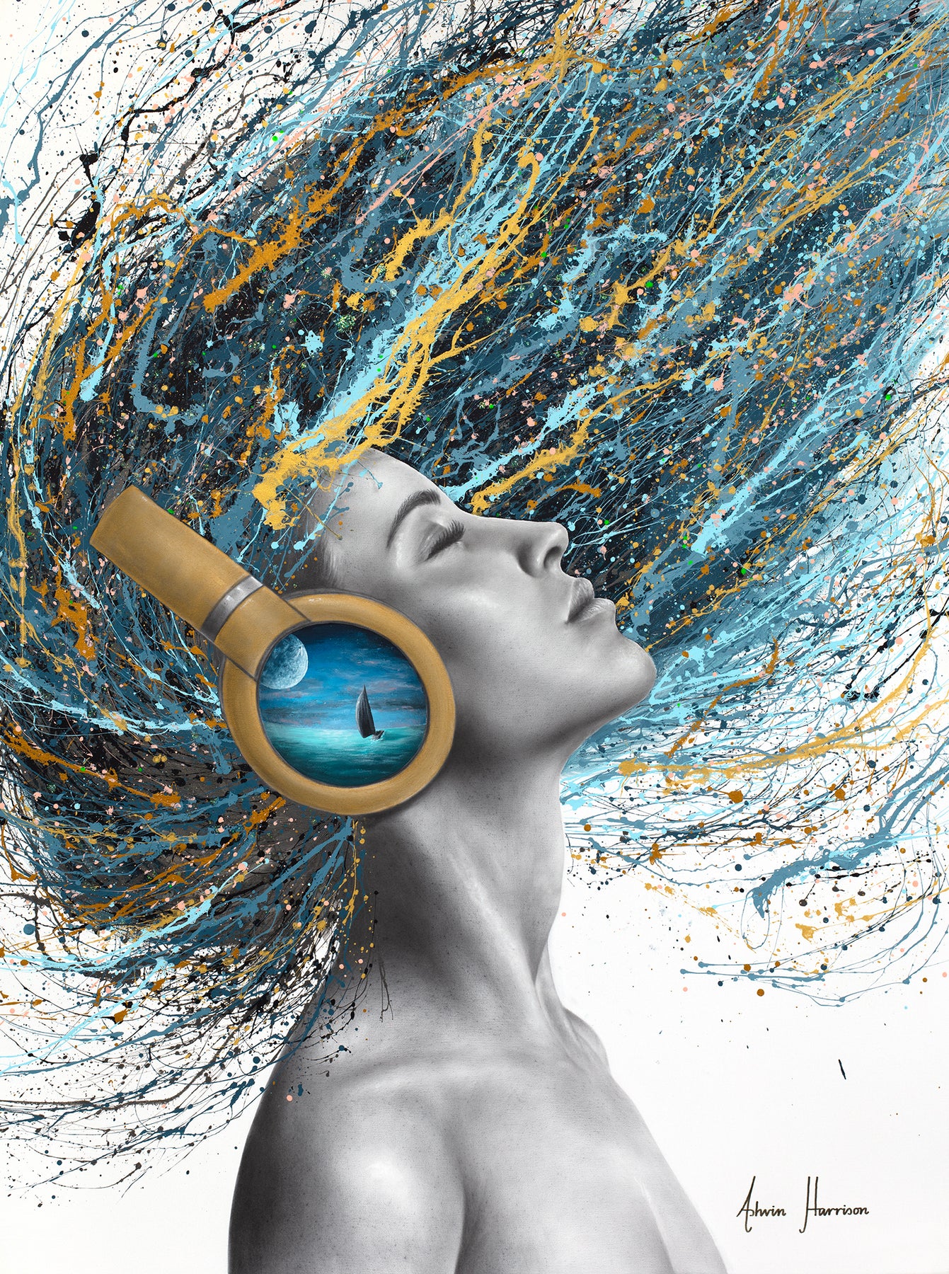woman side profile face in black and white wearing gold headphones with sea scene flipping hair back in blue black and gold splatter paint on white background