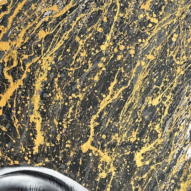 - Hybrid artwork: black and white sections are printed off of the charcoal original, all color and acrylic splashes are hand-done by Ashvin Harrison.