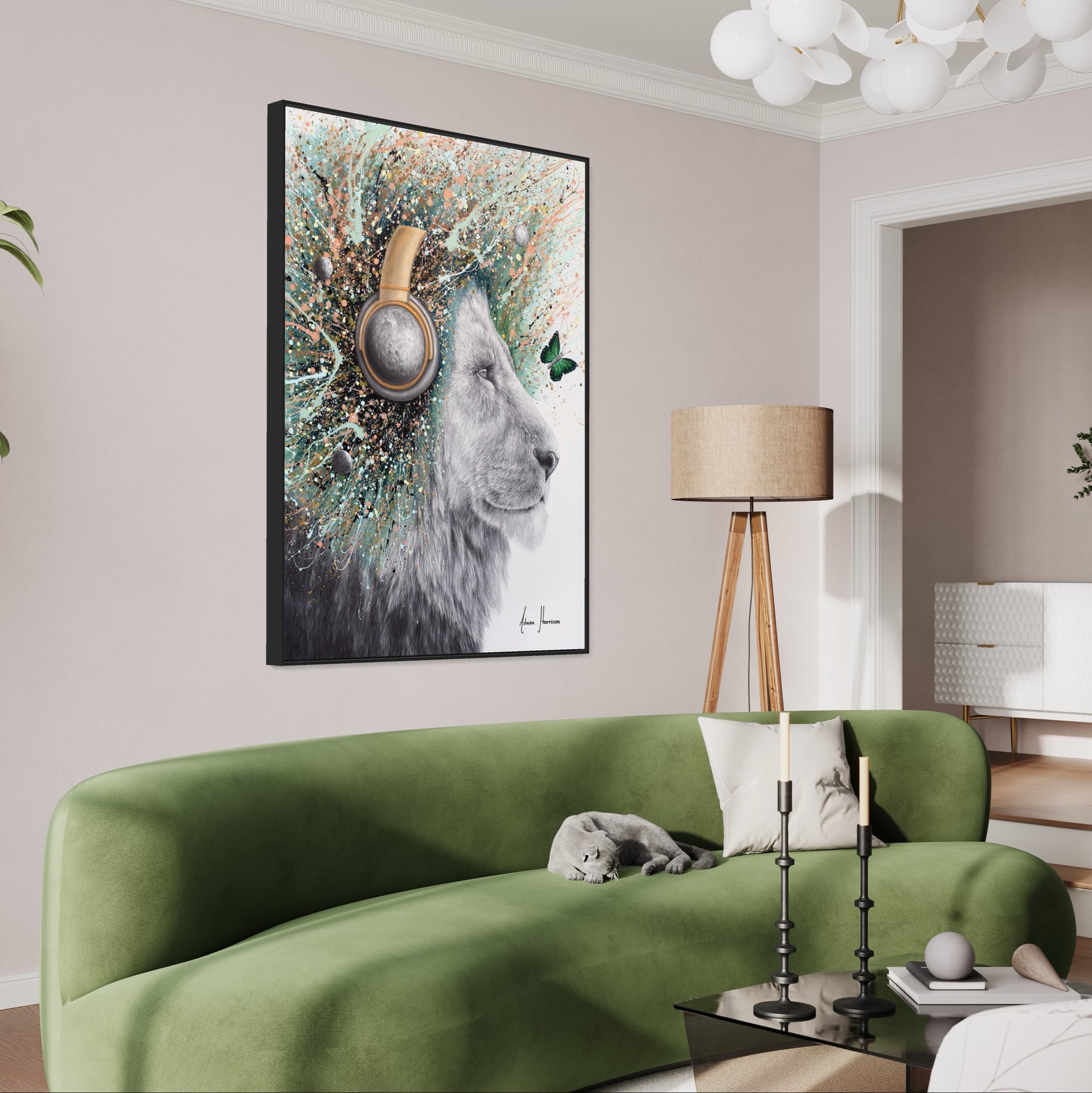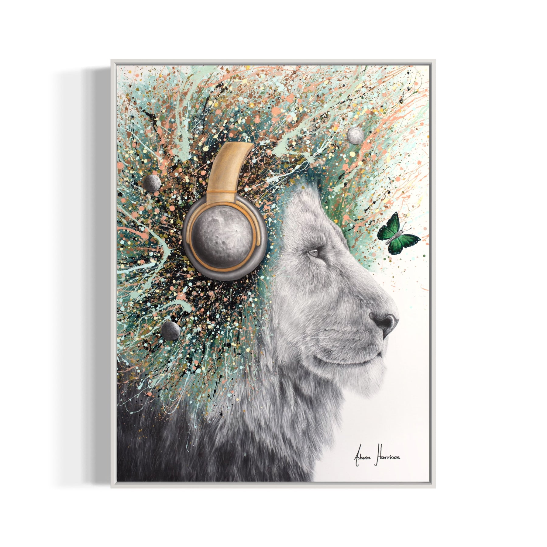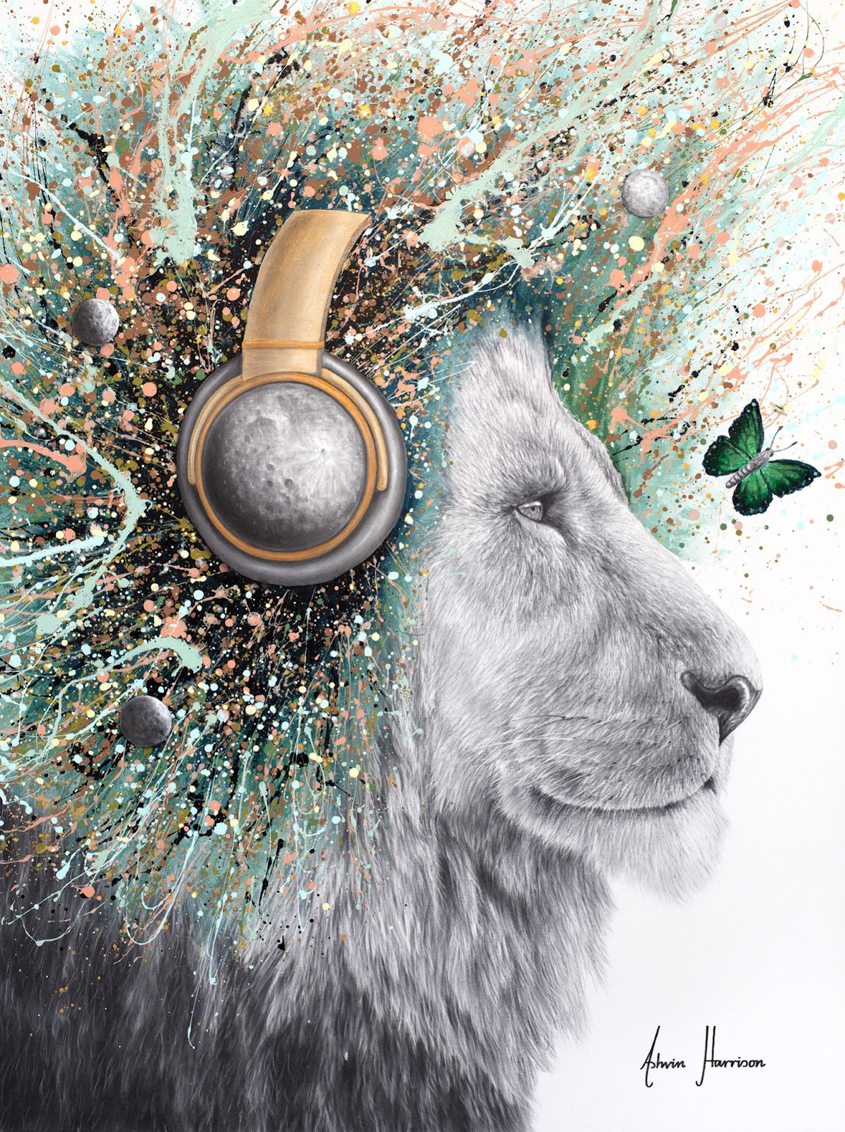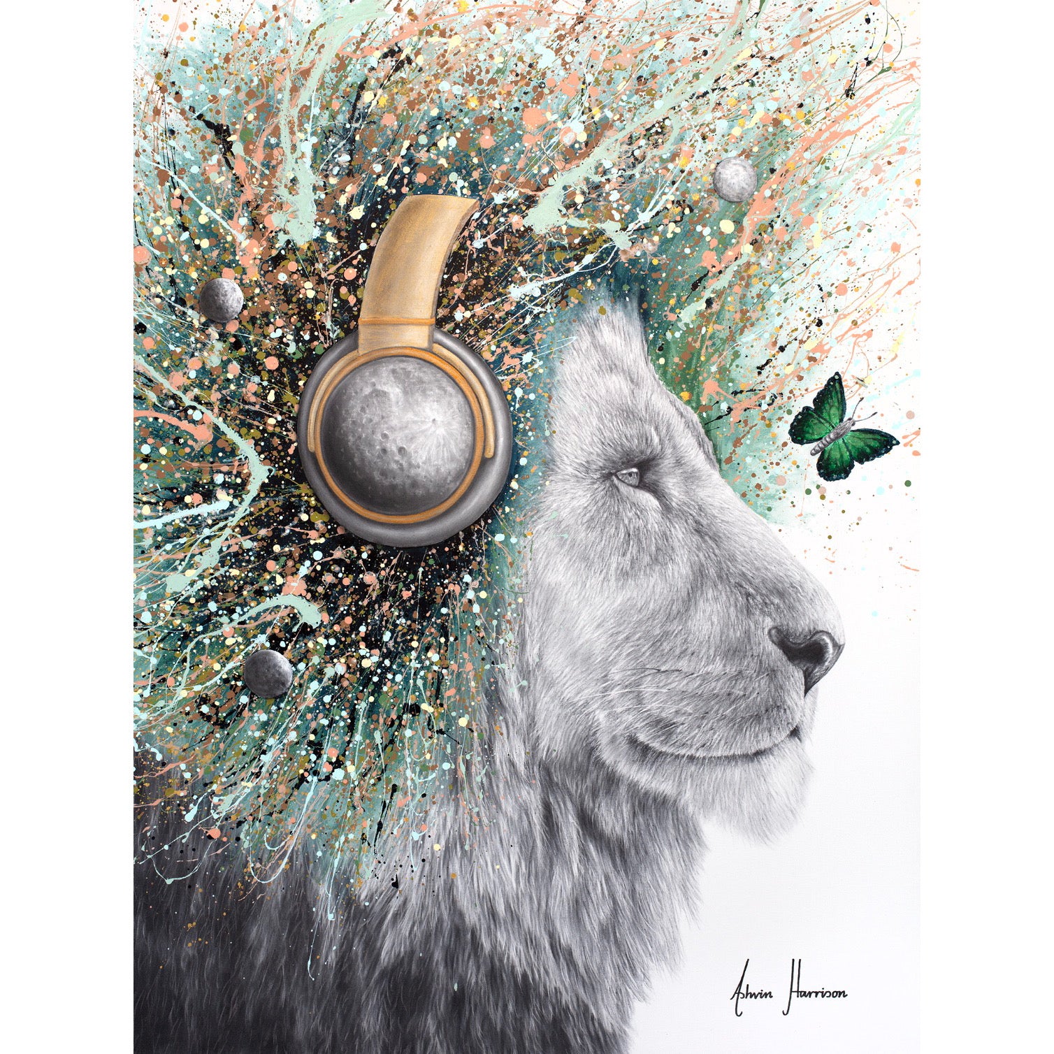 black and white lion in charcoal looking to the right wearing moon headphones and splattered lions hair mane and small moon illustration in teal blue pink pastel acrylic splashes and green butterflies on white background