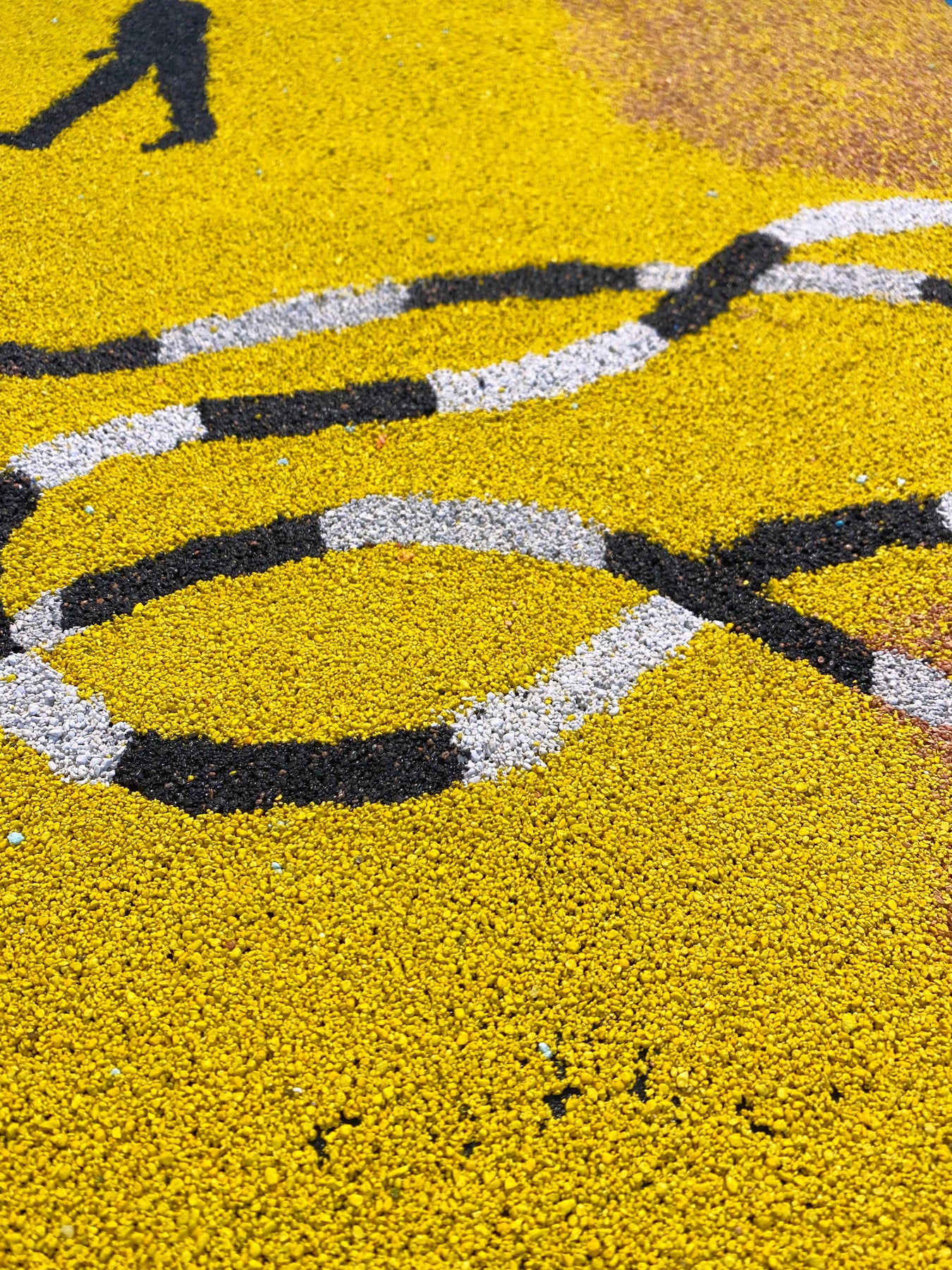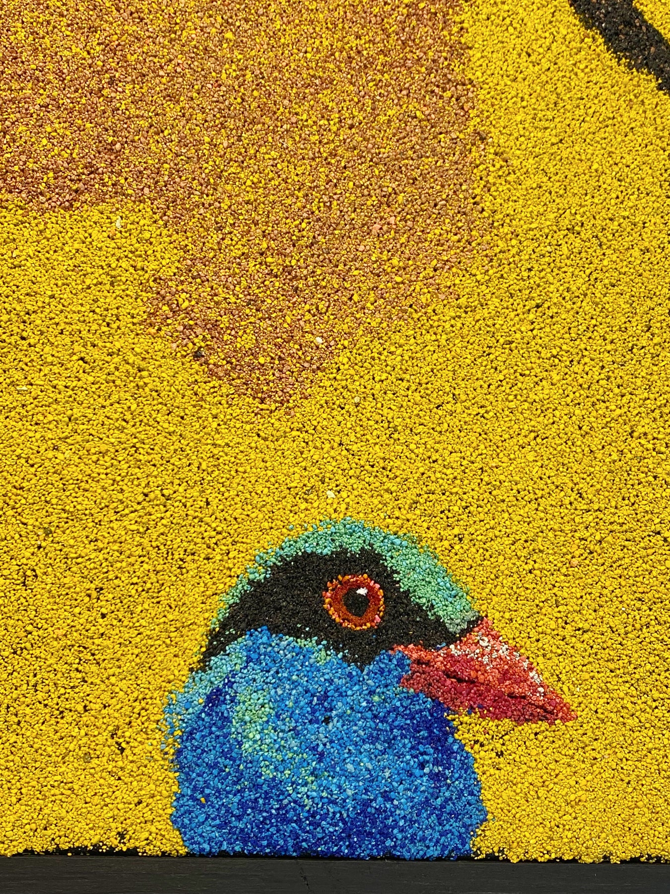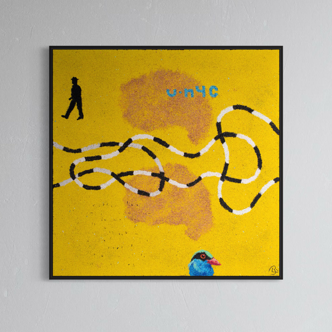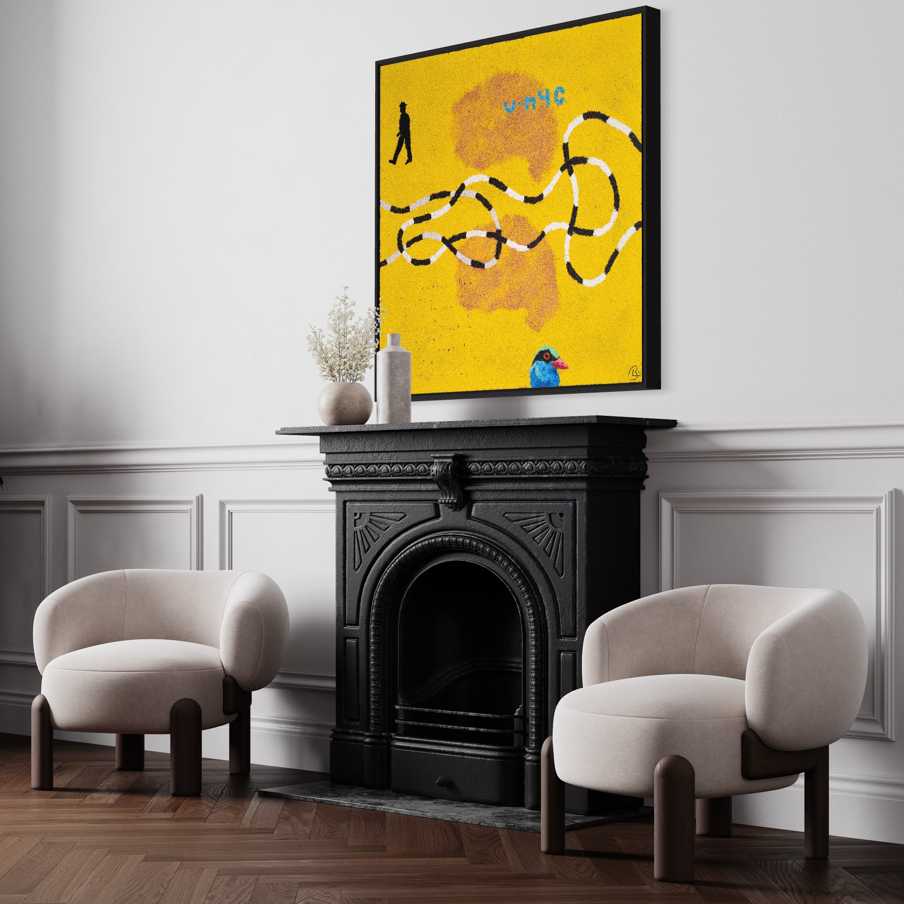 Bingo Bombard by Bob Lanstrom. Yellow pigmented volcanic rock on canvas, abstract artwork featuring a blue bird and a gentleman walking.