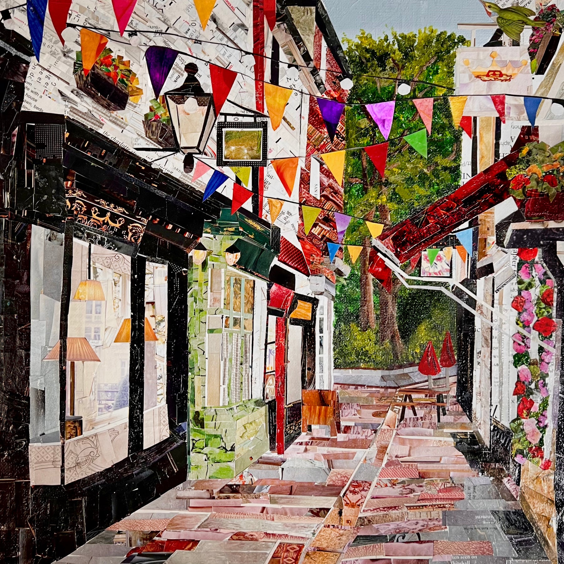 Chrissy McIntyre is a mixed media and collage artist specializing in intricate, photorealistic (yet quirky) compositions using hand-cut magazine paper. Her work began with a spontaneous collage experiment that evolved into commissioned pet portraits and expanded into her Travelogue series, inspired by her personal travels and photography. Each piece is meticulously crafted, layering tiny squares of paper to create depth and realism. Drawing influence from artists like Warhol, Lichtenstein, Chuck Close, Mark Herald, and Peter Clark, her work merges pop art energy with a unique, textural approach to storytelling through collage.