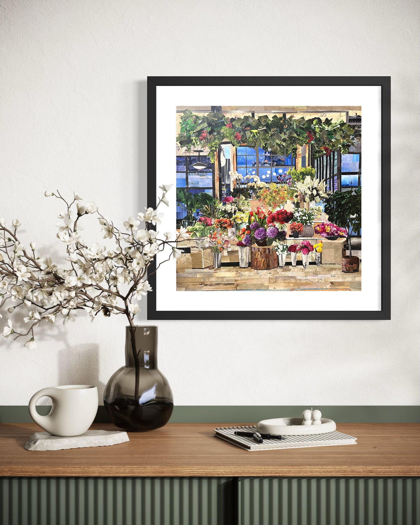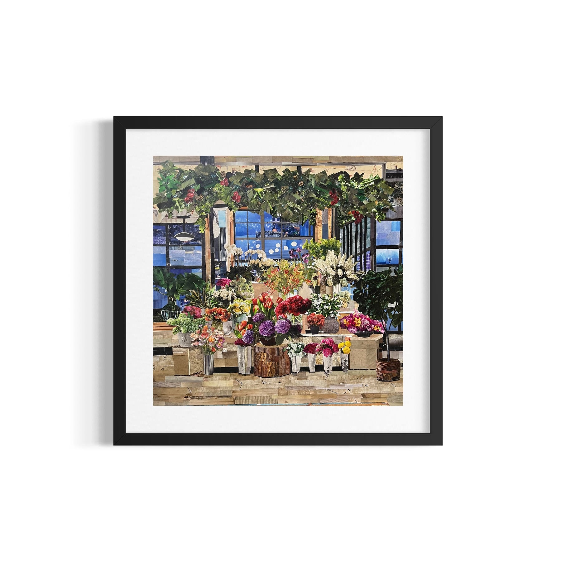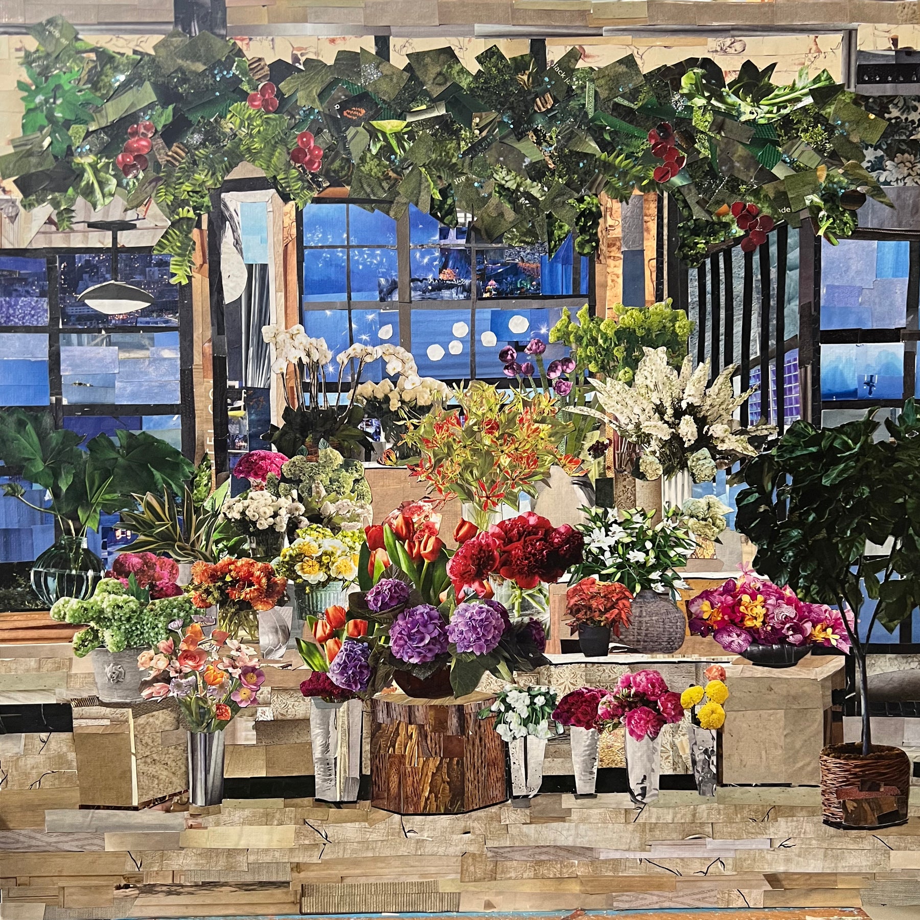 magazine cut paper collage art floral bouquets leaves in pinks purples and greens inside flower shop window