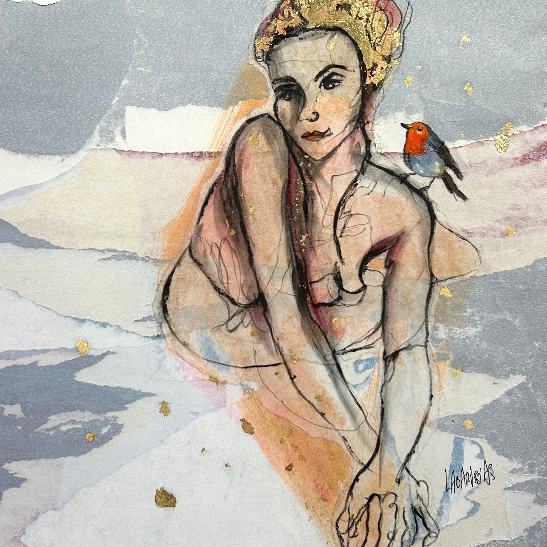 French figurative artist Corinne Labarussias seeks to reveal human desire and form in her delicate watercolor, charcoal, and gold leaf nudes. These totally unique romantic portraits offer a lens of distortion that resists convention. Her characters are erotic and psychological, beautiful and raw. Labarussias conceives of her drawings as a spontaneous dance, with rhythm and movement, captured in a moment, then frozen in time. Her use of recycled materials like old magazines and handmade paper texturize her work in a powerful multi-dimensional way.