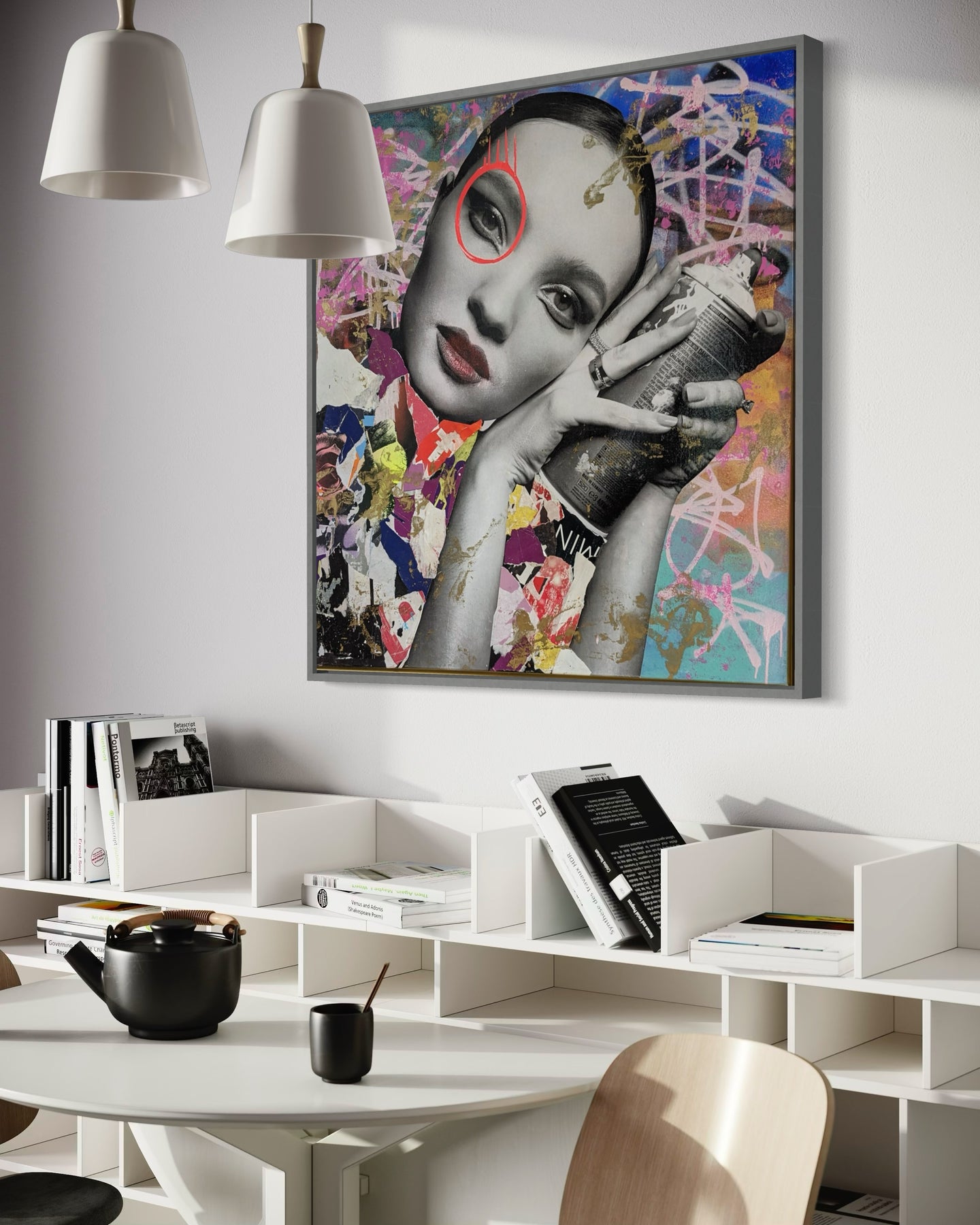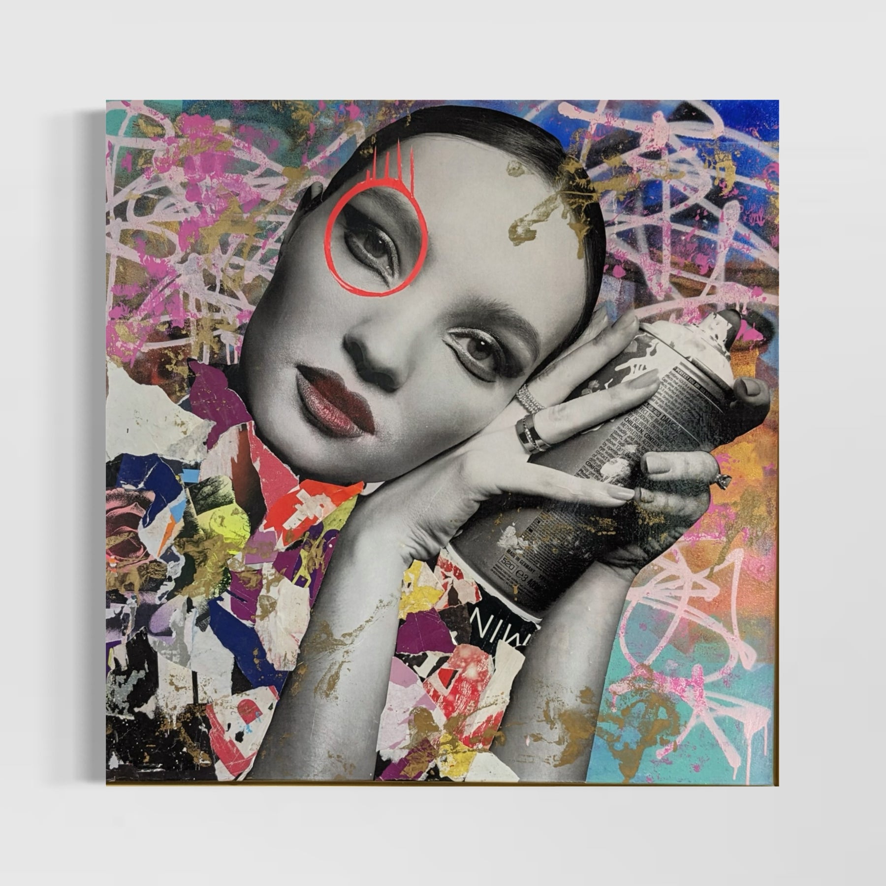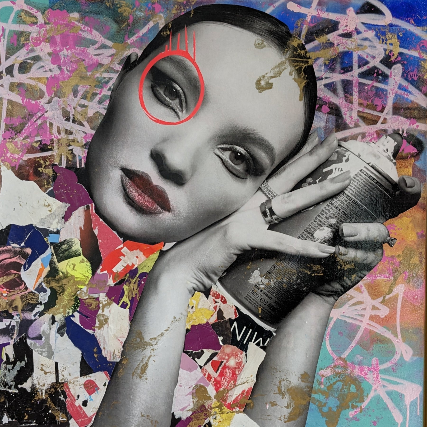 36" x 36" Acrylic paint, spray paint, wheat-paste, vintage advertisements, printed fragments on canvas. Woman posed with a paint can surrounded by colorful graphics with DAIN's signature circle around her left eye.