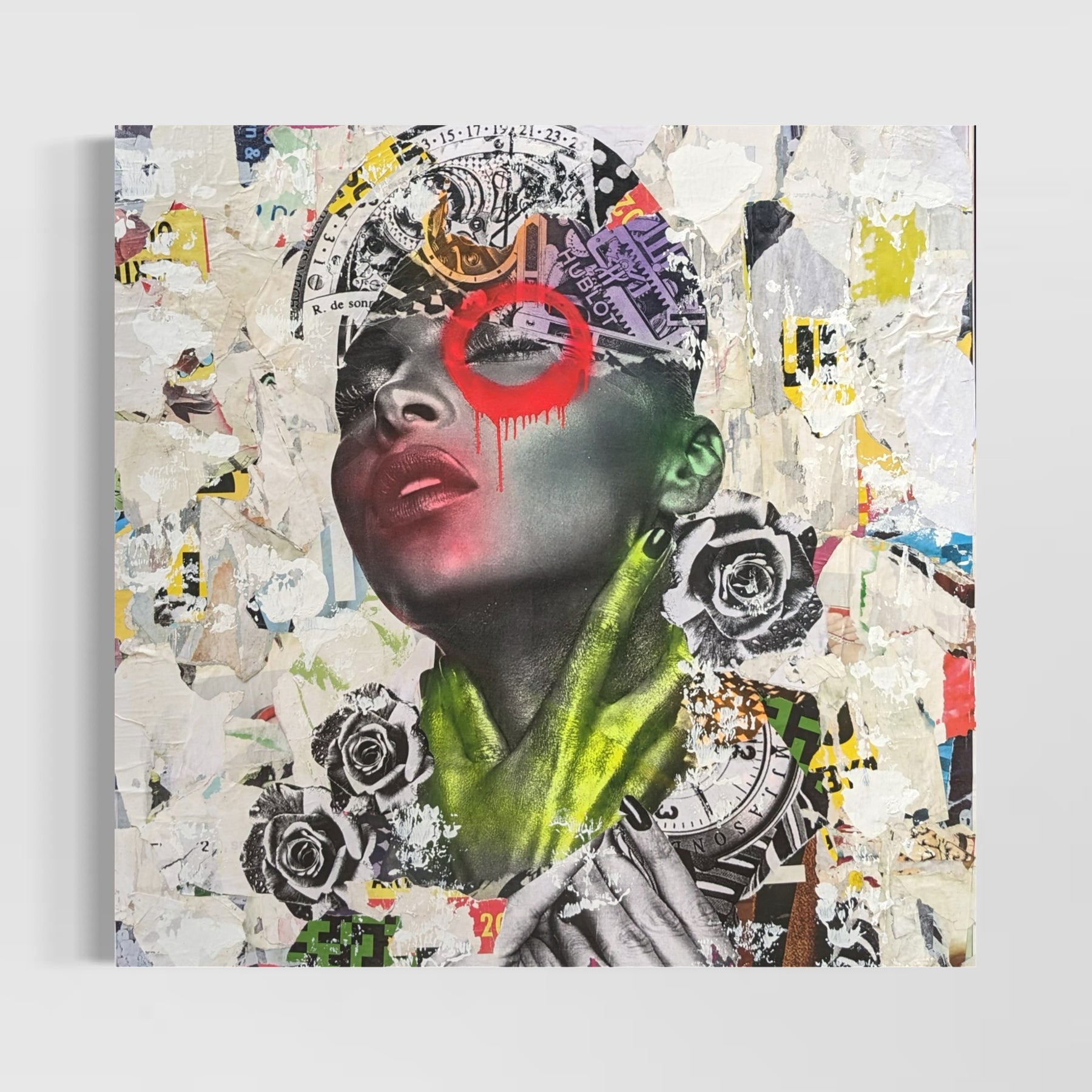 48" x 48" Acrylic paint, spray paint, wheat-paste, vintage advertisements, printed fragments on canvas. Woman's face surrounded by graphic paper cutouts with DAIN's signature circle over her right eye.