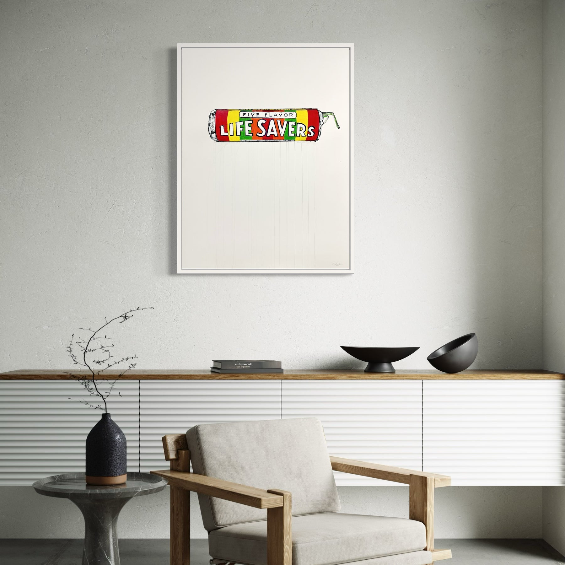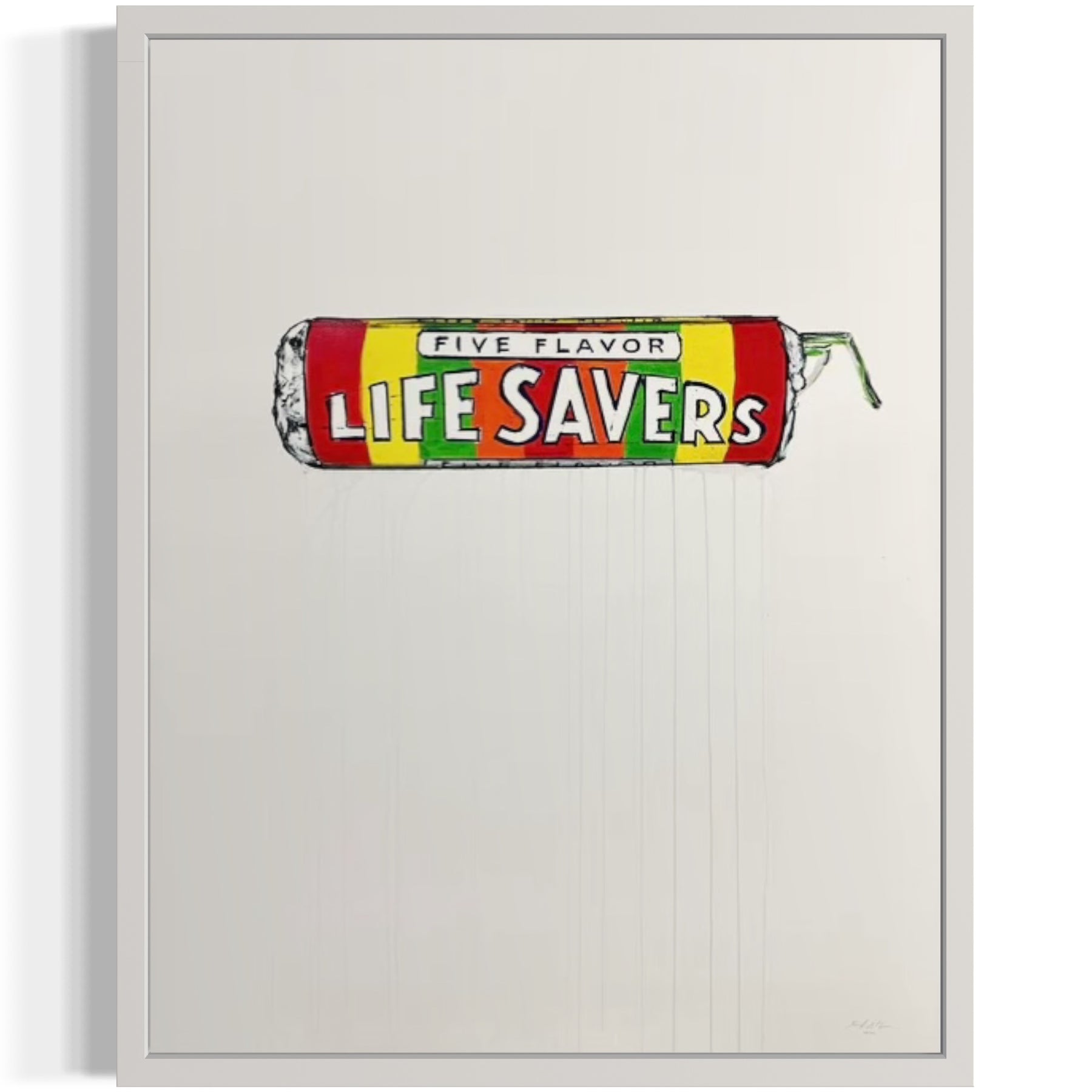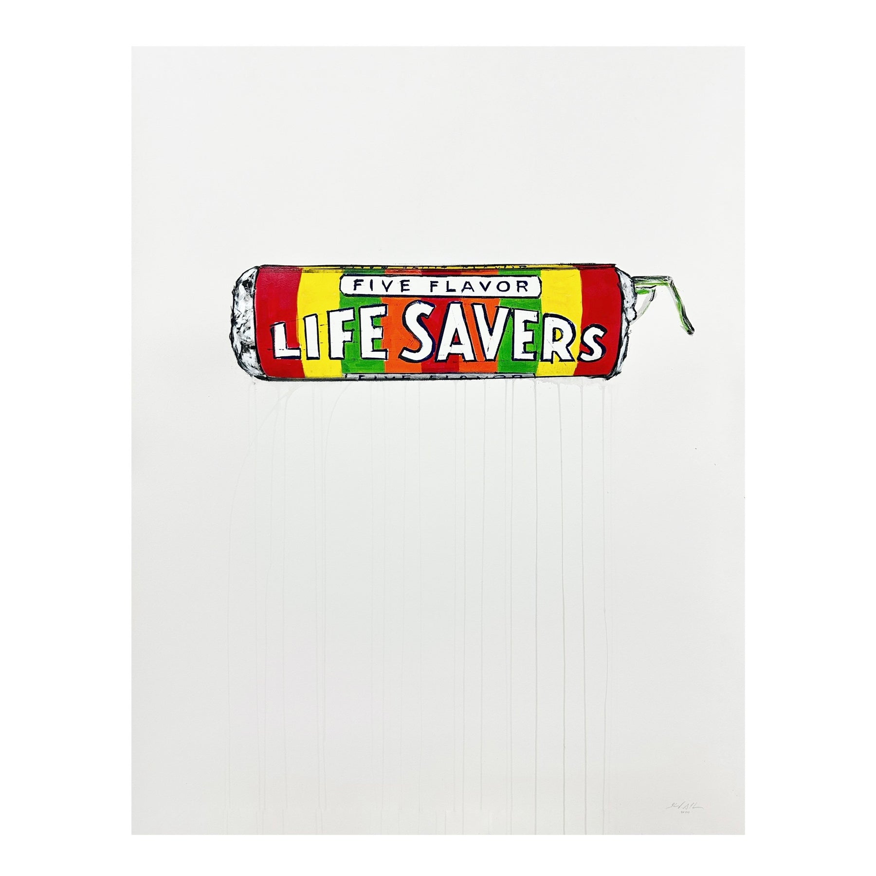 graphic life savers candy drawing in charcoal with red green orange and yellow dripping down blank white background