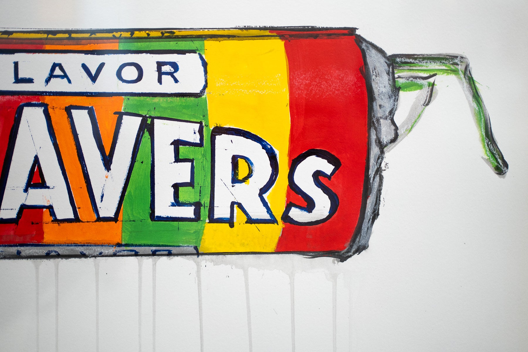 As a form of commentary on cultural recognition, ubiquity, and community, Cabrer elevates popular culture and symbols to the level of contemporary fine art. For example, the artist paints minimalist retro candies such as Life Savers, Bazooka Bubble Gum, and Blow Pop Lollipops with distinct patterns, bold colors, and texture. Using acrylic on panel, Cabrer paints with strong, dark lines and tropical colors, situating recognizable symbols in a white, raw space that sits on the flat surface of the panel. Cabrer engages with a conceptual approach to nostalgia of the 80s and 90s, repositioning popular culture and framing the memorabilia to be seen in new and unique ways. He sits within a line of contemporary greats, such as Andy Warhol of the Pop Art movement, using icons to reflect on social processes.