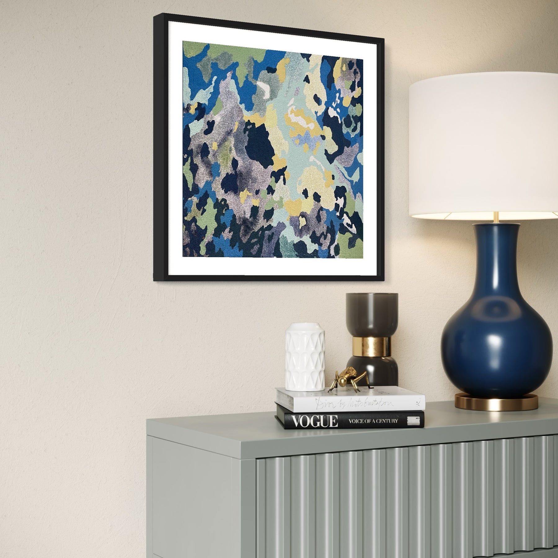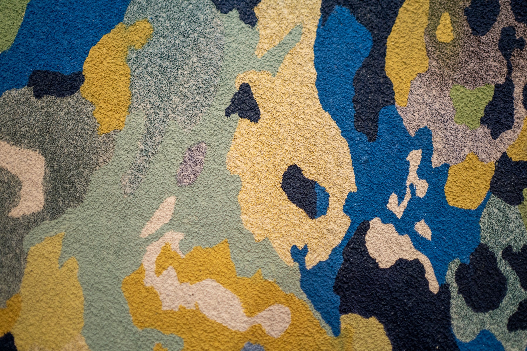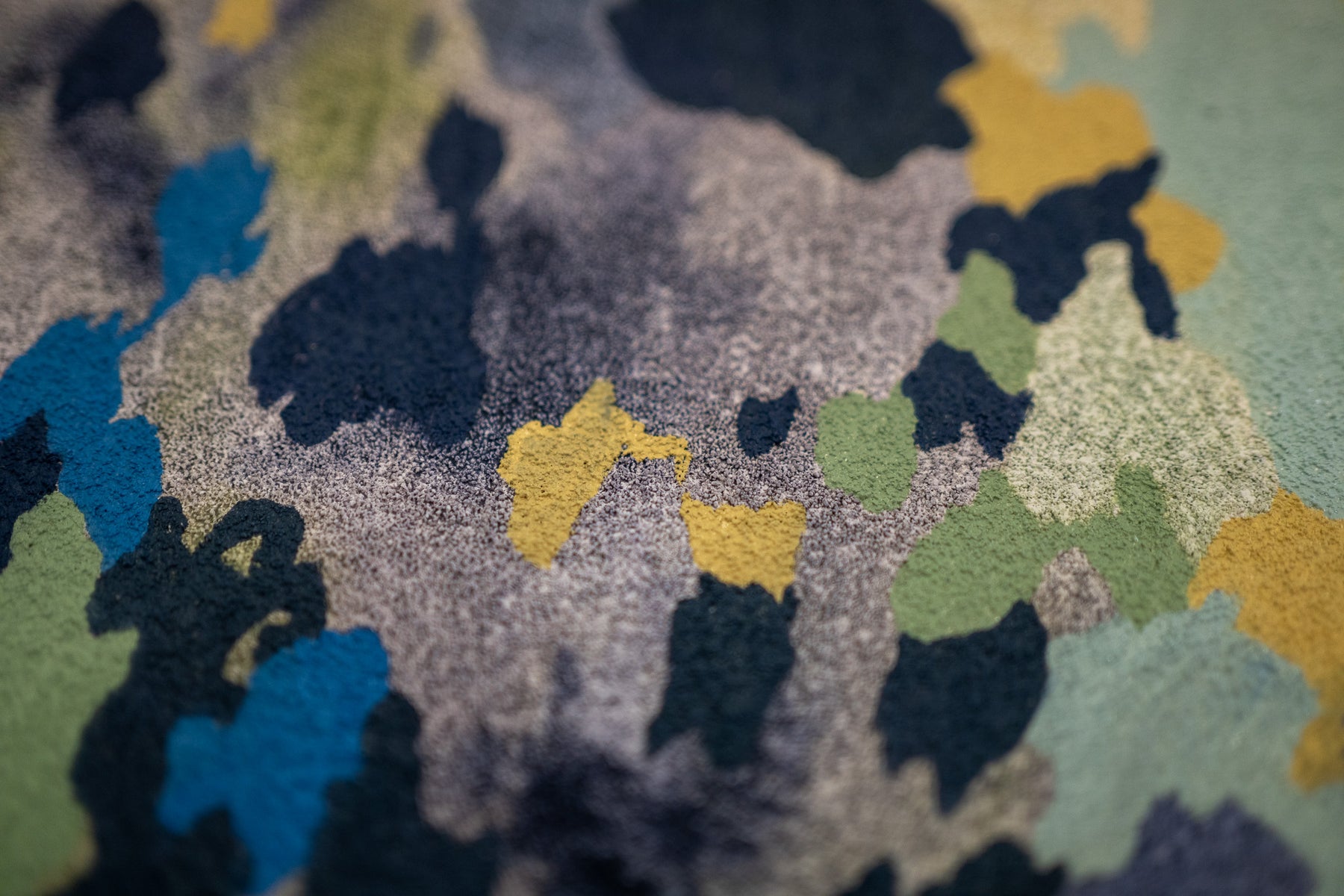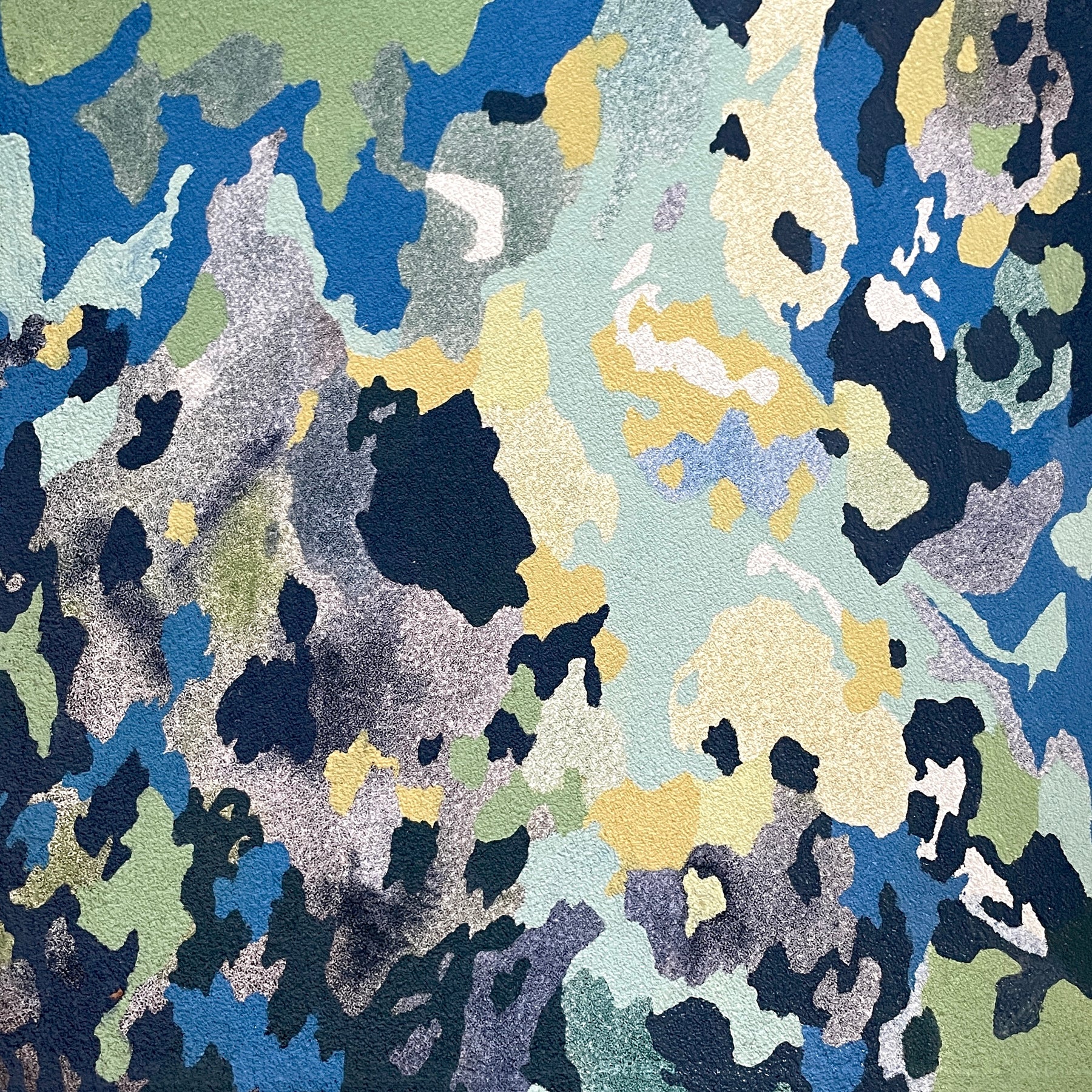 abstract shapes in blues greens and yellows resembling tree bark texture on pumice with oil paint