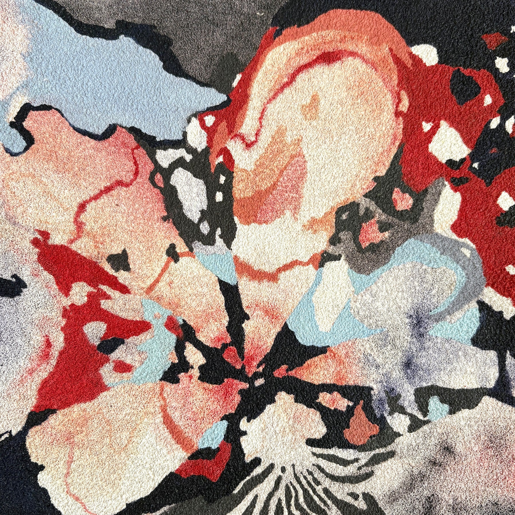 abstract floral shape organic roots fields of color linework and gradient in blue orange and red on pumice in oil