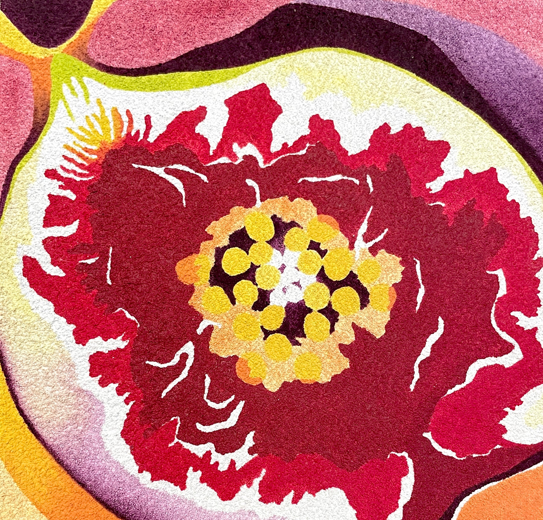 Erin Touey’s work straddles the line between abstraction and representation in her new series of pumice-primed canvas oil paintings. Touey utilizes fluid shapes, variation of line weight, non representational color, distortion of perspective, and in this series, the texture of the pumice primed canvas to bring her often tangible subject matter into the abstract realm. With a limited palette consisting only of Phthalo Blue, Cadmium Yellow, and Quinacridone Magenta, Touey challenges herself to mix all of her colors. The white of the canvas is preserved deliberately, the negative space making shapes that sometimes jump forward or fall back.