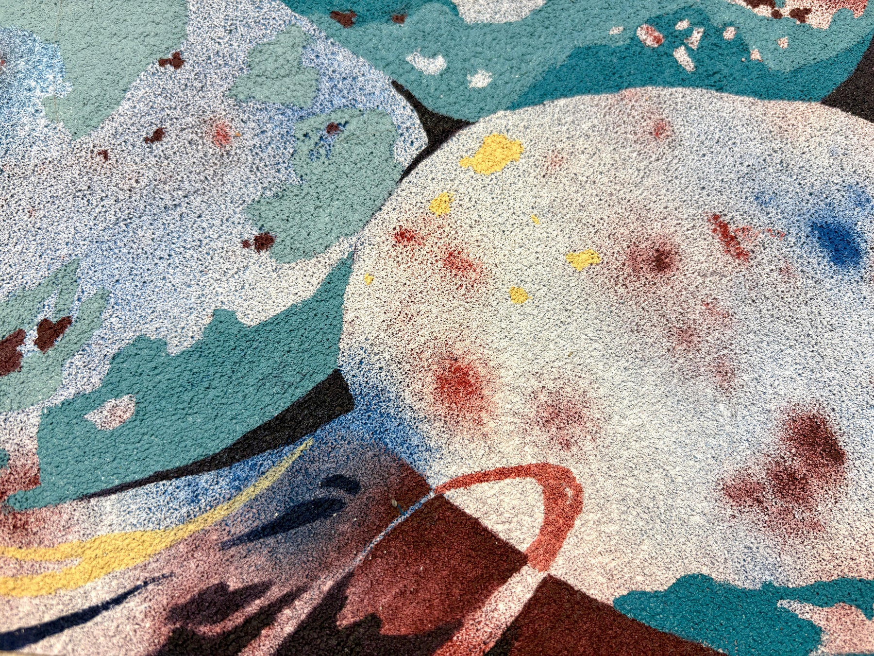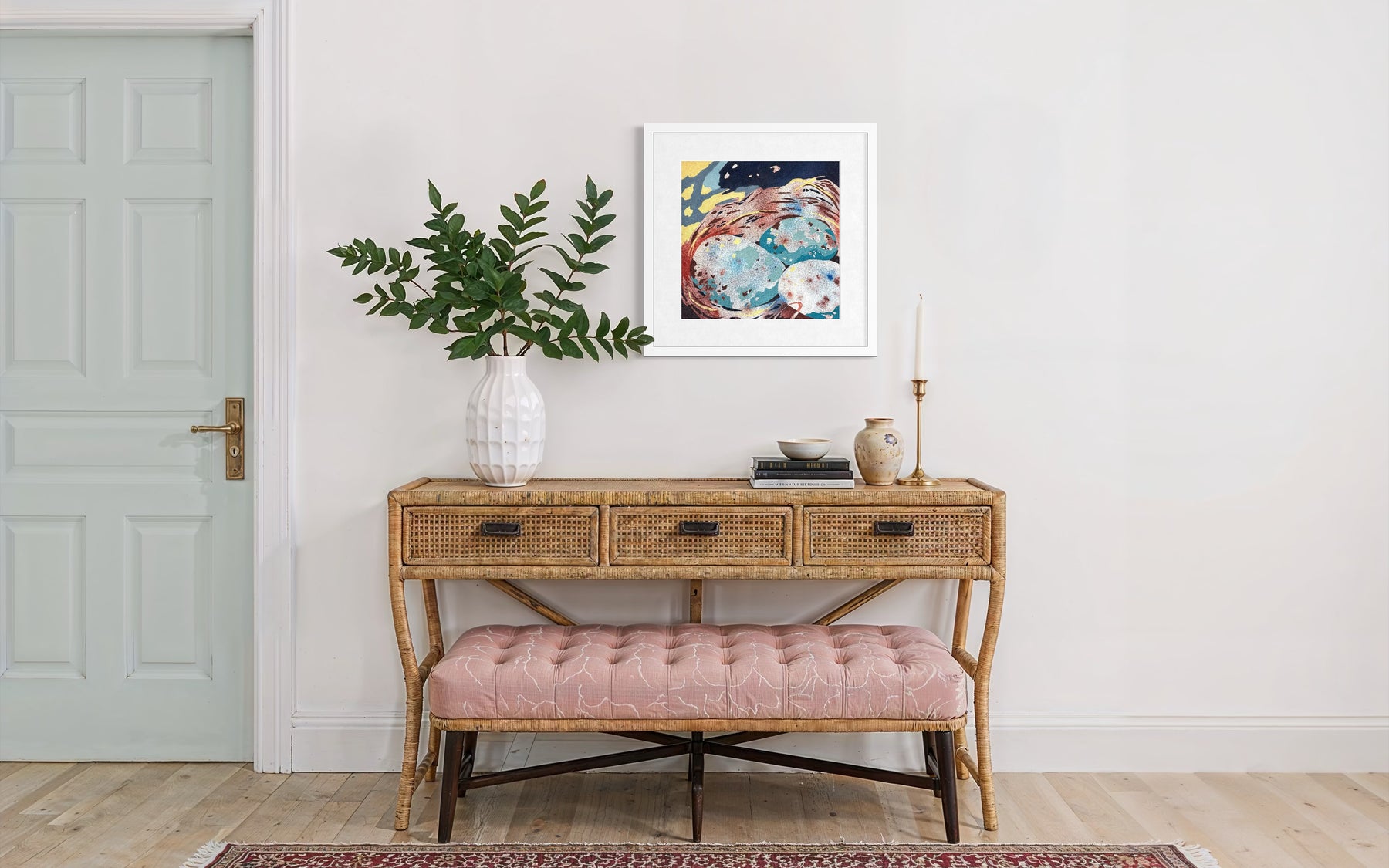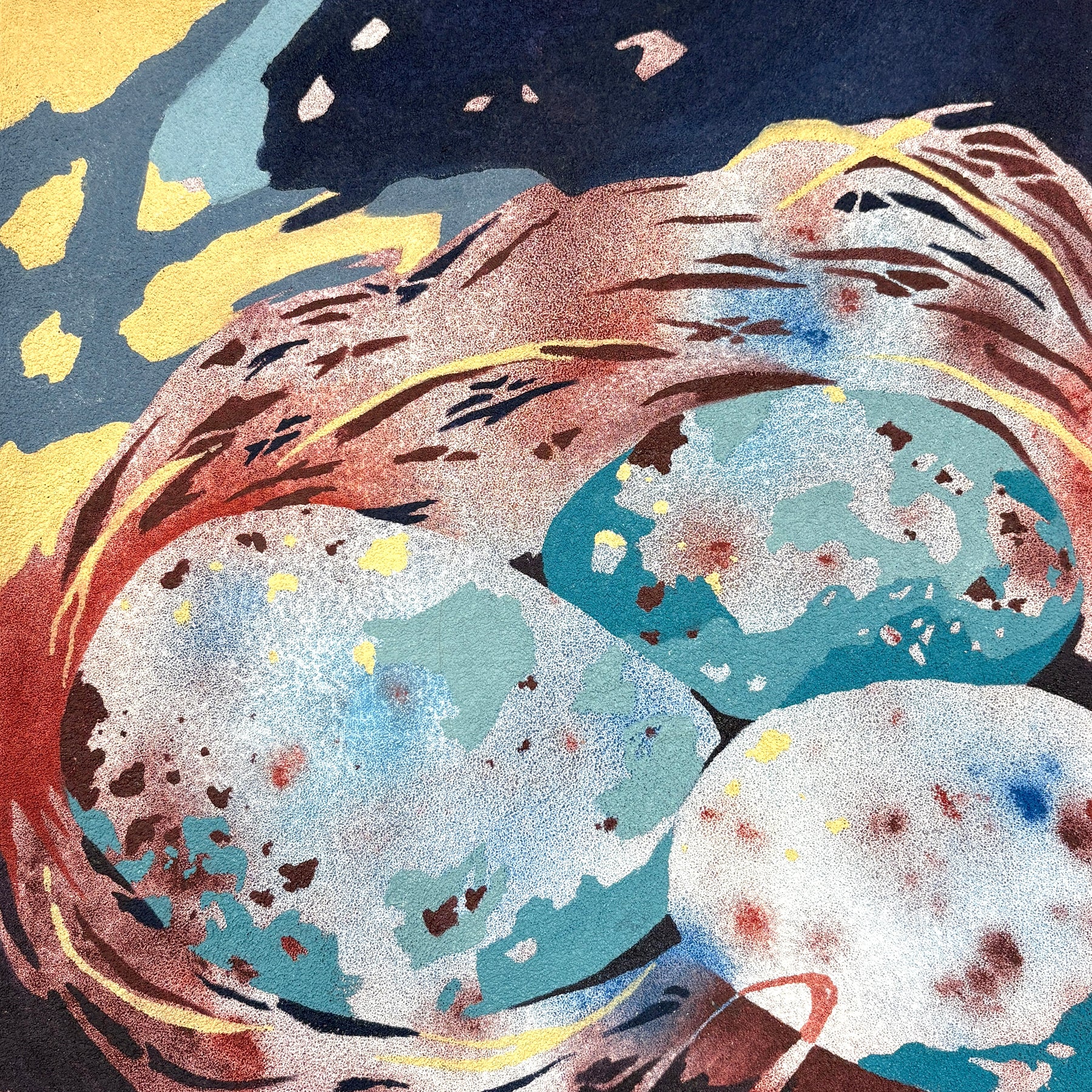 oil on pumice primed canvas abstract organic shapes gradient and opaque speckled eggs in blue and brown in twisted nest
