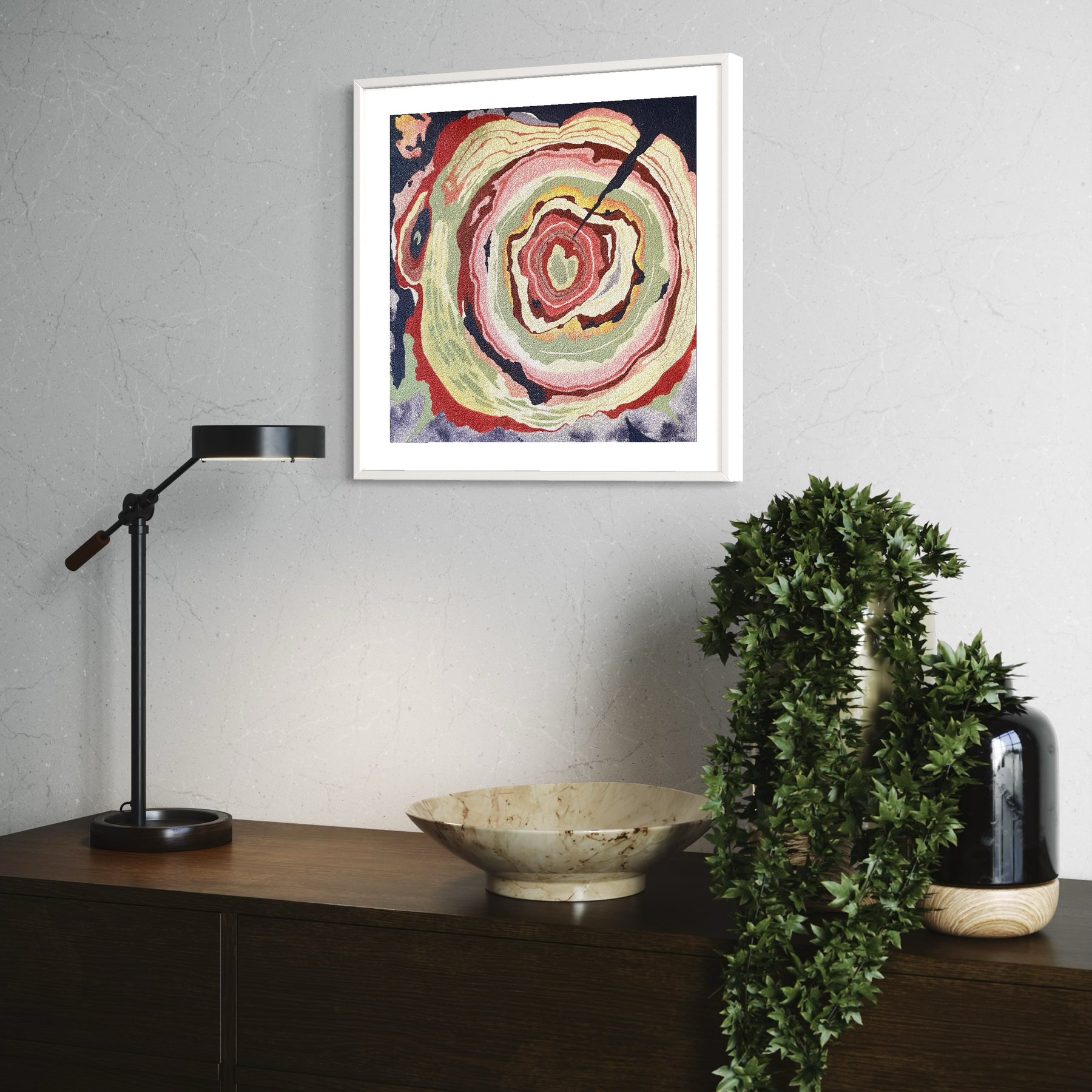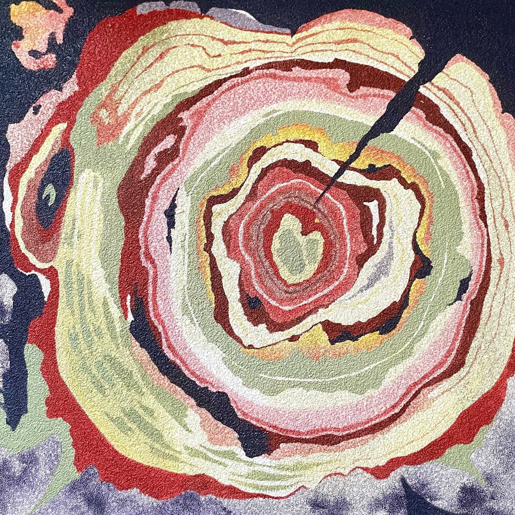 tree trunk rings paitned in orange yellow green and red on textured purple background