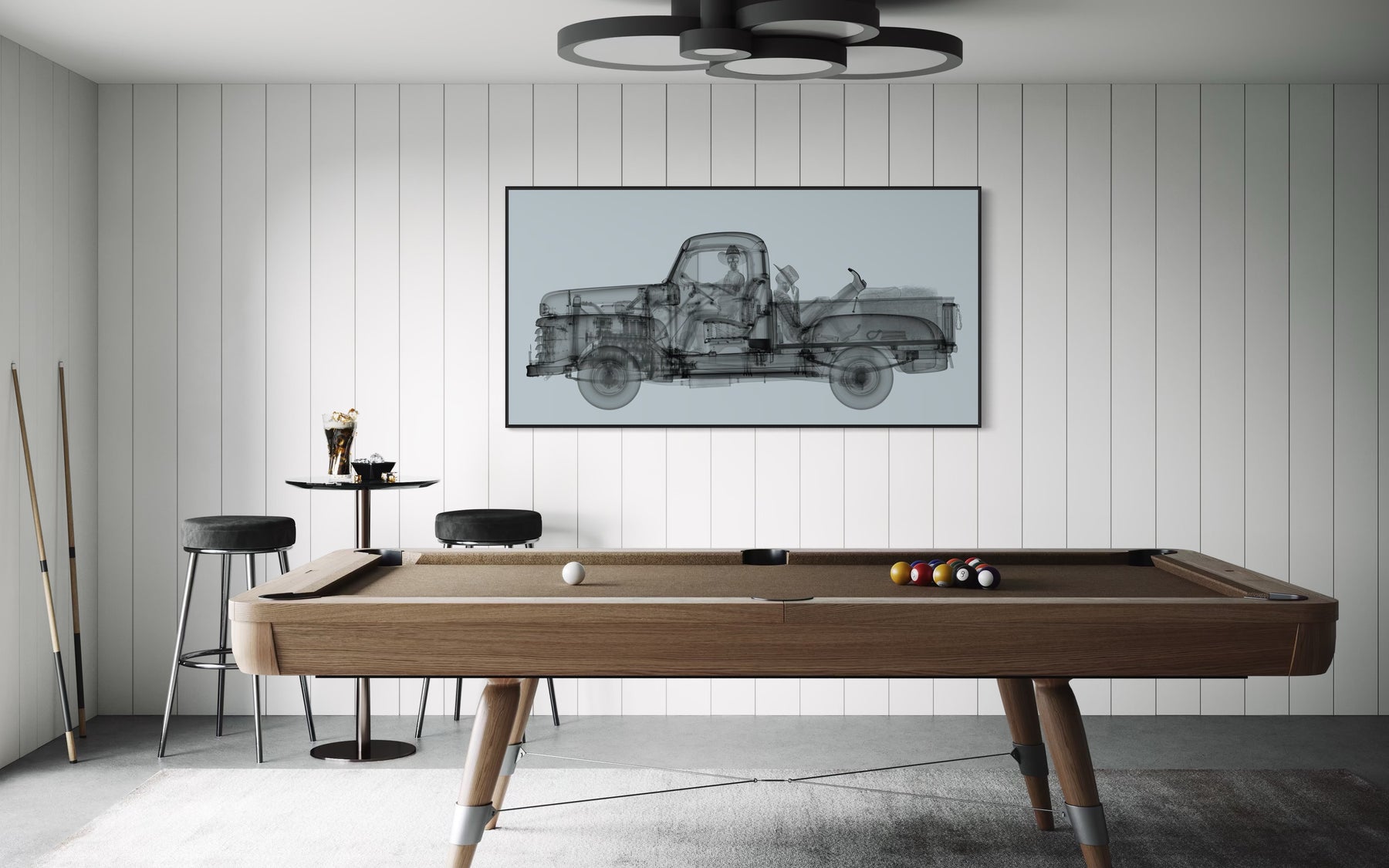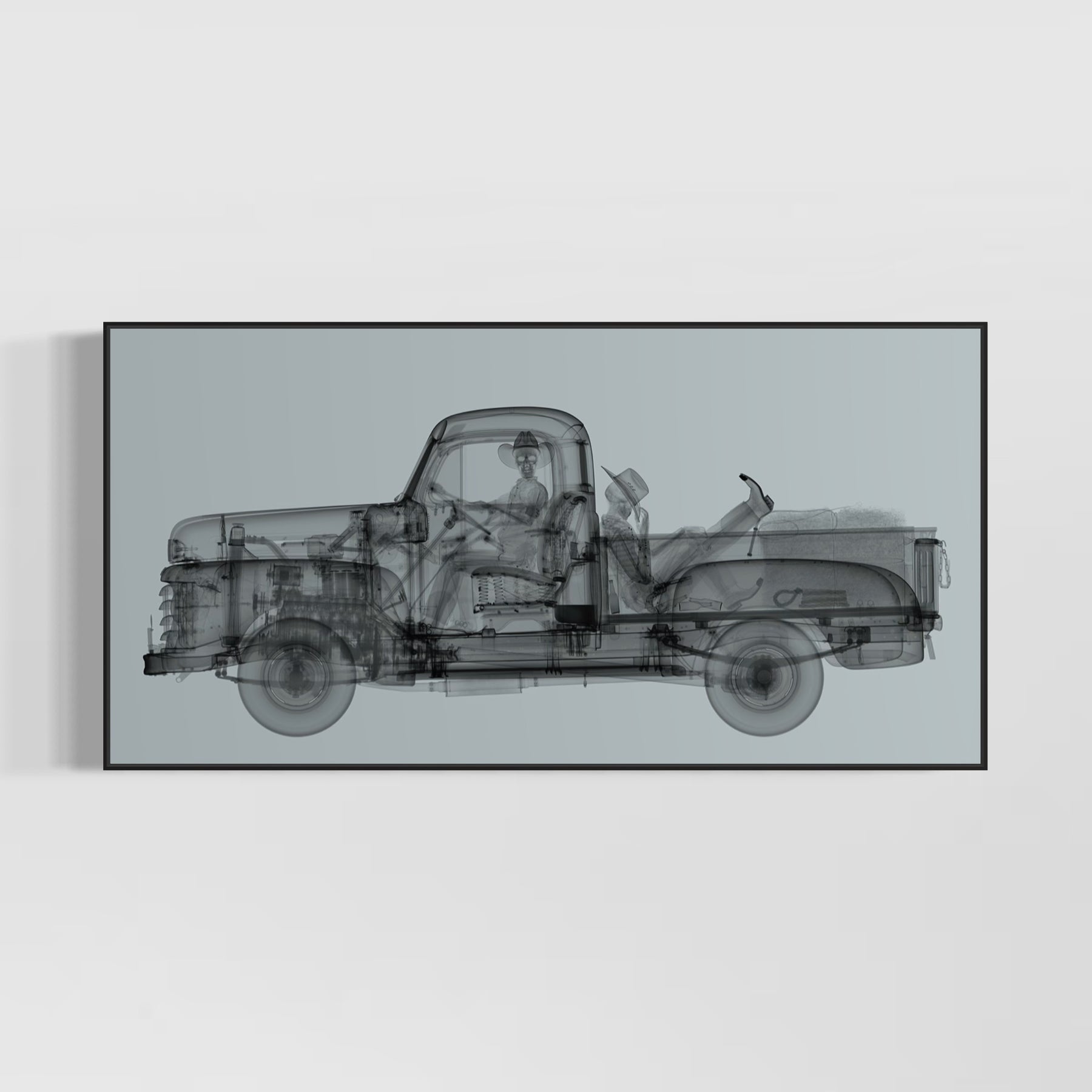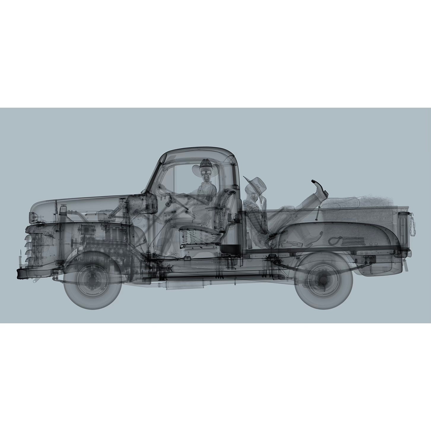 x ray skeleton cowboys in pickup truck interior gears photography in grey and black