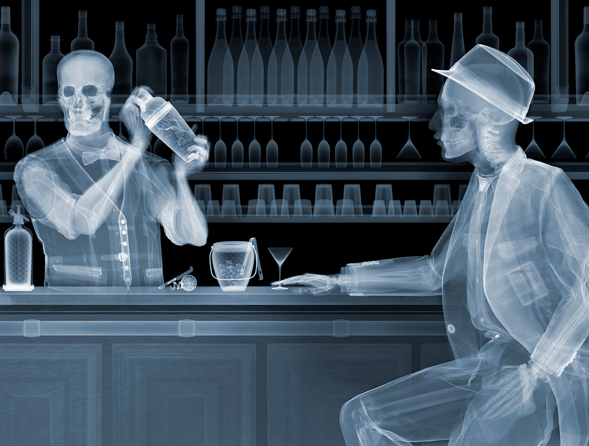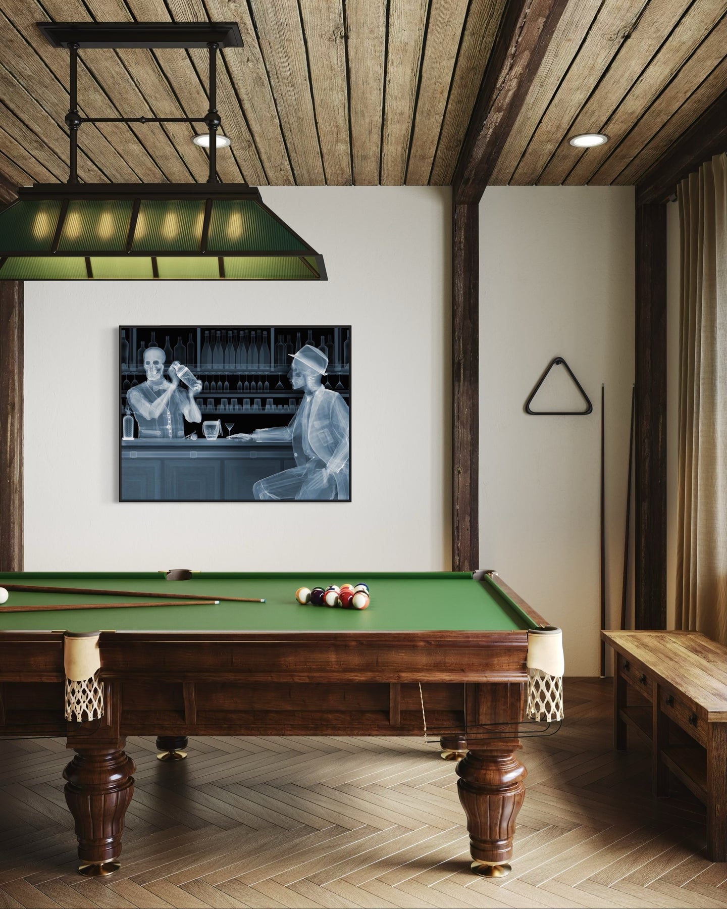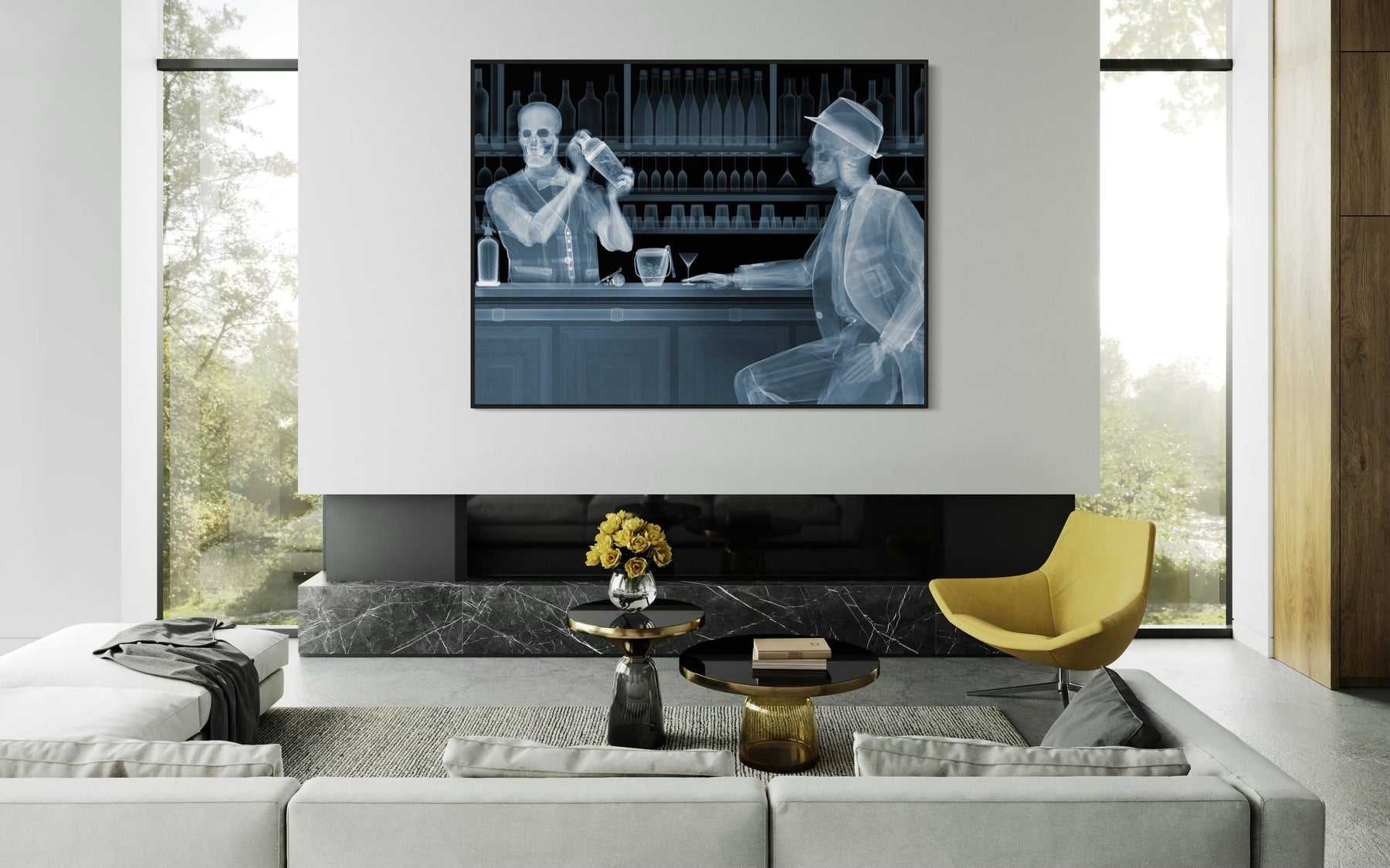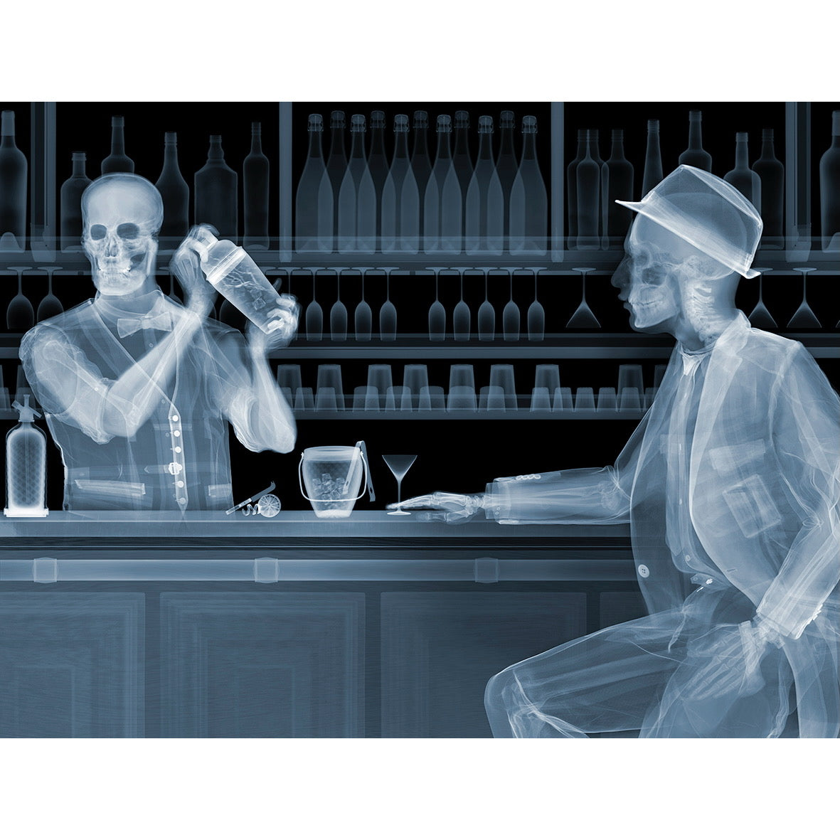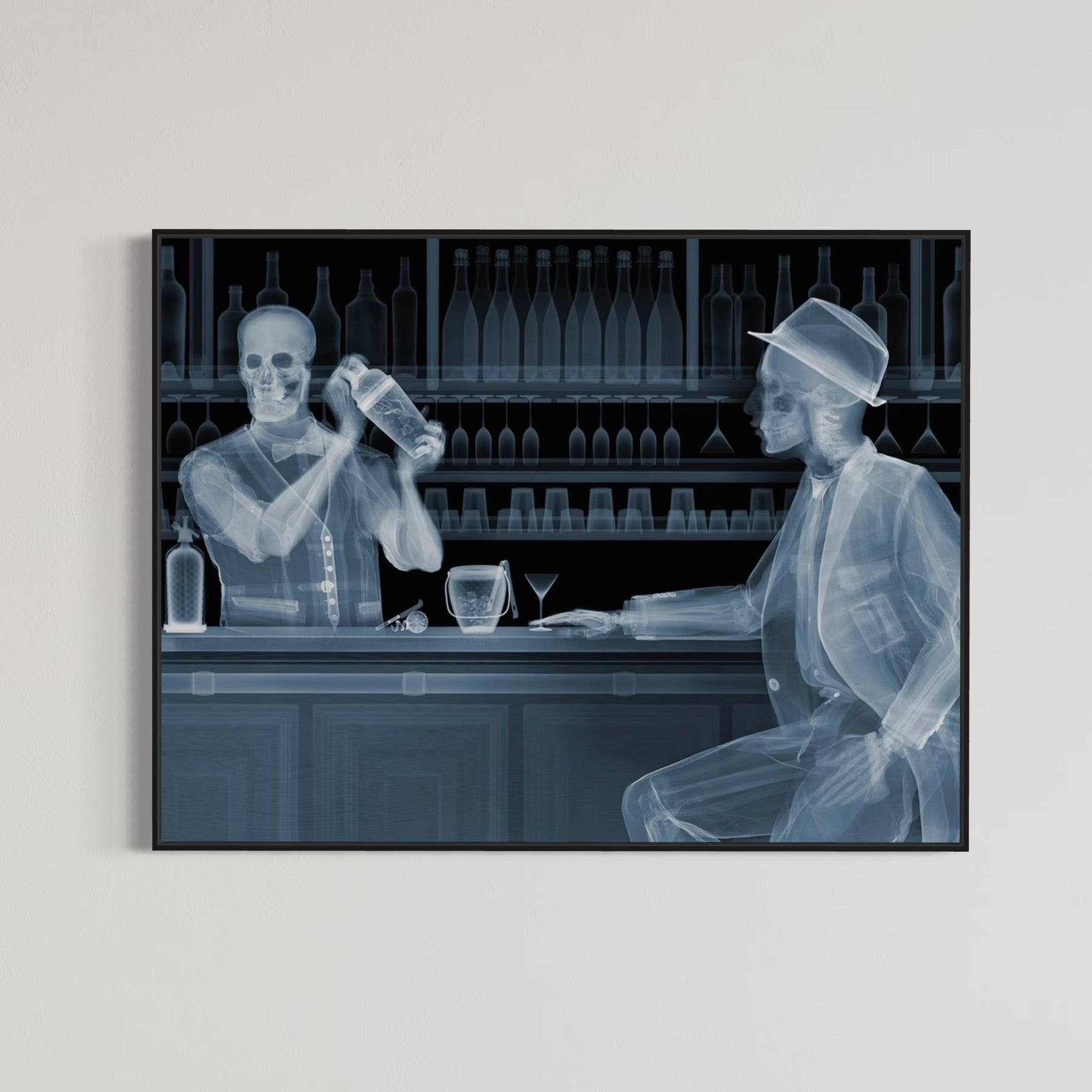 Framed Chromaluxe black and white x-ray photograph by Nick Veasey of two skeletons. A bar tender making a cocktail for a customer sitting at a bar with glasses and bottles behind them