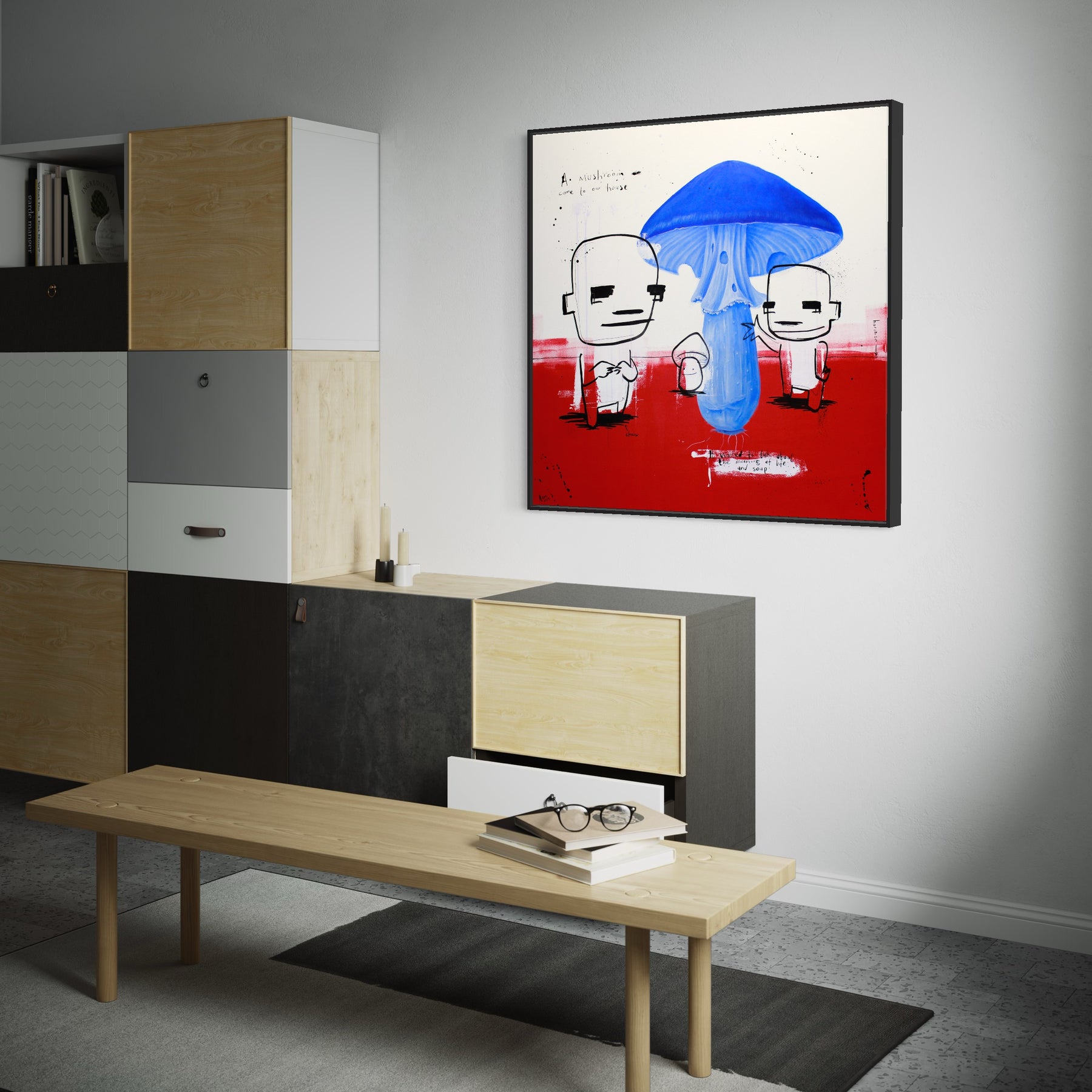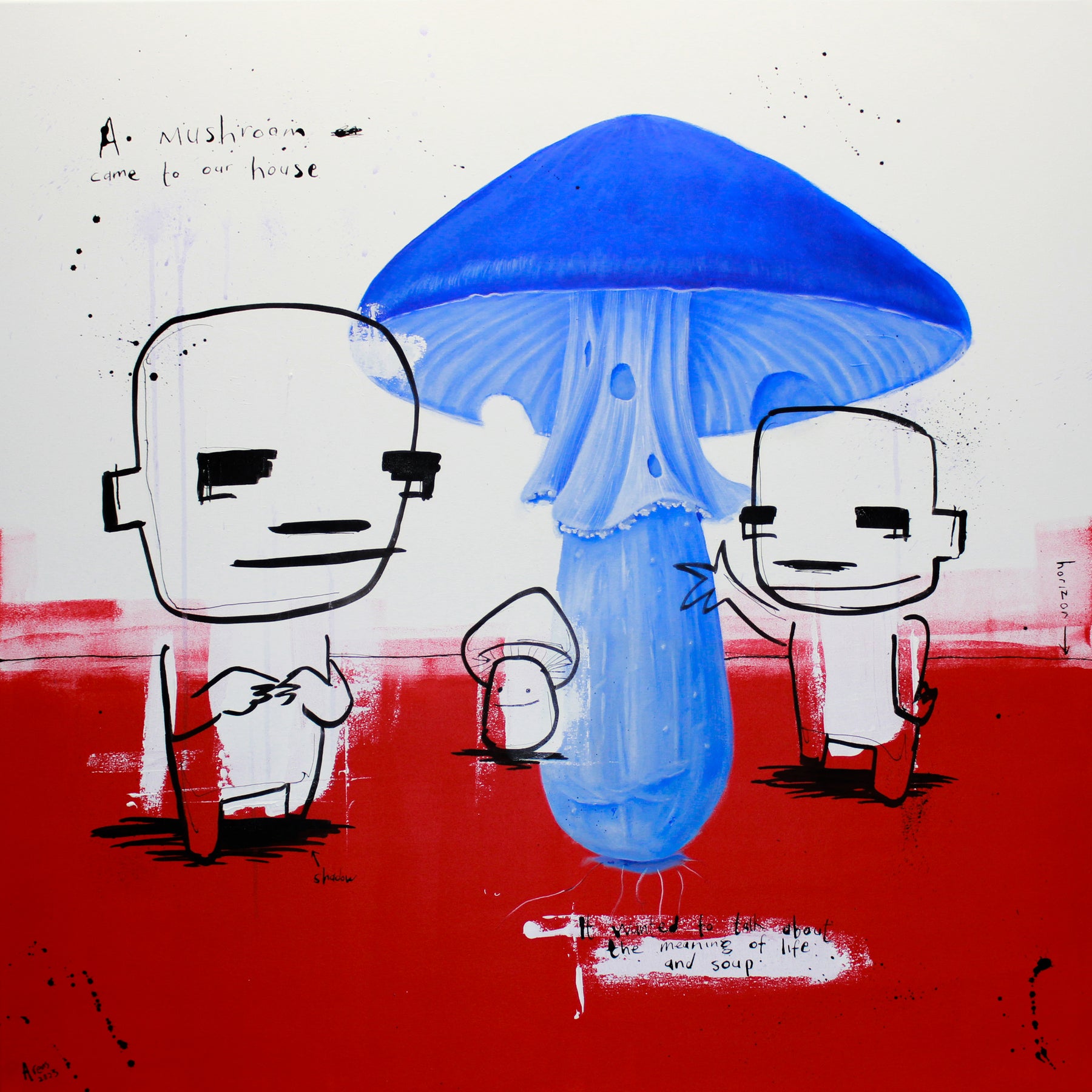 two figures drawn in ink standing beneath photorealistic blue mushroom with doodles and text, satire on red ground and white background