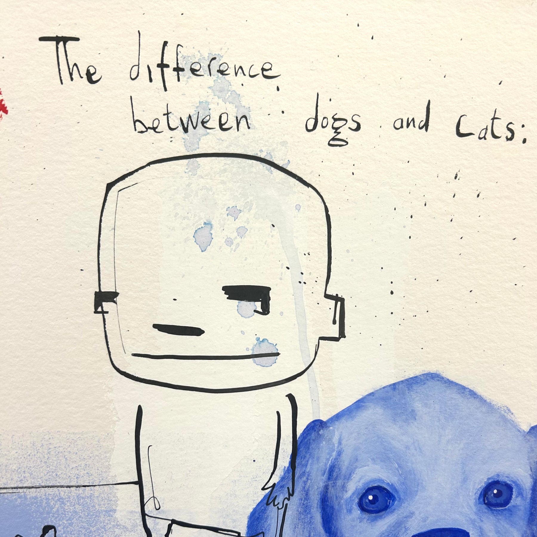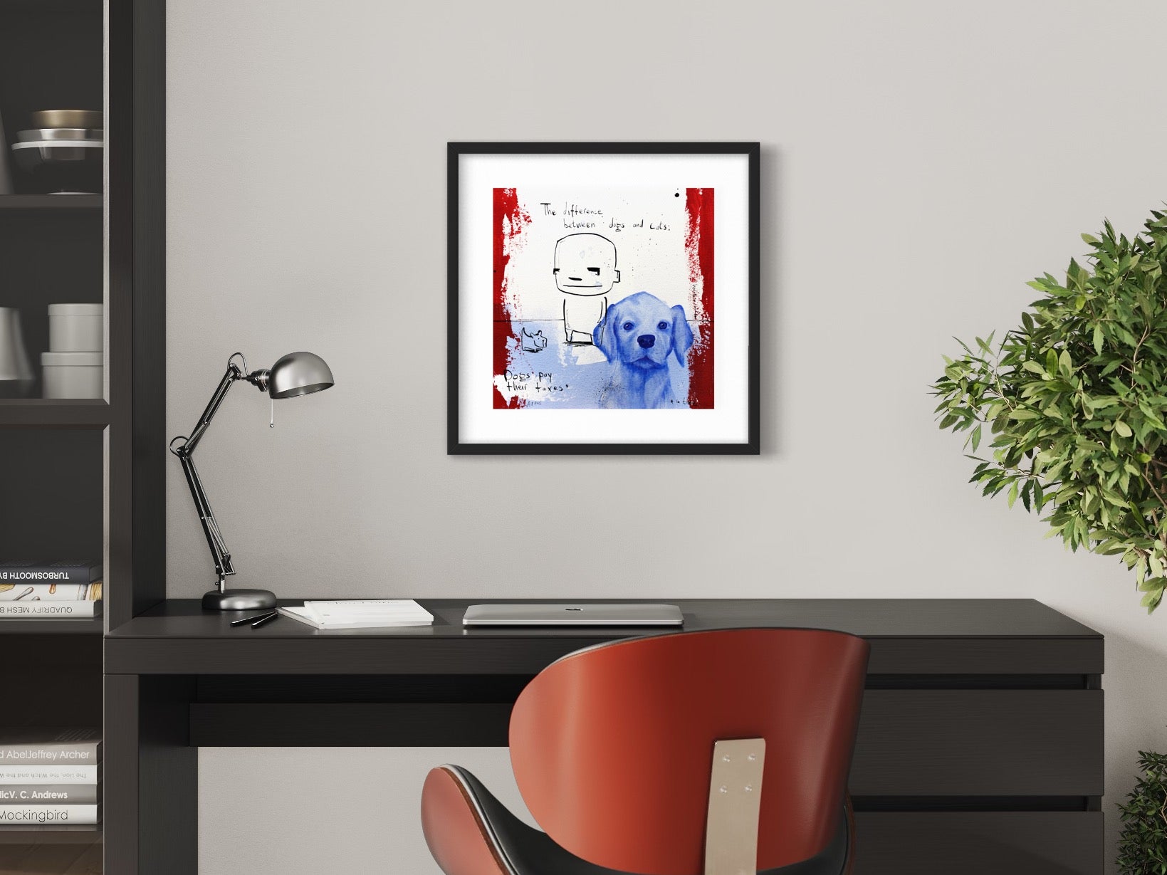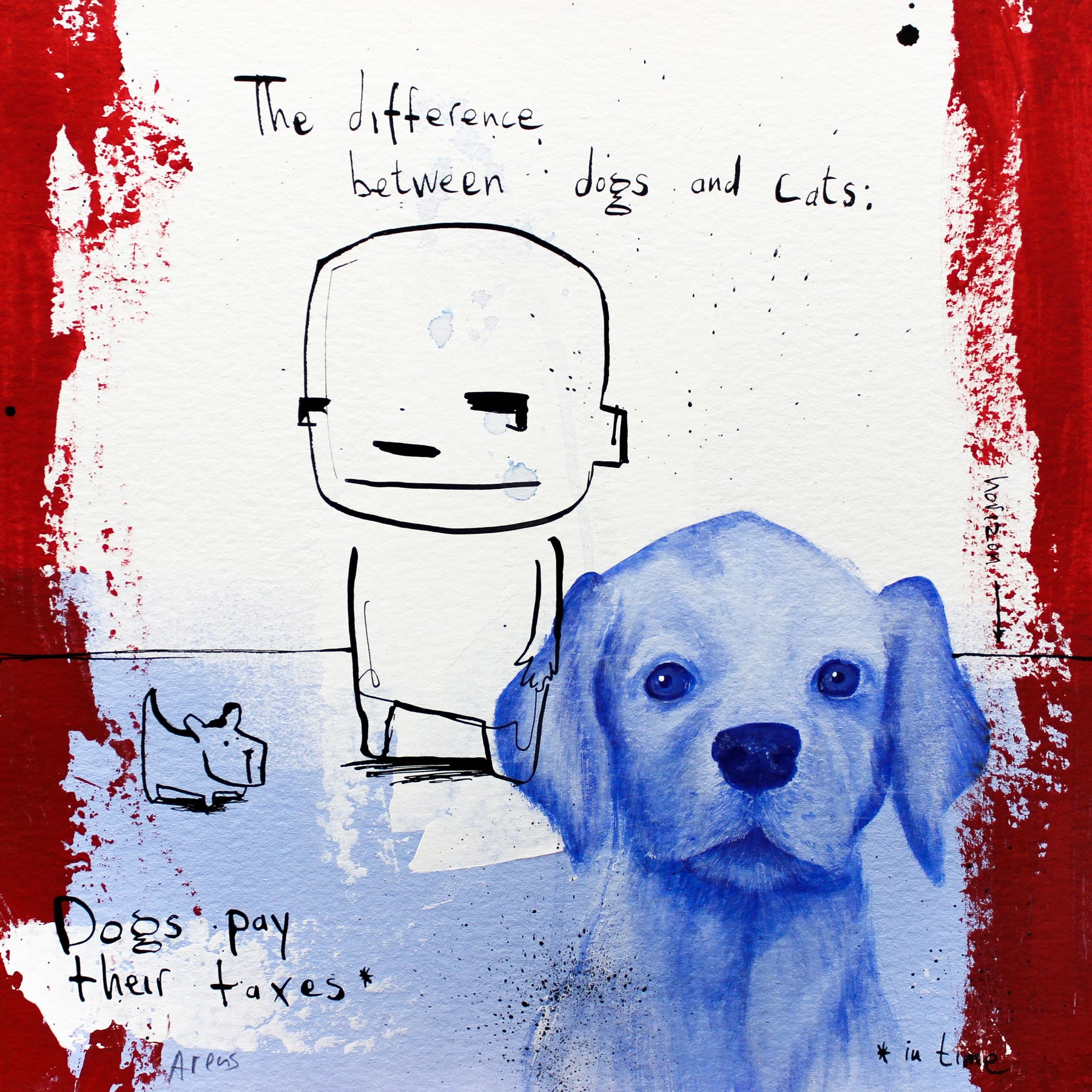 Concentrating on universally understood needs and emotions, Dutch artist Jan-Hein Arens is able to connect with every viewer and admirer of his works. Arens brings together humor and alienation through his paintings. The forefront is typically centered on a simplified figure and text that almost appears to be the thoughts of the figure. Often realistic drawings of body parts, common everyday objects or products are superimposed onto the foreground. Each piece is augmented with additional handwritten text detailing certain aspects of the piece in a comical tone. Paint splatters and rough brushstrokes fill out the remaining space in the paintings, allowing the figures and text to be the focus of each well-thought-out illustration.