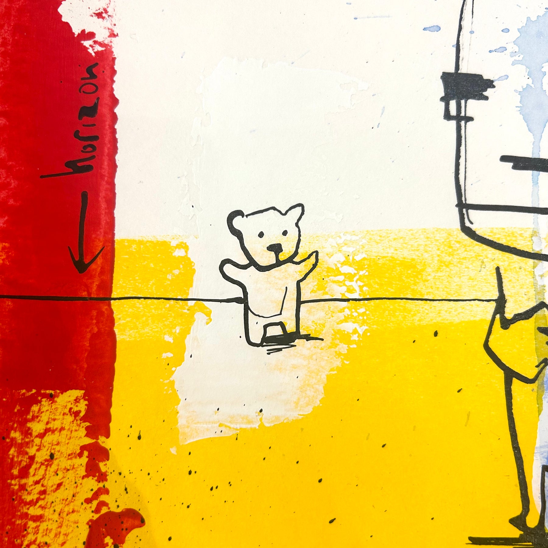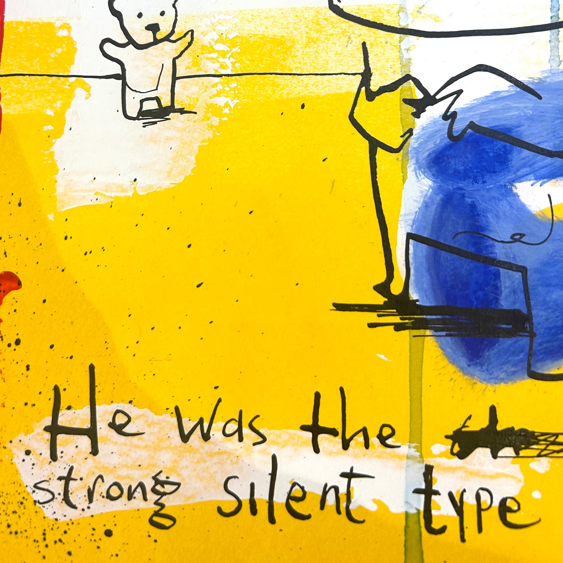 Concentrating on universally understood needs and emotions, Dutch artist Jan-Hein Arens is able to connect with every viewer and admirer of his works. Arens brings together humor and alienation through his paintings. The forefront is typically centered on a simplified figure and text that almost appears to be the thoughts of the figure. Often realistic drawings of body parts, common everyday objects or products are superimposed onto the foreground. Each piece is augmented with additional handwritten text detailing certain aspects of the piece in a comical tone. Paint splatters and rough brushstrokes fill out the remaining space in the paintings, allowing the figures and text to be the focus of each well-thought-out illustration.