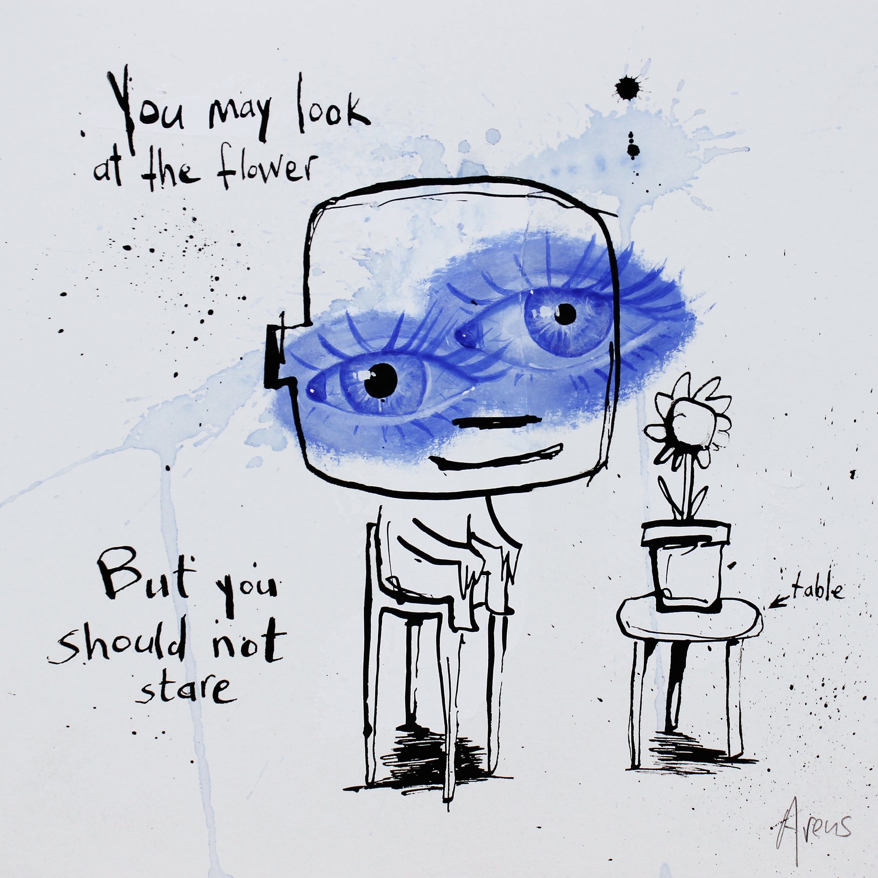 Concentrating on universally understood needs and emotions, Dutch artist Jan-Hein Arens is able to connect with every viewer and admirer of his works. Arens brings together humor and alienation through his paintings. The forefront is typically centered on a simplified figure and text that almost appears to be the thoughts of the figure. Often realistic drawings of body parts, common everyday objects or products are superimposed onto the foreground. Each piece is augmented with additional handwritten text detailing certain aspects of the piece in a comical tone. Paint splatters and rough brushstrokes fill out the remaining space in the paintings, allowing the figures and text to be the focus of each well-thought-out illustration.