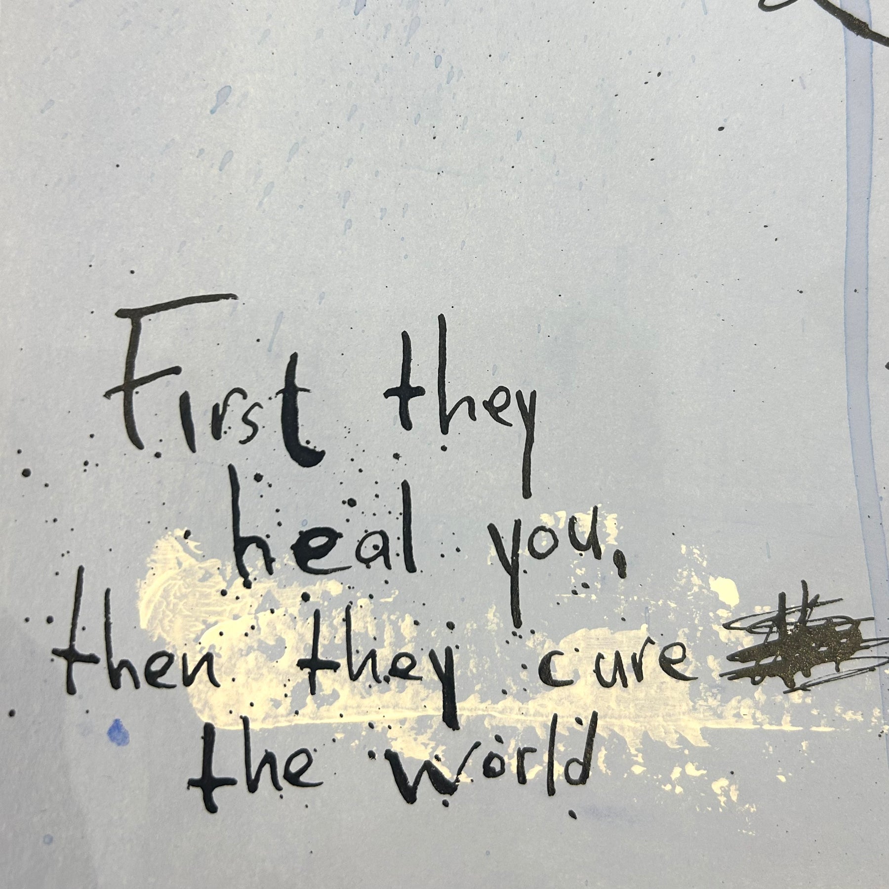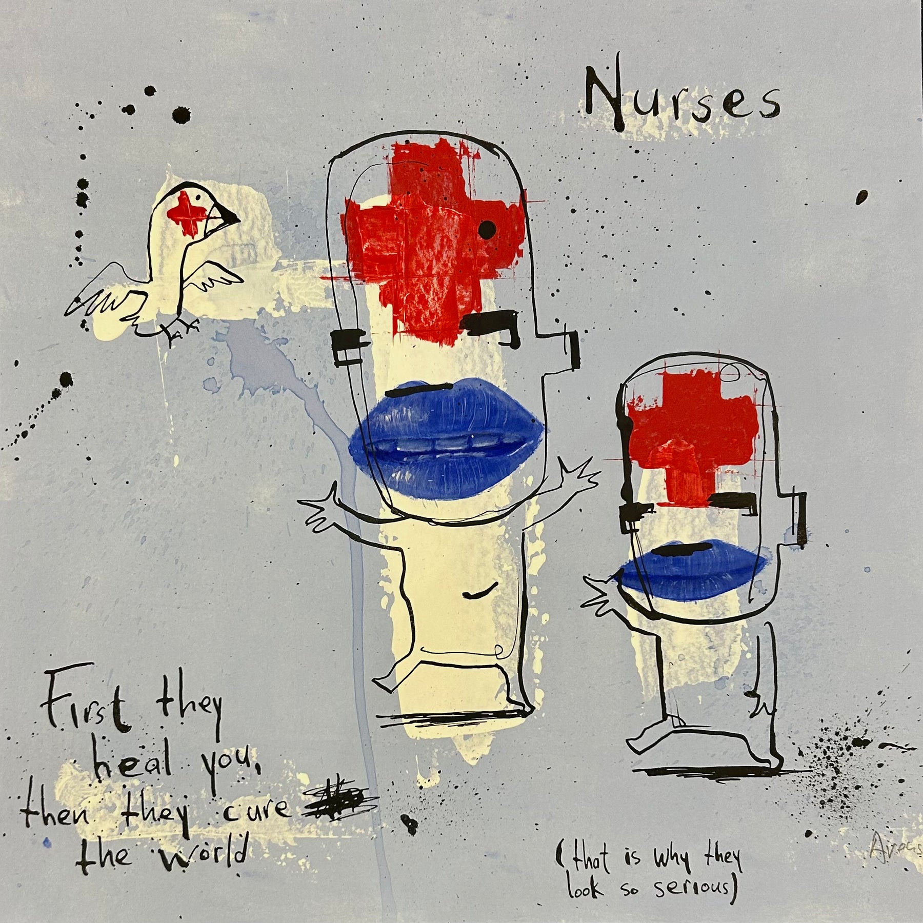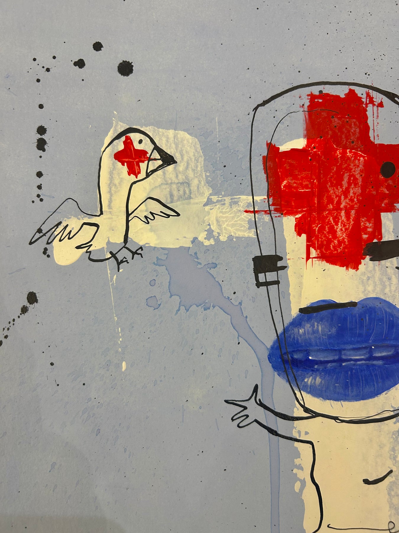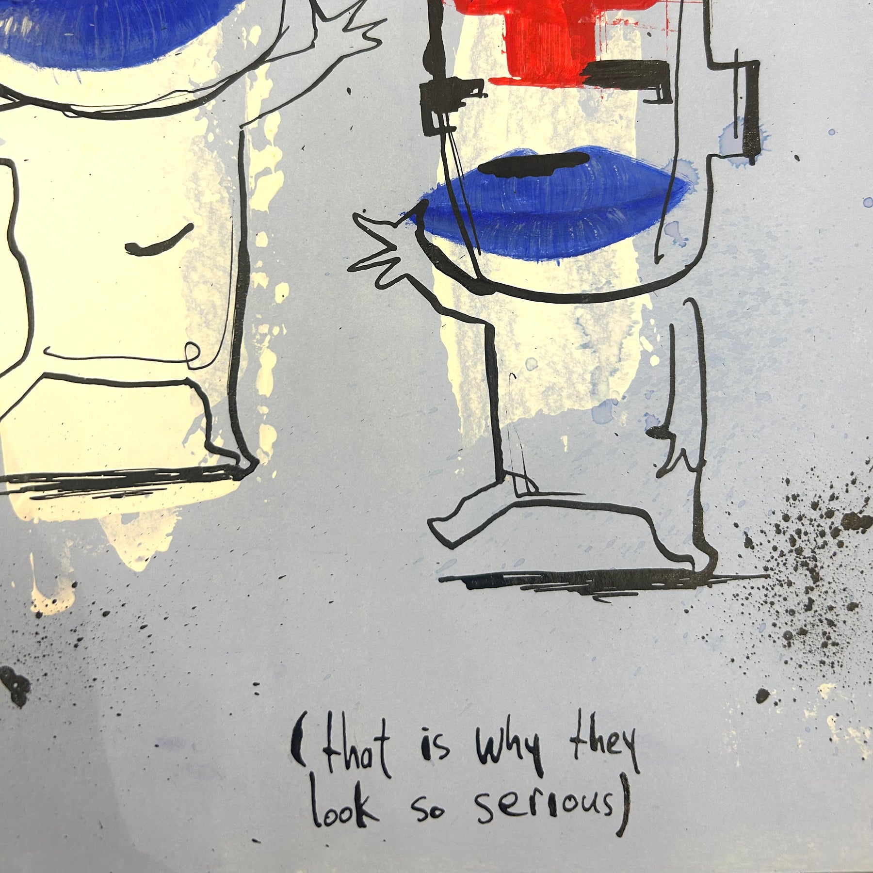 Concentrating on universally understood needs and emotions, Dutch artist Jan-Hein Arens is able to connect with every viewer and admirer of his works. Arens brings together humor and alienation through his paintings. The forefront is typically centered on a simplified figure and text that almost appears to be the thoughts of the figure. Often realistic drawings of body parts, common everyday objects or products are superimposed onto the foreground. Each piece is augmented with additional handwritten text detailing certain aspects of the piece in a comical tone. Paint splatters and rough brushstrokes fill out the remaining space in the paintings, allowing the figures and text to be the focus of each well-thought-out illustration.