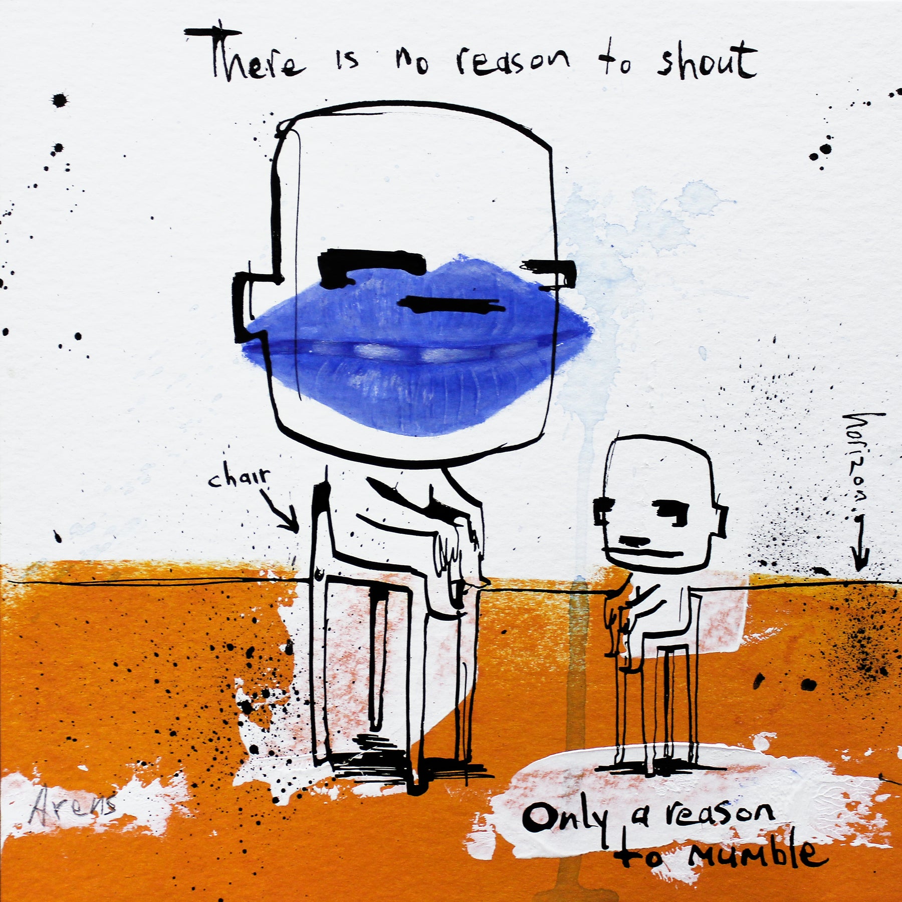 two figure doodles sitting facing each other, one with realistic rendered blue lips orange floor in acrylic and ink by Jan-Hein Arens. Text satire