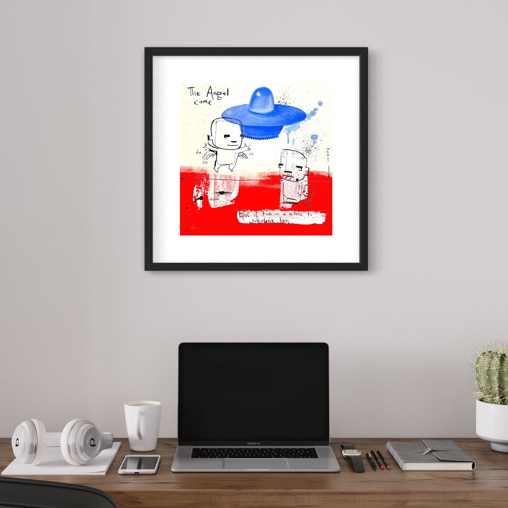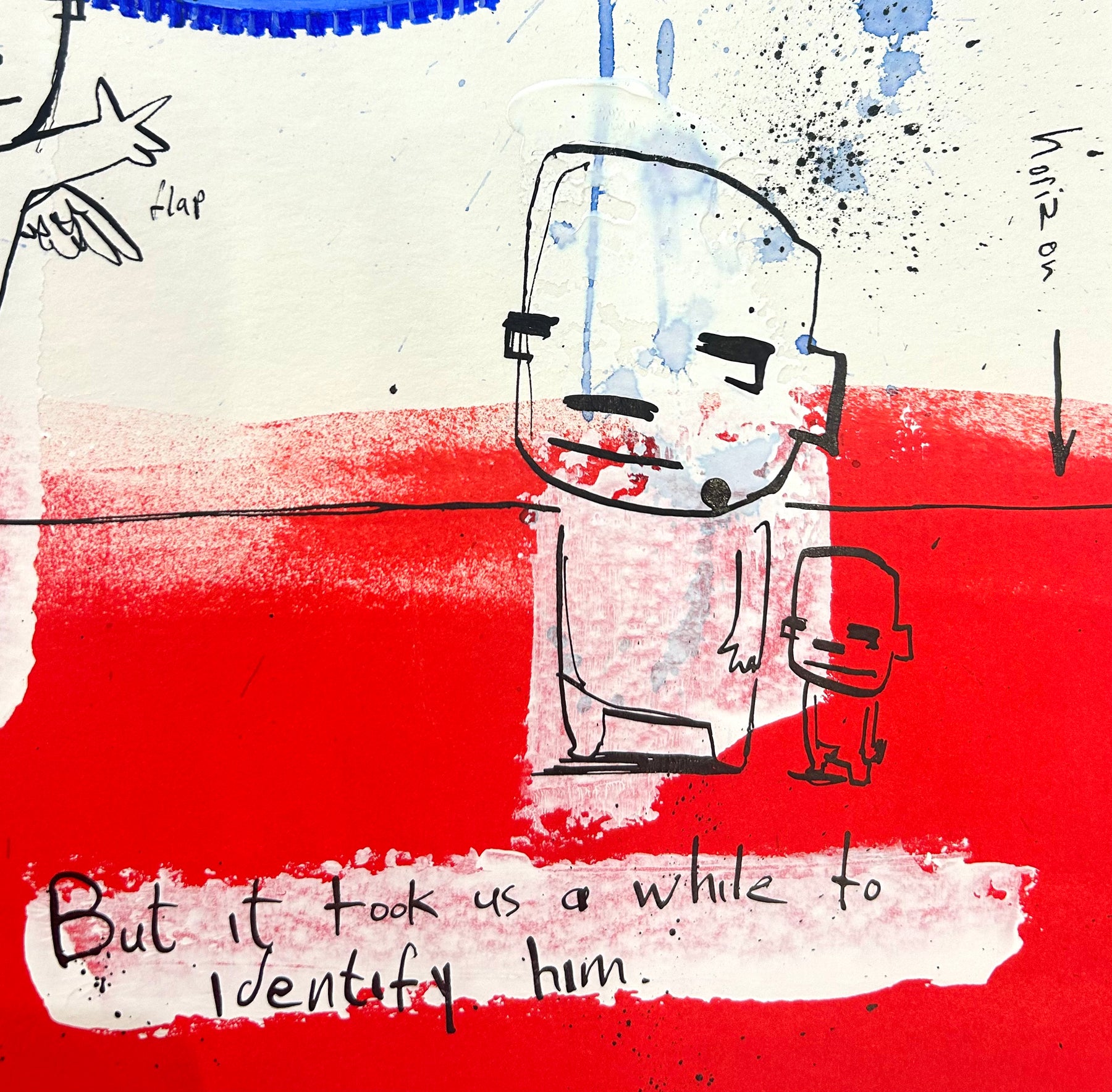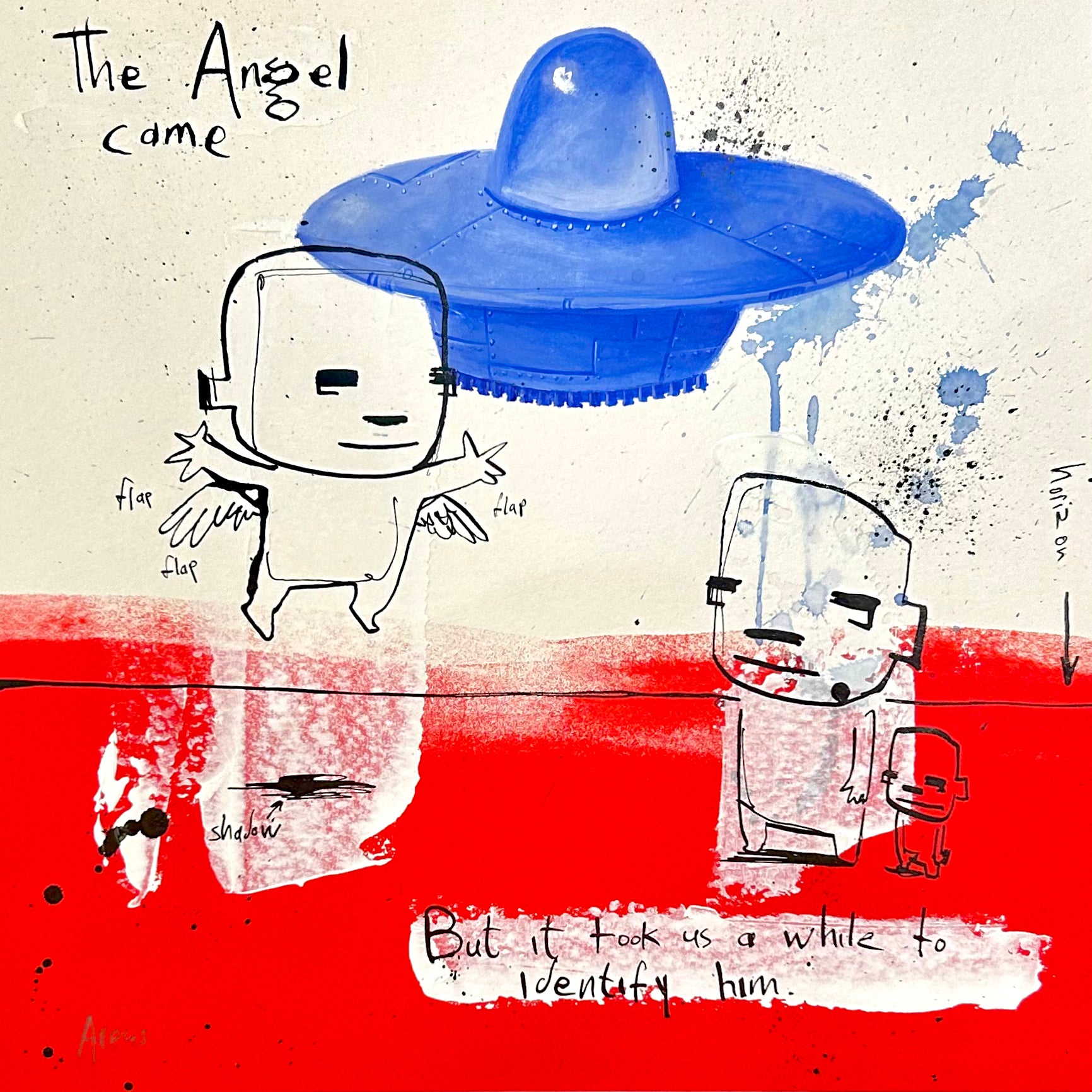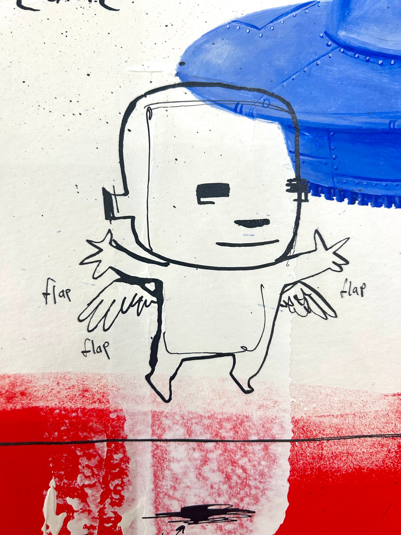 Concentrating on universally understood needs and emotions, Dutch artist Jan-Hein Arens is able to connect with every viewer and admirer of his works. Arens brings together humor and alienation through his paintings. The forefront is typically centered on a simplified figure and text that almost appears to be the thoughts of the figure. Often realistic drawings of body parts, common everyday objects or products are superimposed onto the foreground. Each piece is augmented with additional handwritten text detailing certain aspects of the piece in a comical tone. Paint splatters and rough brushstrokes fill out the remaining space in the paintings, allowing the figures and text to be the focus of each well-thought-out illustration.