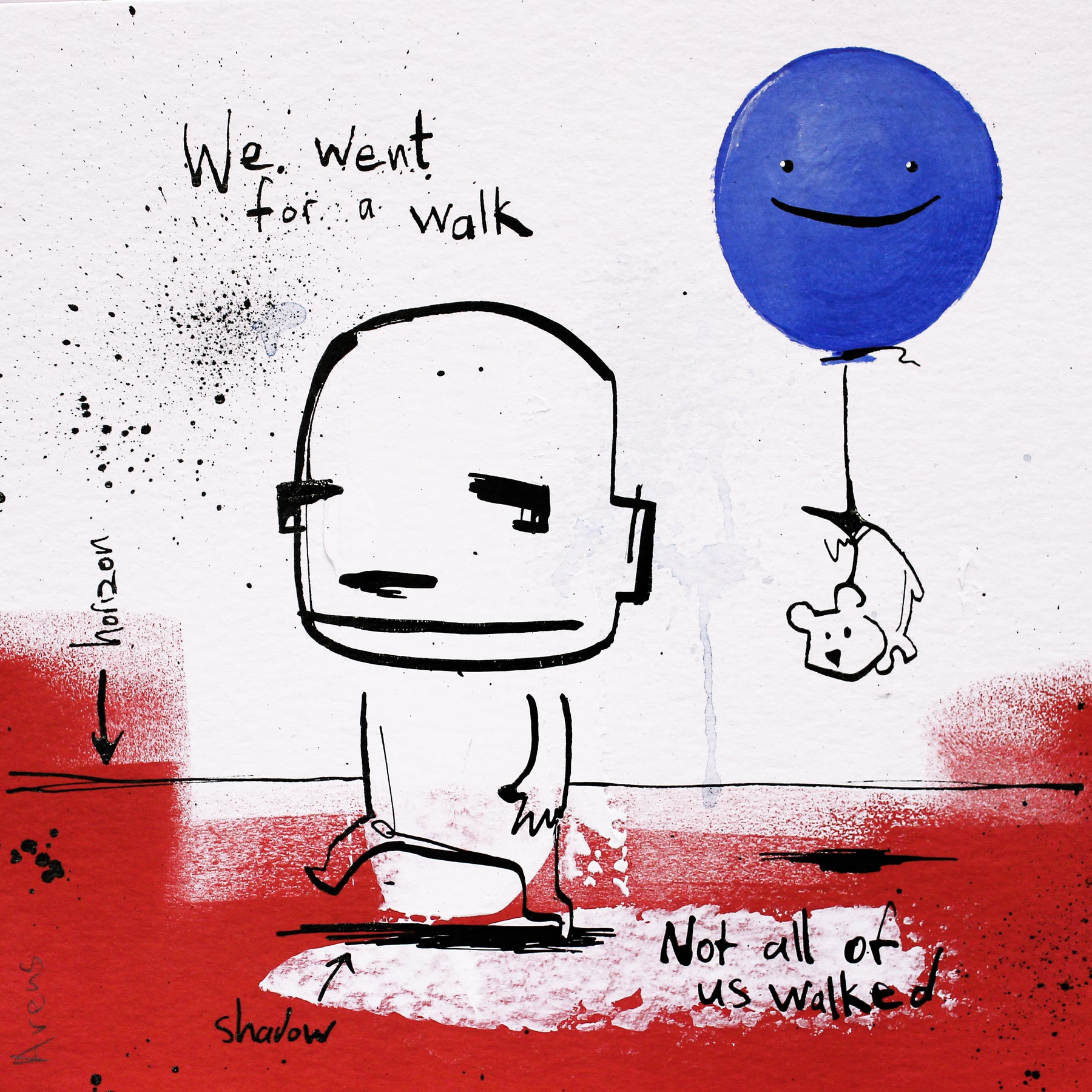 doodle figure in black ink with text and doodle of dog floating from blue balloon on red ground ,white background by jan hein arens