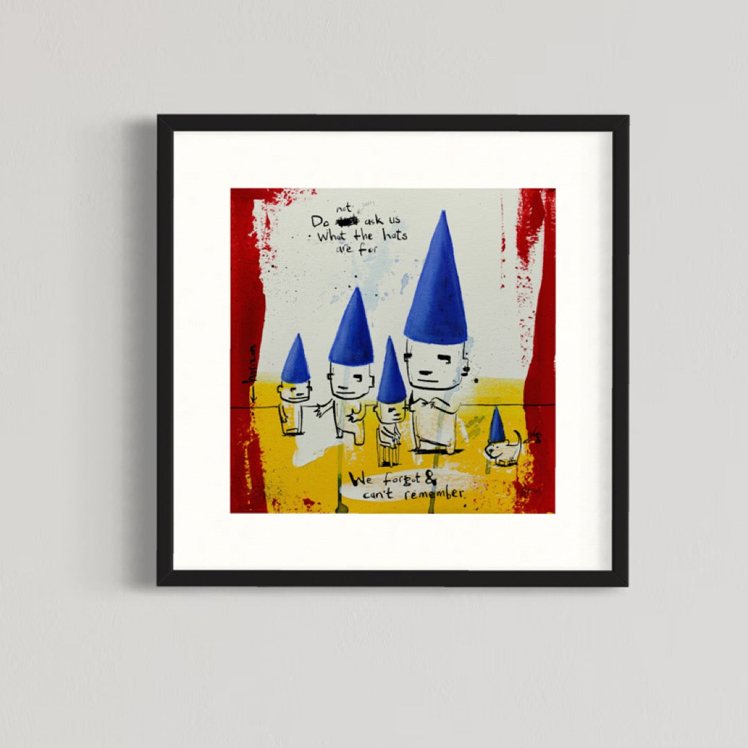 Concentrating on universally understood needs and emotions, Dutch artist Jan-Hein Arens is able to connect with every viewer and admirer of his works. Arens brings together humor and alienation through his paintings. The forefront is typically centered on a simplified figure and text that almost appears to be the thoughts of the figure. Often realistic drawings of body parts, common everyday objects or products are superimposed onto the foreground. Each piece is augmented with additional handwritten text detailing certain aspects of the piece in a comical tone. Paint splatters and rough brushstrokes fill out the remaining space in the paintings, allowing the figures and text to be the focus of each well-thought-out illustration.