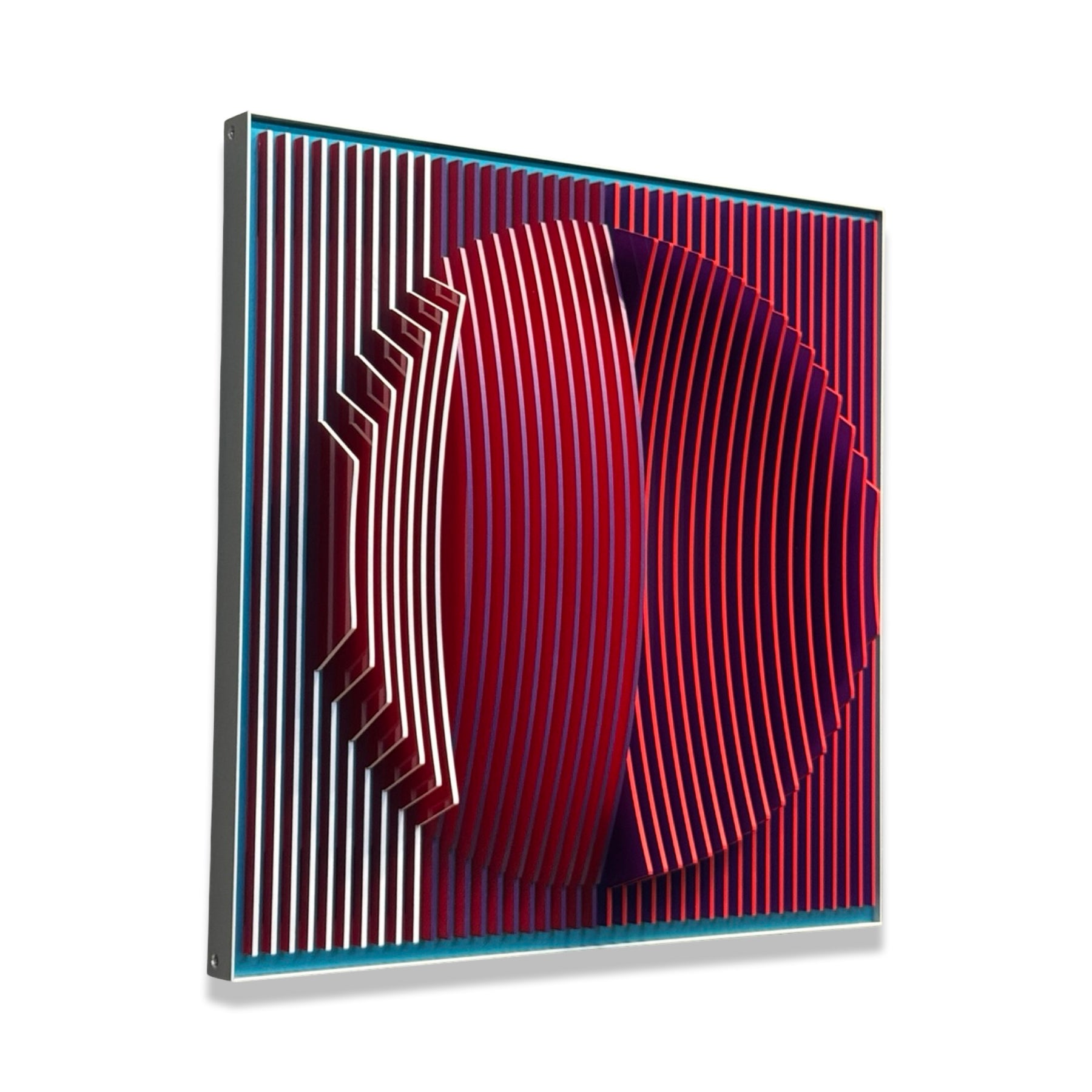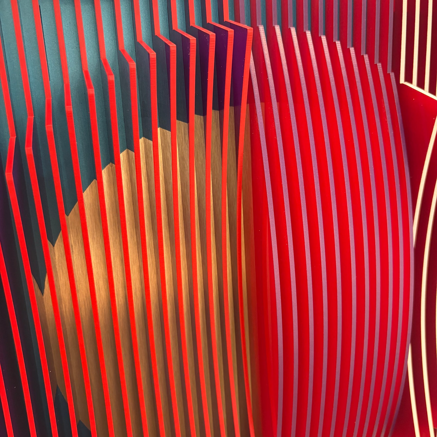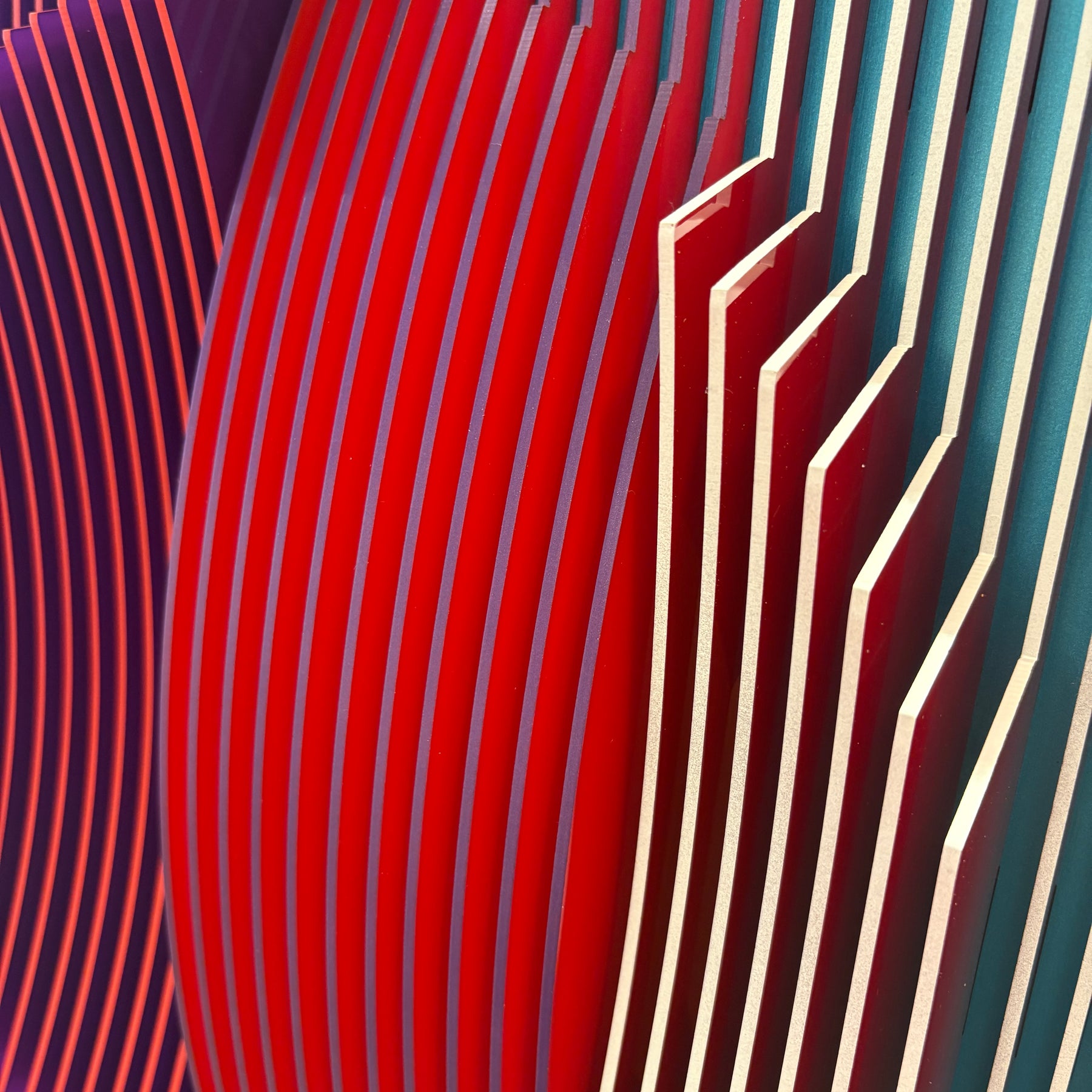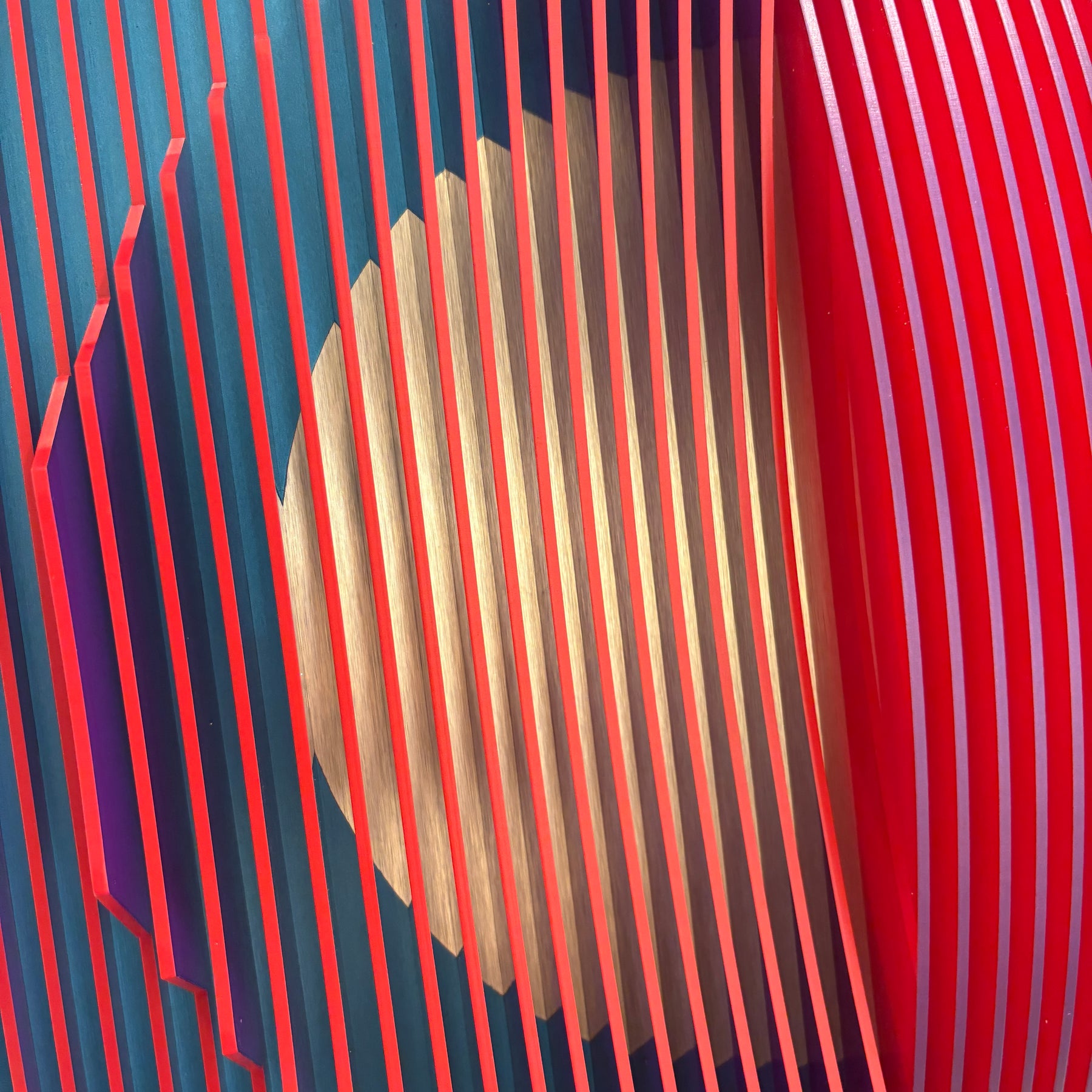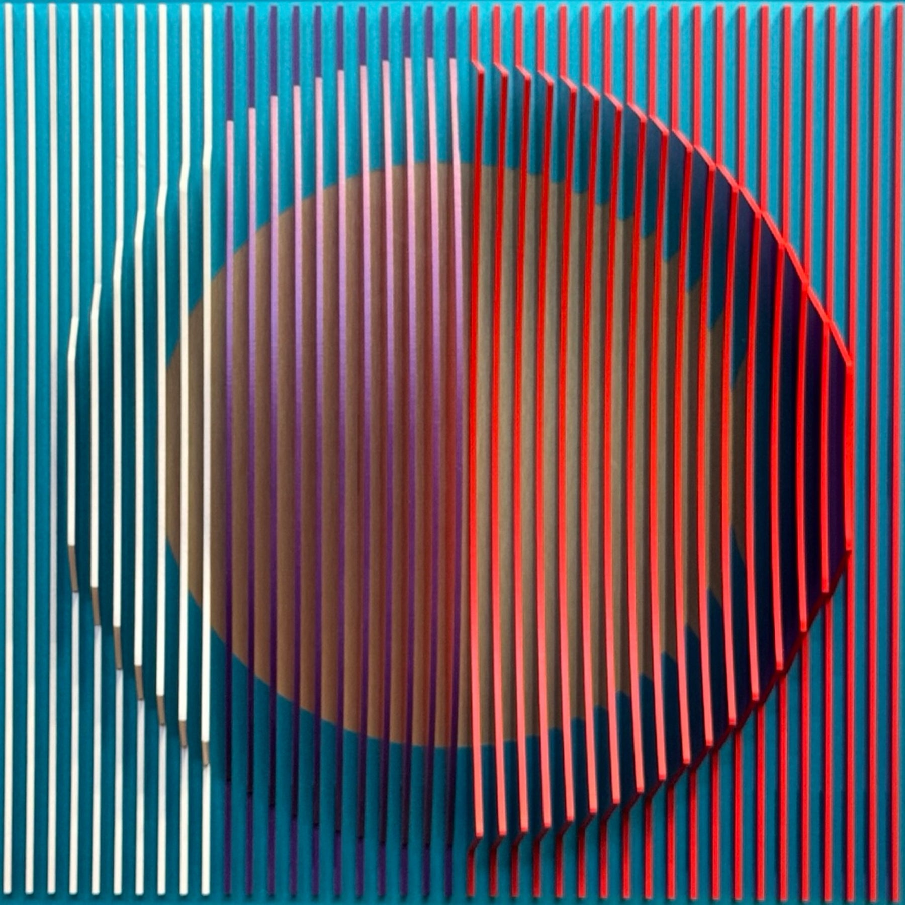 vertical stripes in three sections of color purple blue red optical mixing illusion concave convex sculptural abstract geometric modern