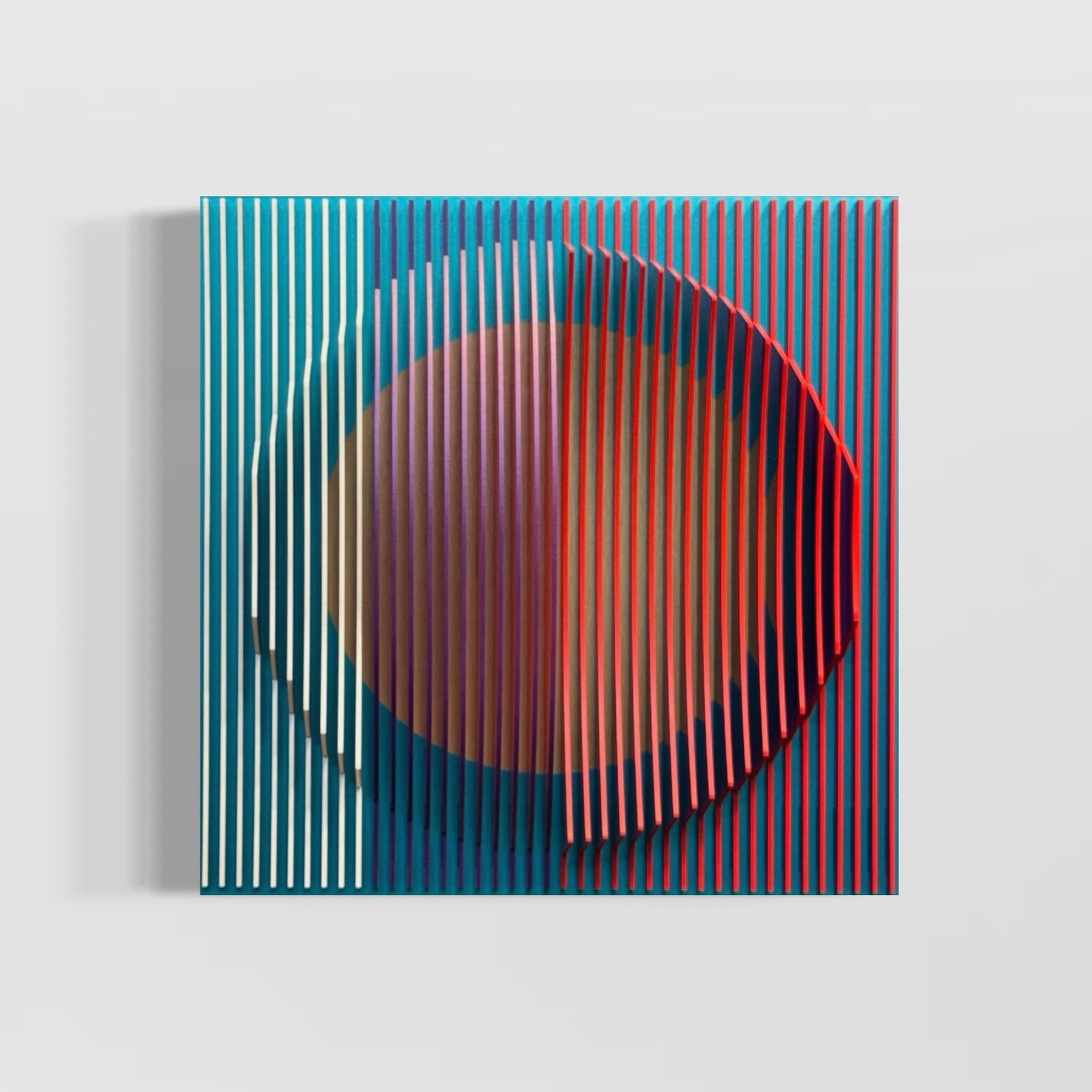3 dimensional circular shape in center of vertical stripes square composition in red and blue white then when turned to side mostly red emerges optical illusion space color