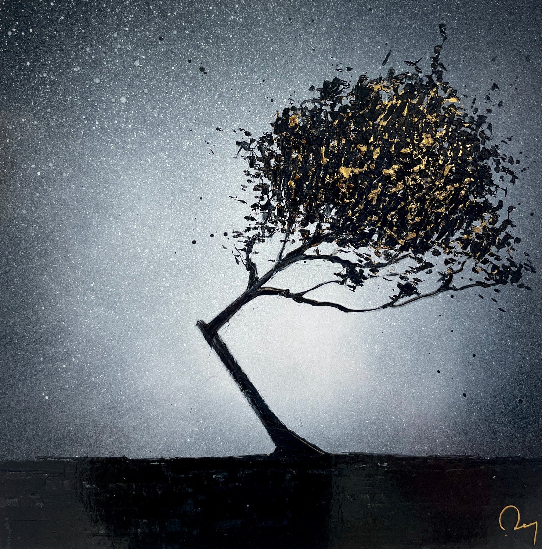 Julien Rey's story begins like all great stories: with an impossible dream. With achromatopsia (the absence of color vision), the artist sees only in black and white. Yet, this condition did not prevent him from traveling to the borders of Burma, from changing his life (he became a Buddhist monk), or from embarking on his art. From his trip to Burma, he brought back a perfect mastery of gold leaf and Chinese lacquer, a characteristic element in his work. His technique based on lacquer worked with a knife and gold leaf inlays places light at the center of his works. Marked by Zen philosophy, he creates minimal compositions that appear as suspended moments and poetic pauses. Julien Rey takes us on a journey through his paintings to urban landscapes and far-off lands.