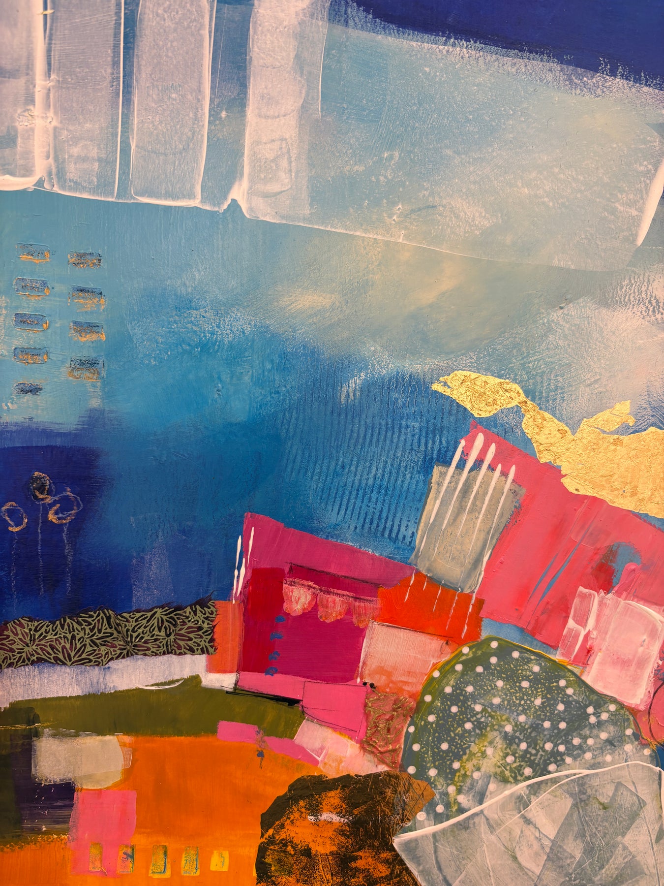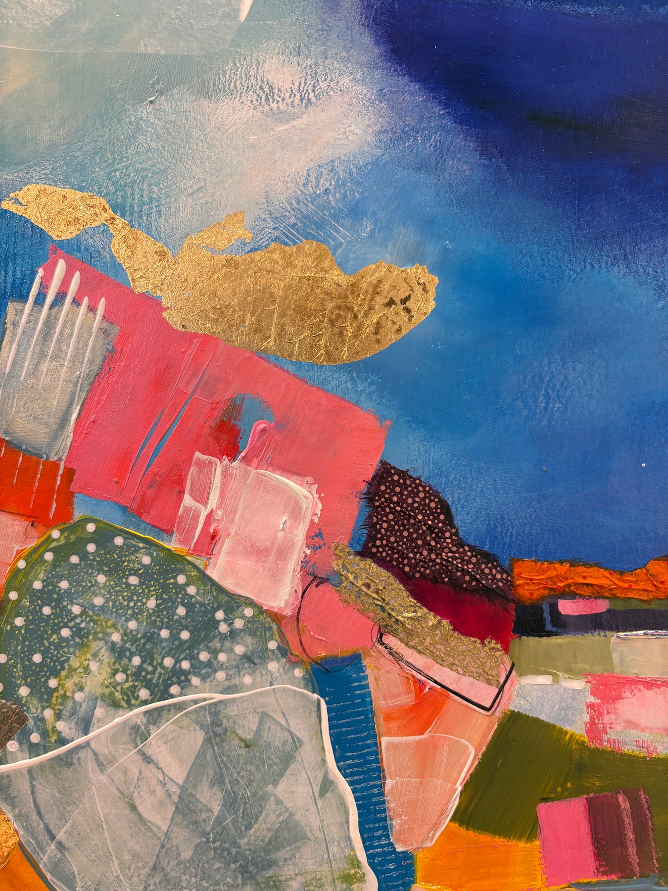 abstract collage expressionist pattern and mark making with paper fabric gold leaf acrylic paint and graphite stacked and overlapping transparent glazes on blue cloudy background
