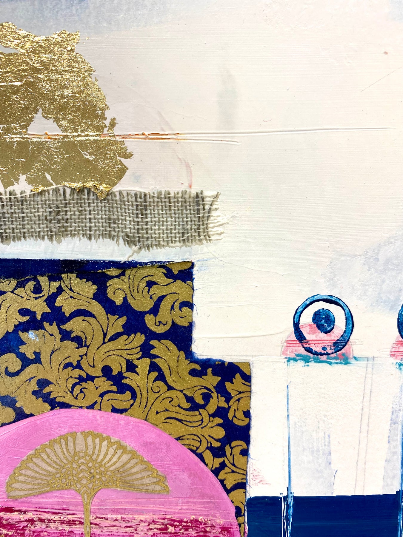 - Acrylic paint, fabric, graphite, and gold leaf on canvas