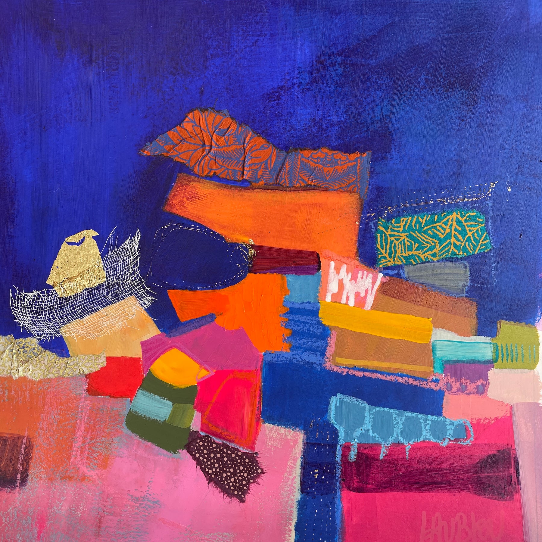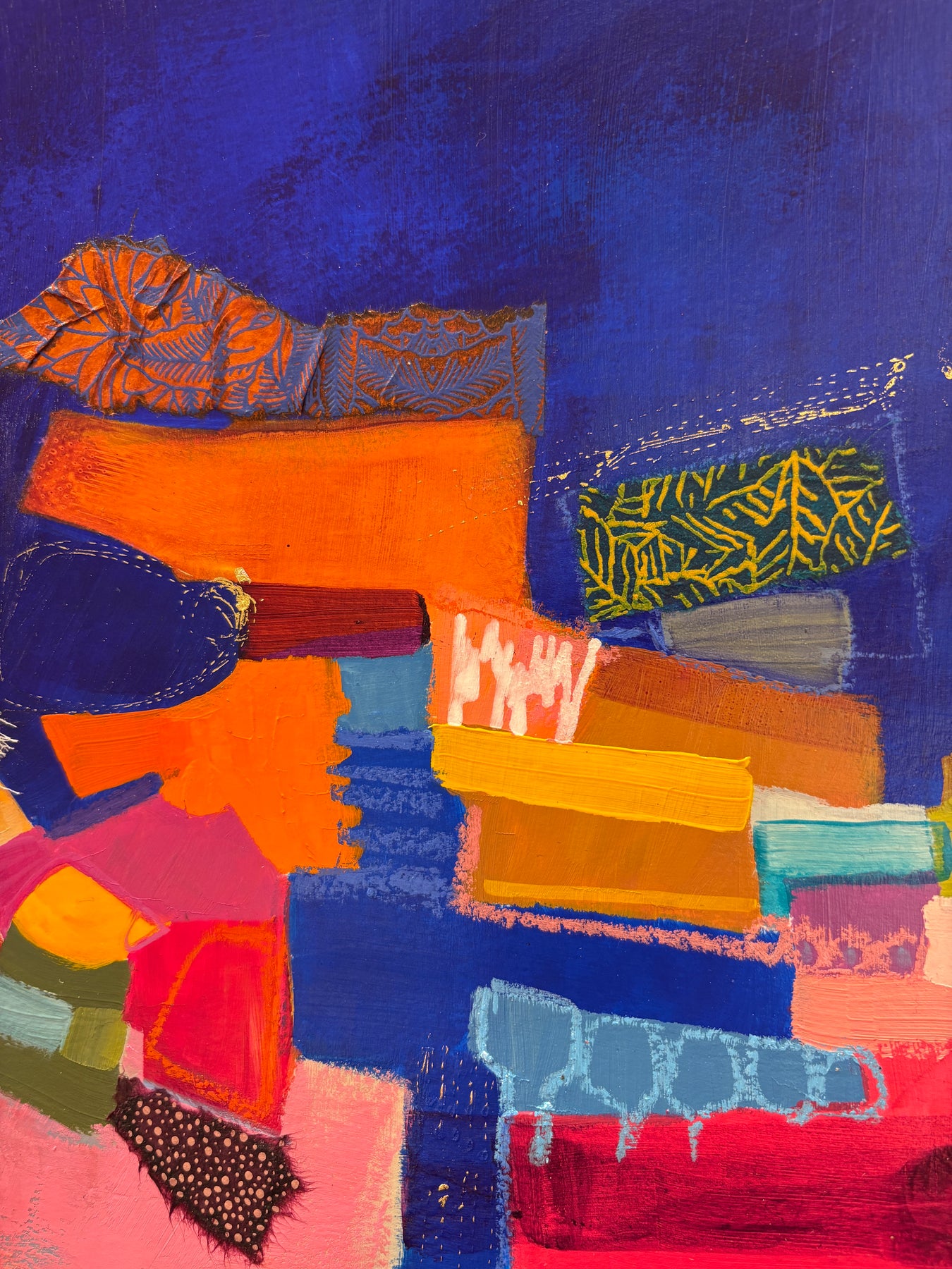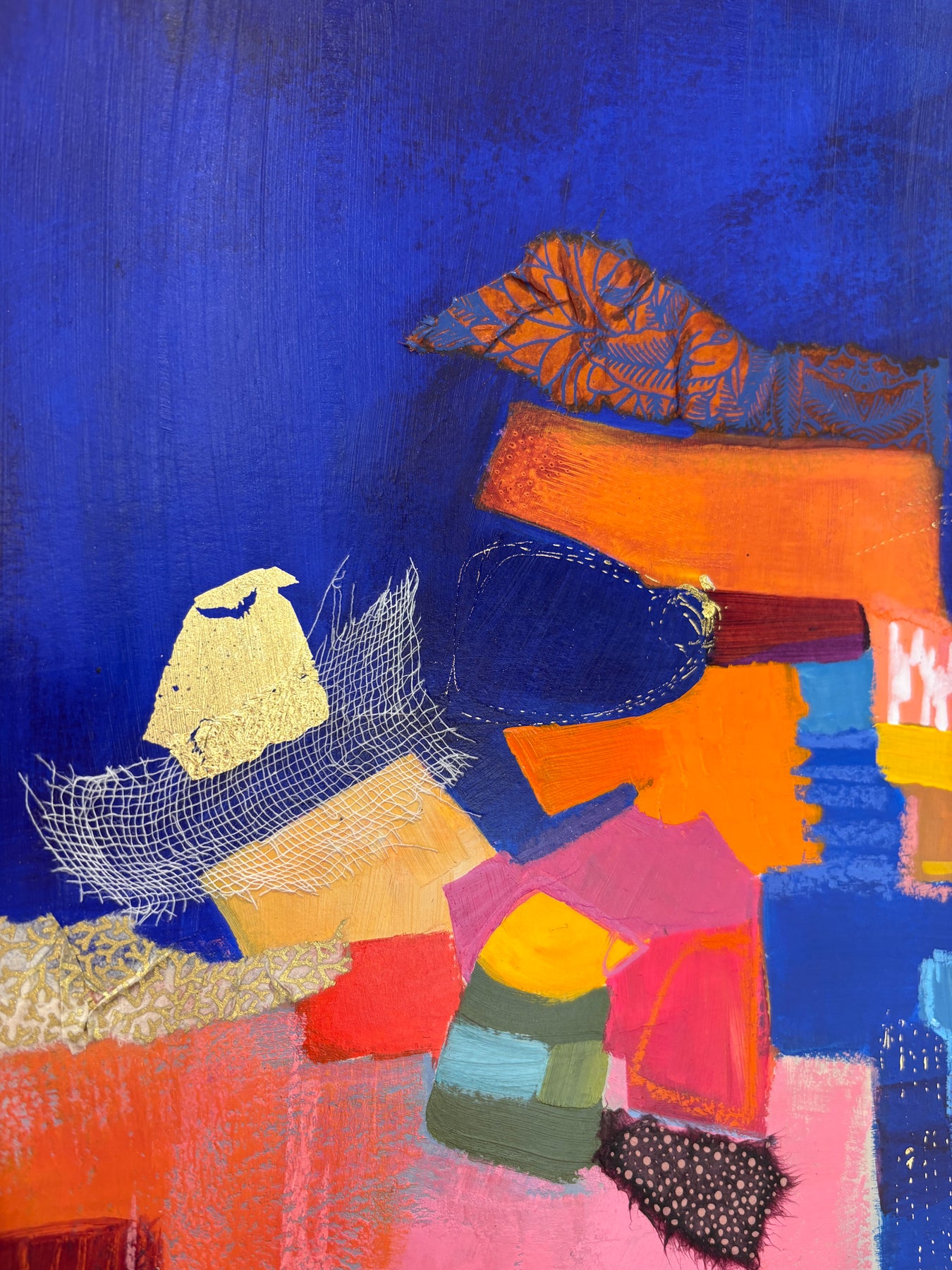 pile stack abstract composition collage of shapes colors pink orange in fabric acrylic paint graphite pastel patterns net on dark blue washy background