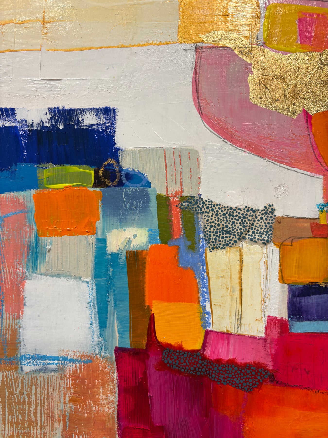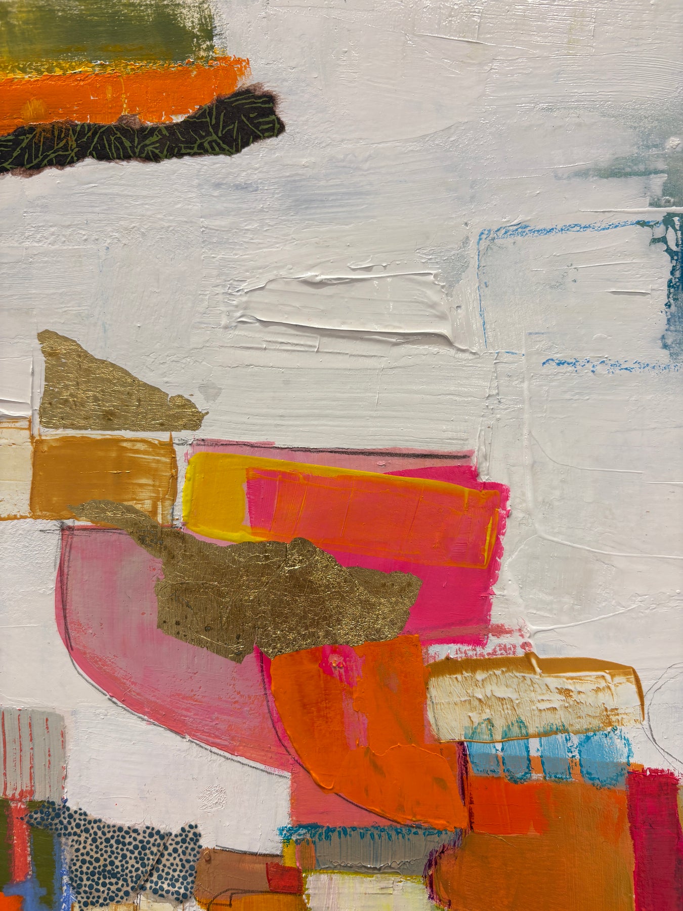 multicolor collage of acrylic paint, fabric, graphite, gold leaf, foil, patterns square shapes tacked on white background textured
