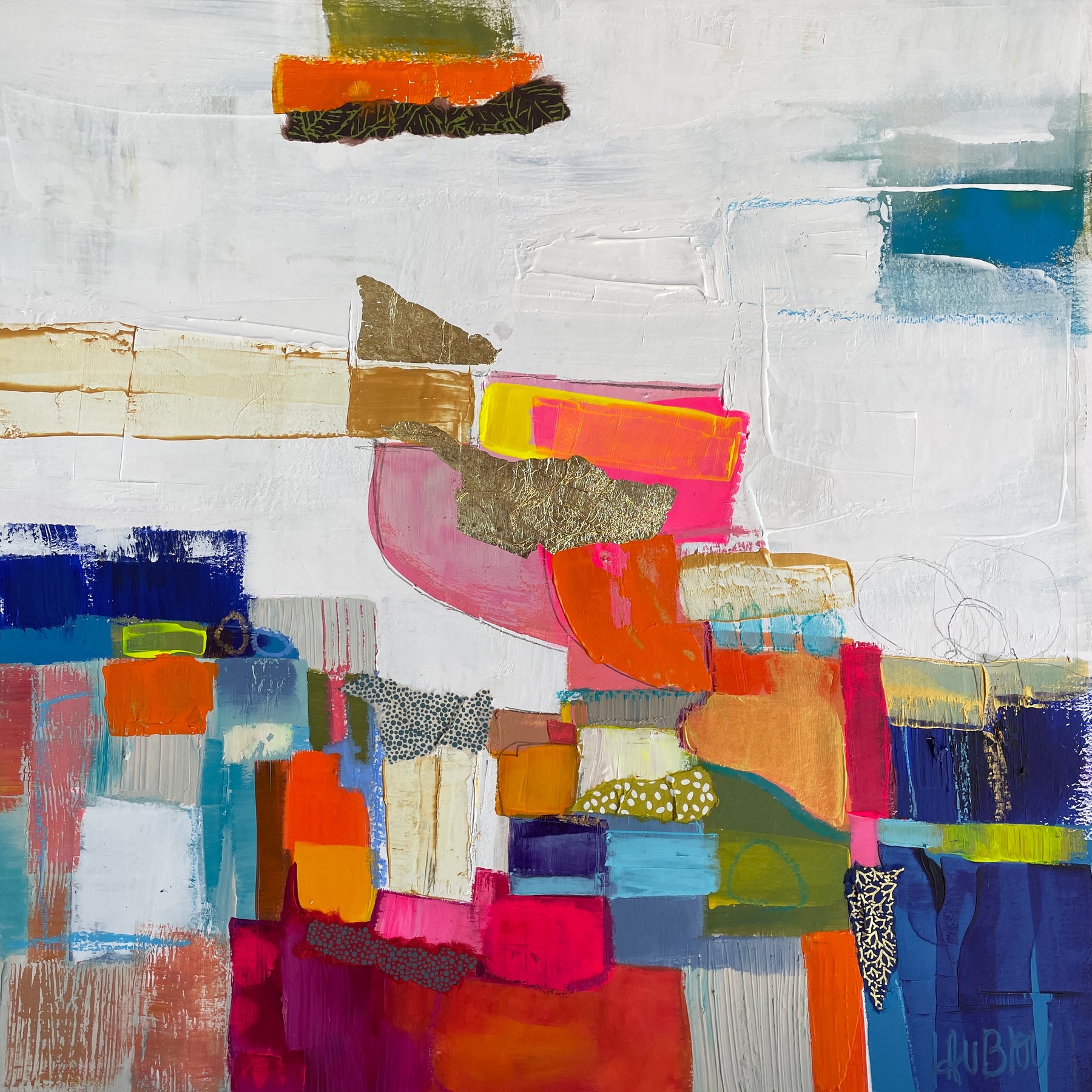 Growing up near the banks of the Loire river in France, abstract expressionist painter Lau Blou fell in love with the warm colors and softness of her natural surroundings. Her abstract paintings hint at landscapes, textured with paper and fabrics, gold and silver leaf, acrylic, and glazes. In her works, Lau Blou finds a masterful balance between chaos and negative space.