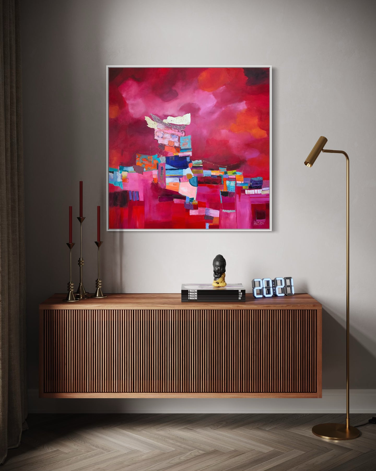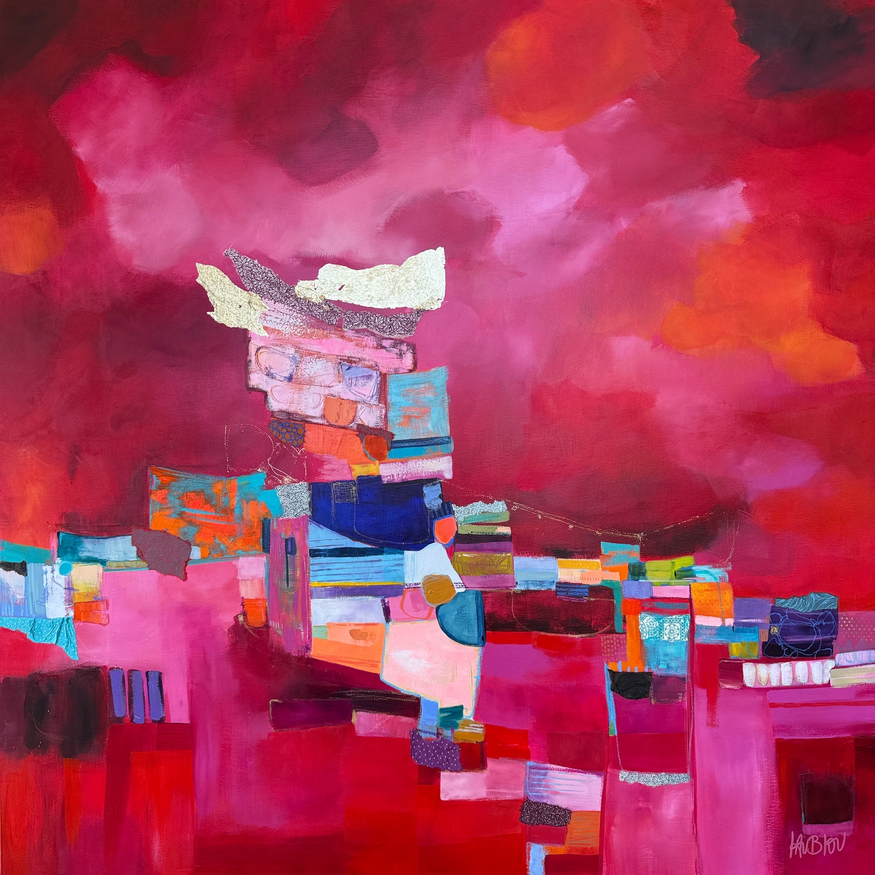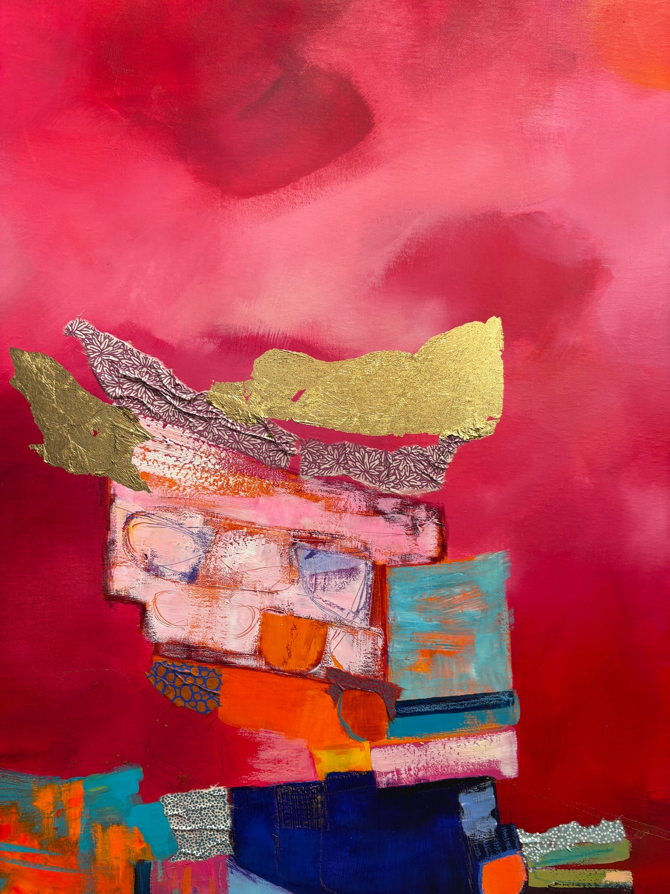 Growing up near the banks of the Loire river in France, abstract expressionist painter Lau Blou fell in love with the warm colors and softness of her natural surroundings. Her abstract paintings hint at landscapes, textured with paper and fabrics, gold and silver leaf, acrylic, and glazes. In her works, Lau Blou finds a masterful balance between chaos and negative space.