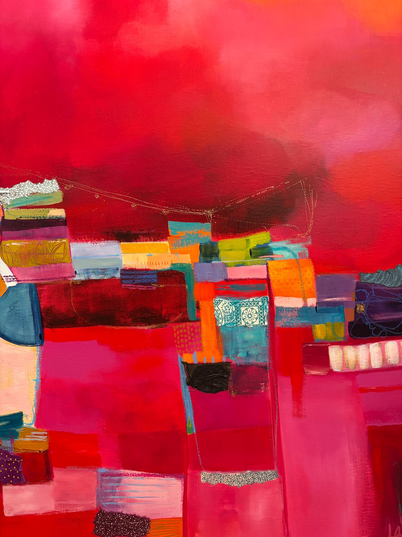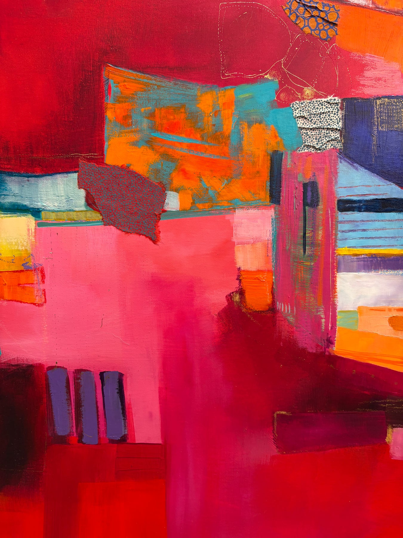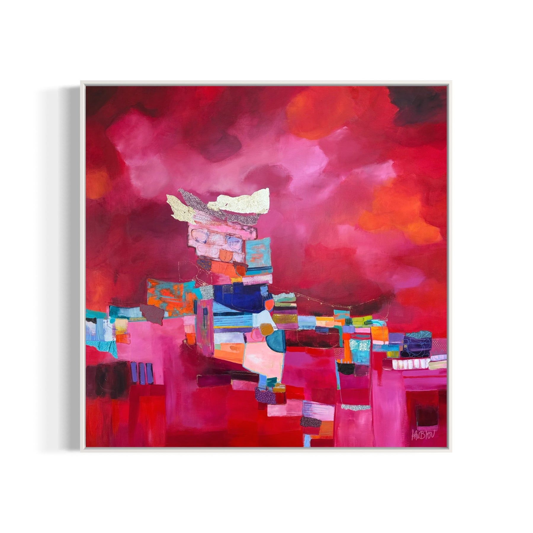 Growing up near the banks of the Loire river in France, abstract expressionist painter Lau Blou fell in love with the warm colors and softness of her natural surroundings. Her abstract paintings hint at landscapes, textured with paper and fabrics, gold and silver leaf, acrylic, and glazes. In her works, Lau Blou finds a masterful balance between chaos and negative space.