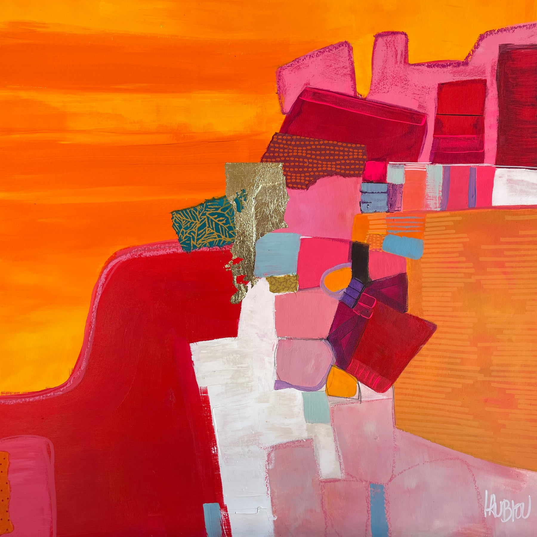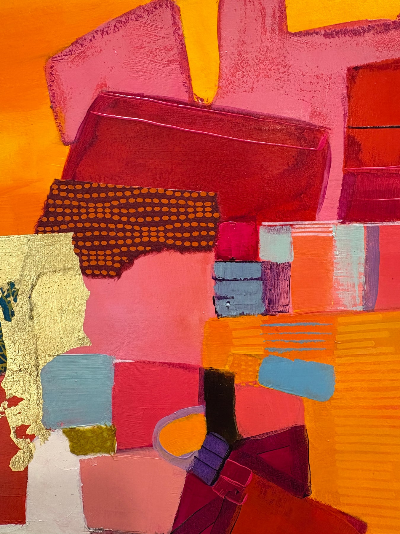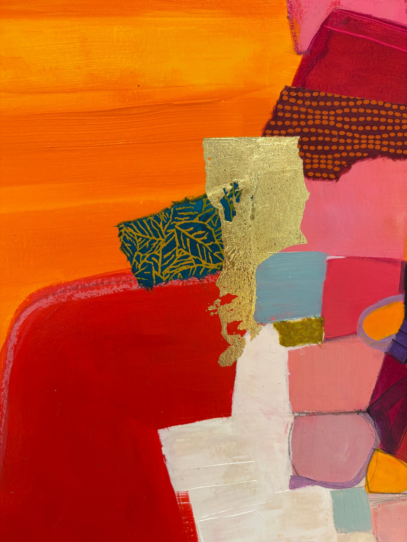orange and pink abstract collage with paint marker fabric gold leaf foil graphite acrylic stacked shapes