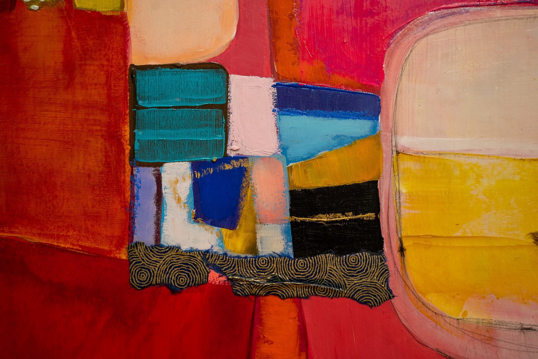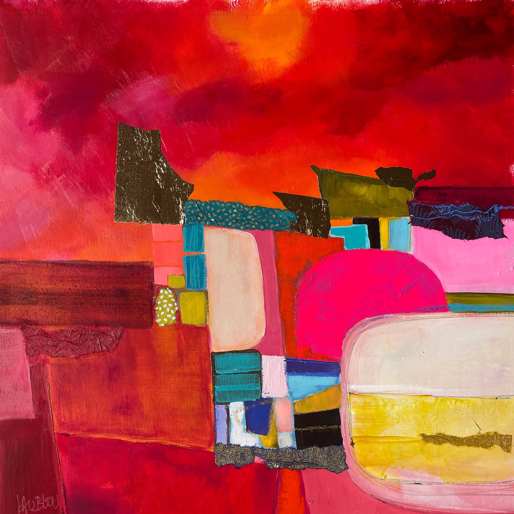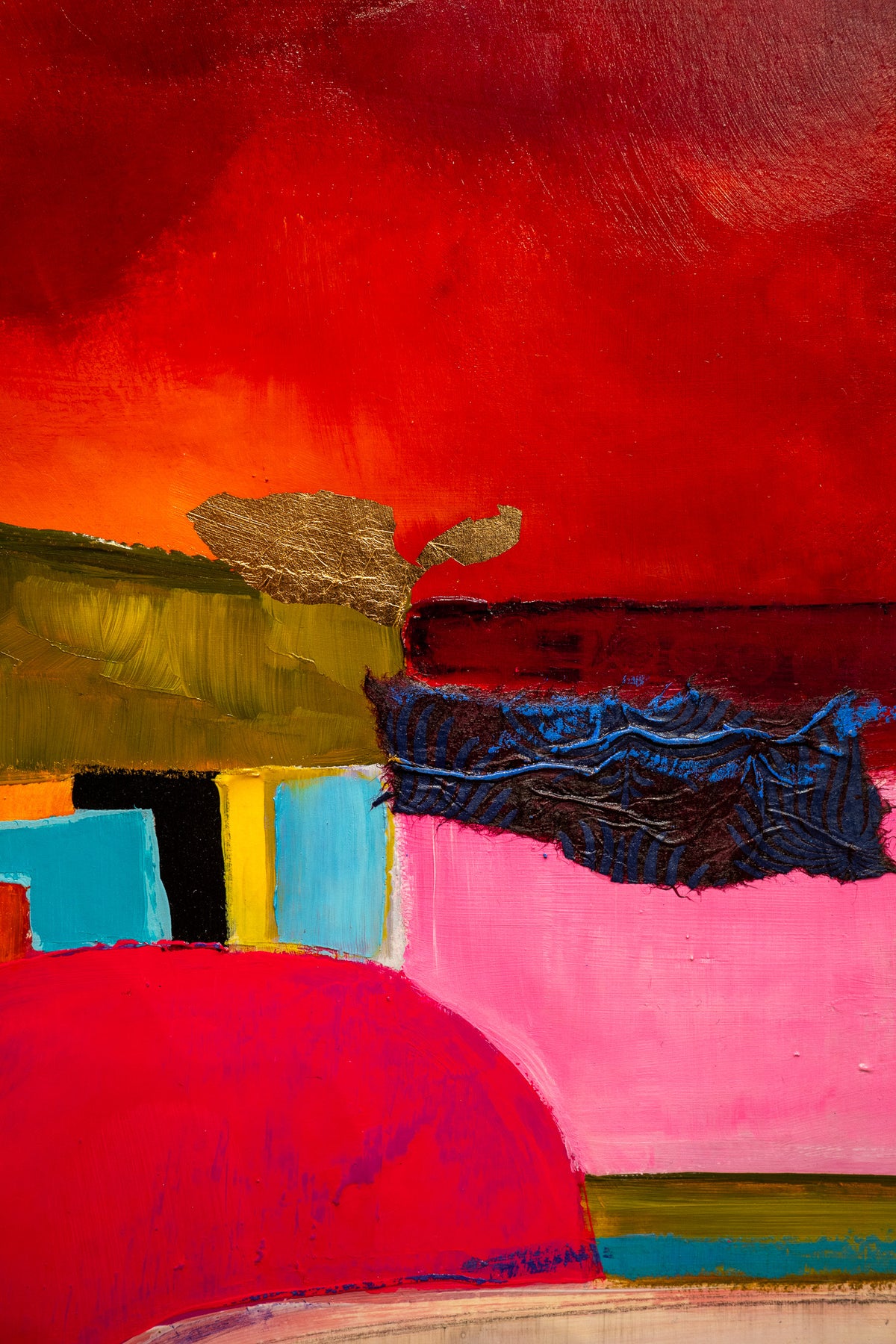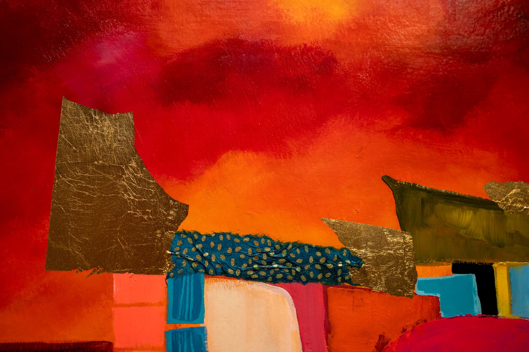 red and orange acrlic abstract paint with paper and fabric cut out shapes and gold foil