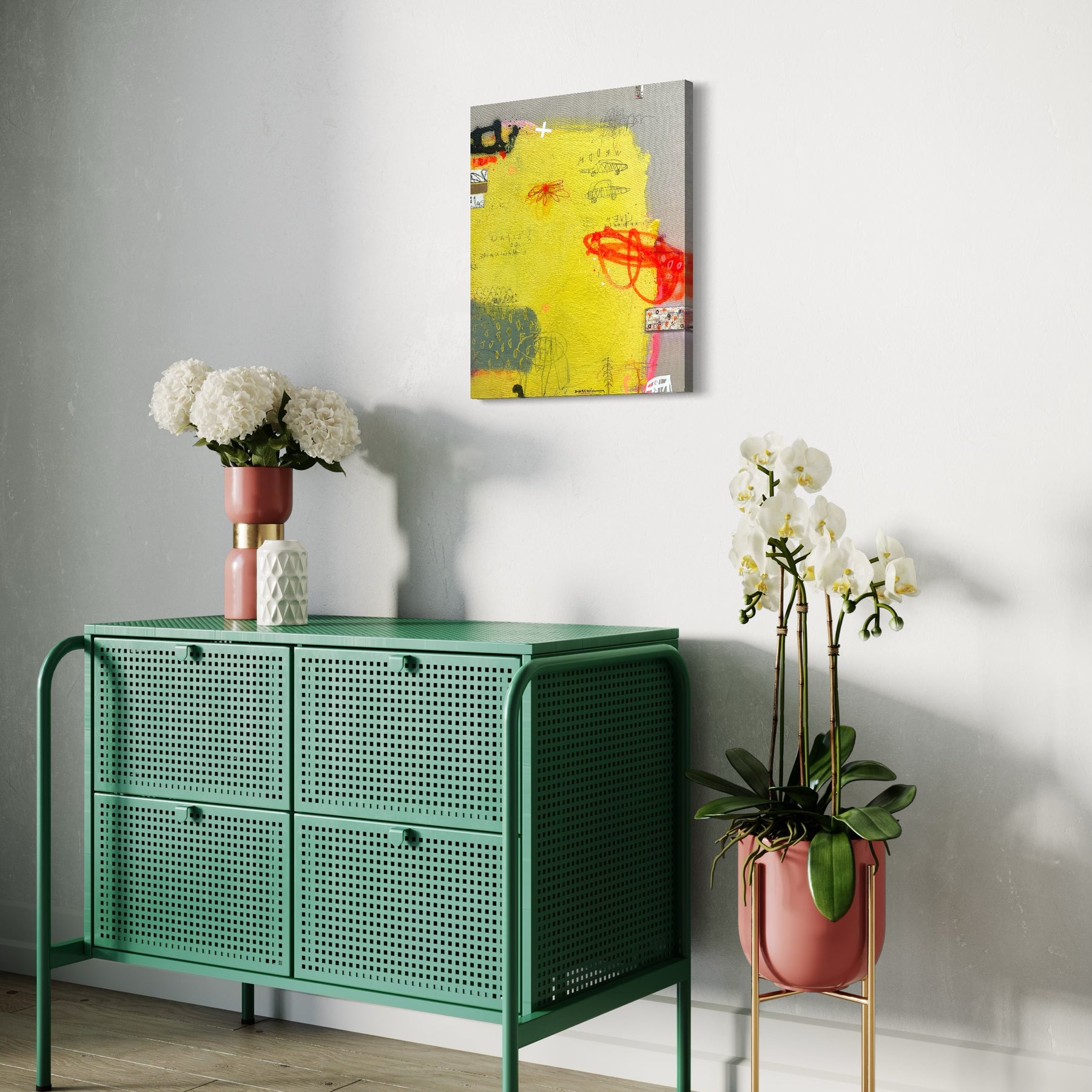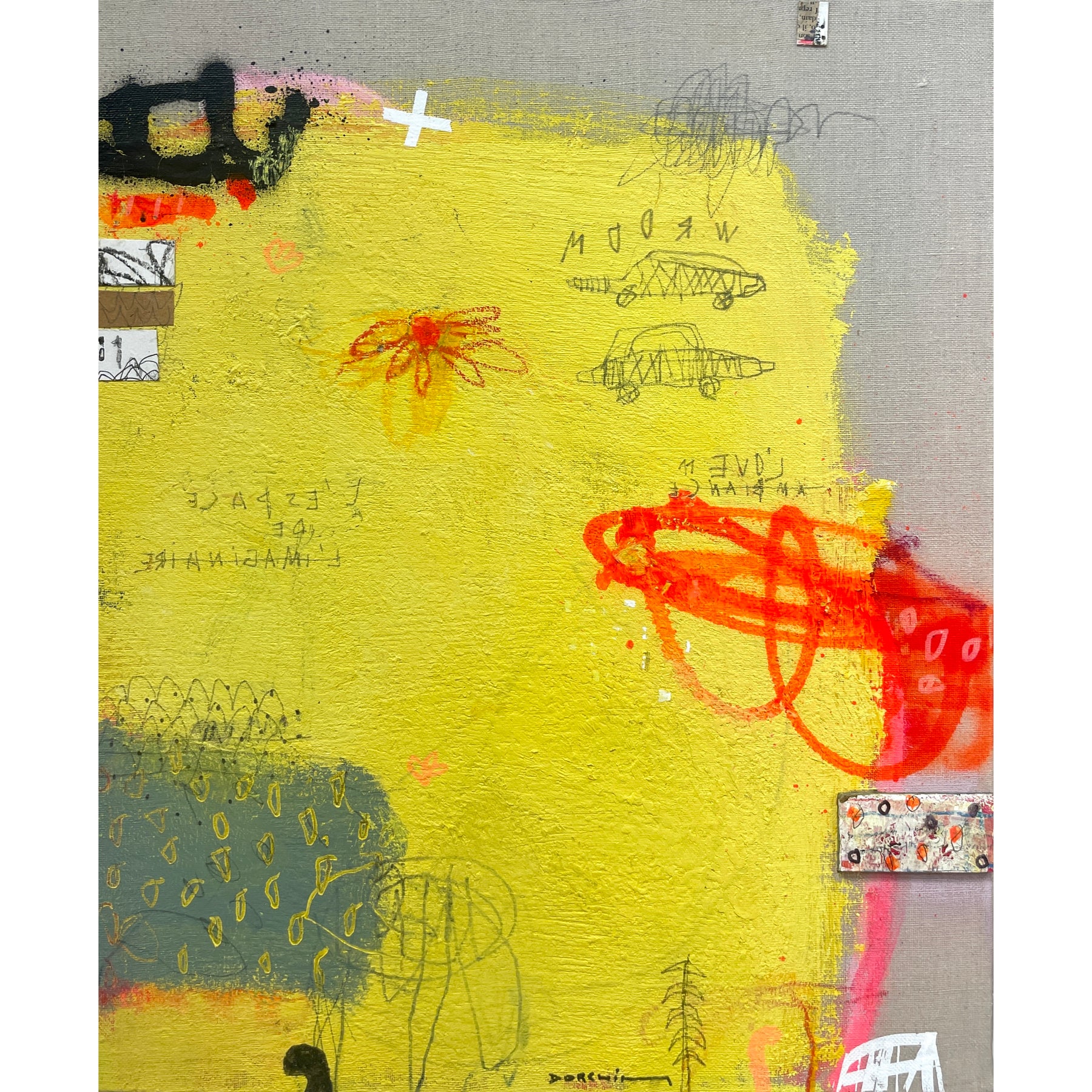 yellow gestural painting on raw linen canvas with green and orange details graphite doodle drawings