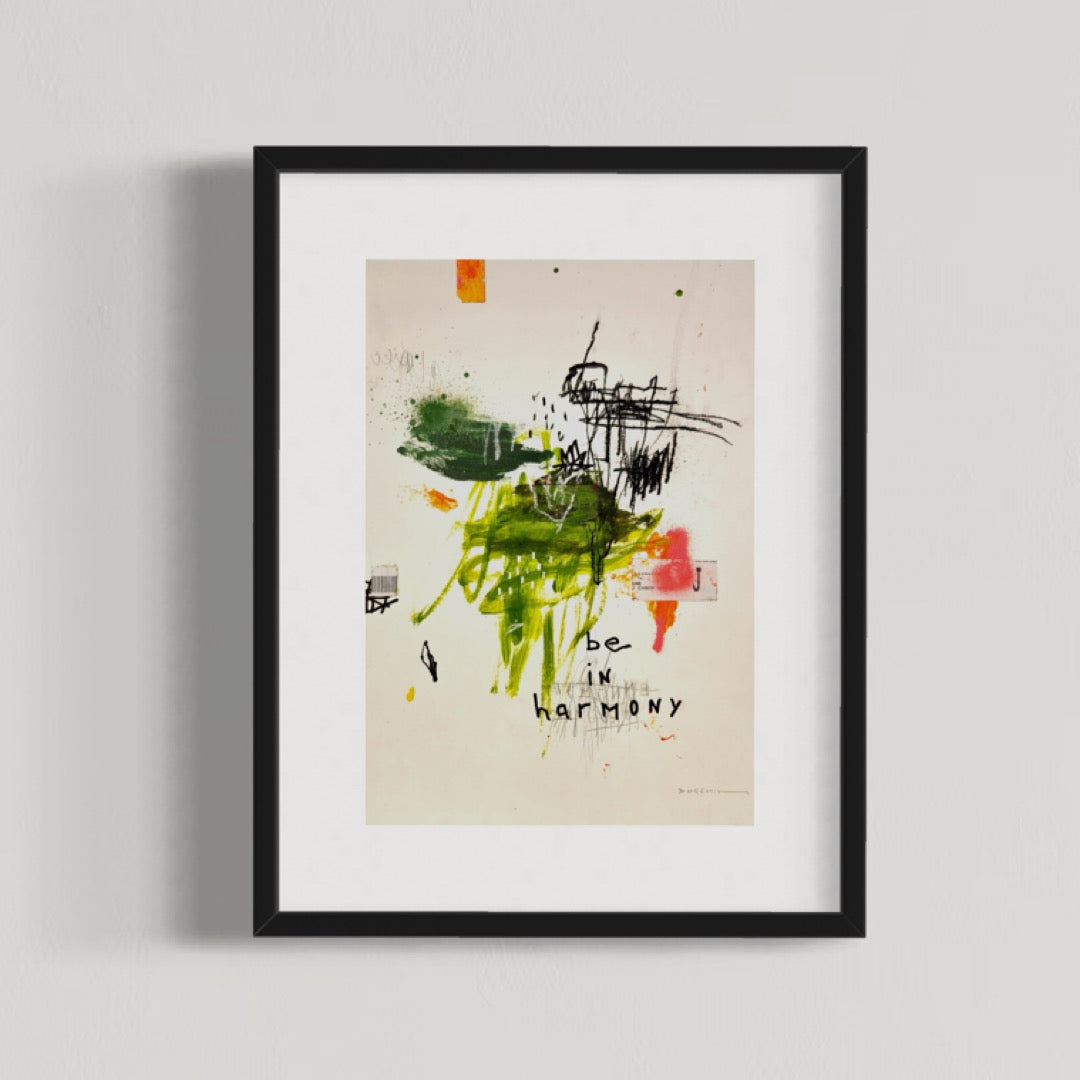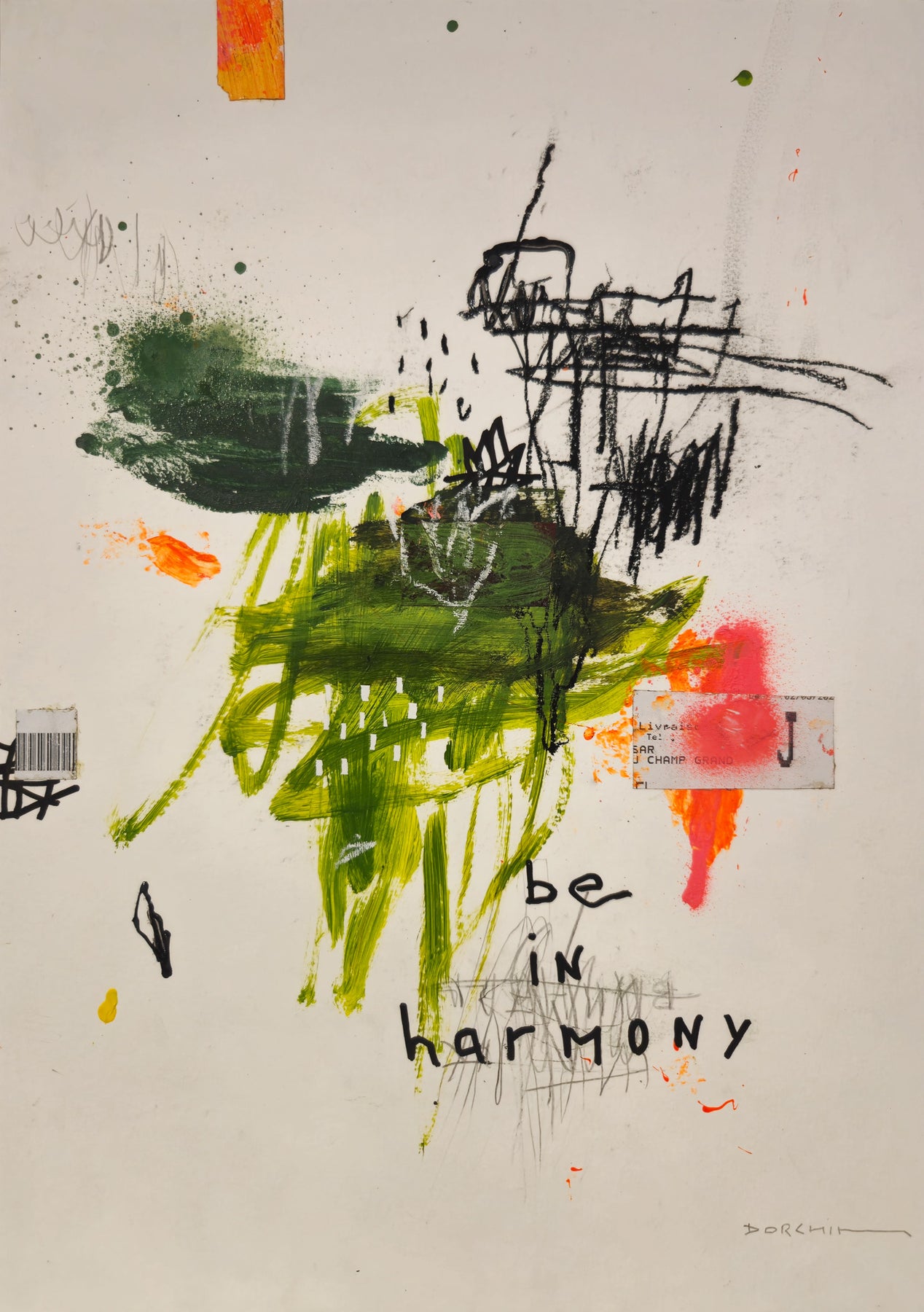 Abstract mixed media artwork on paper by Laurent Dorchin in black, pink, green and white. Organic linework and minimal illustrations with collage and text elements.