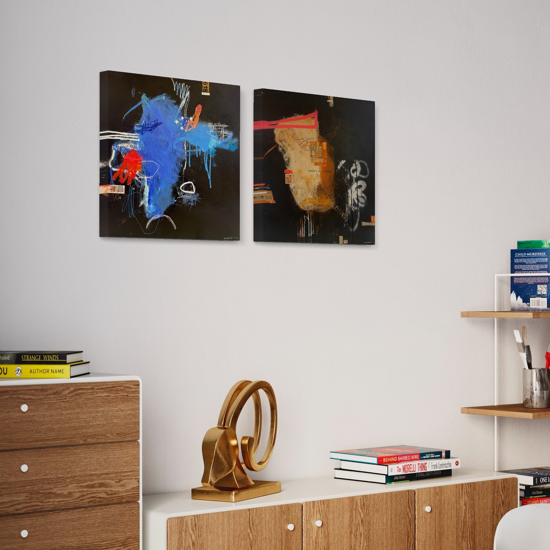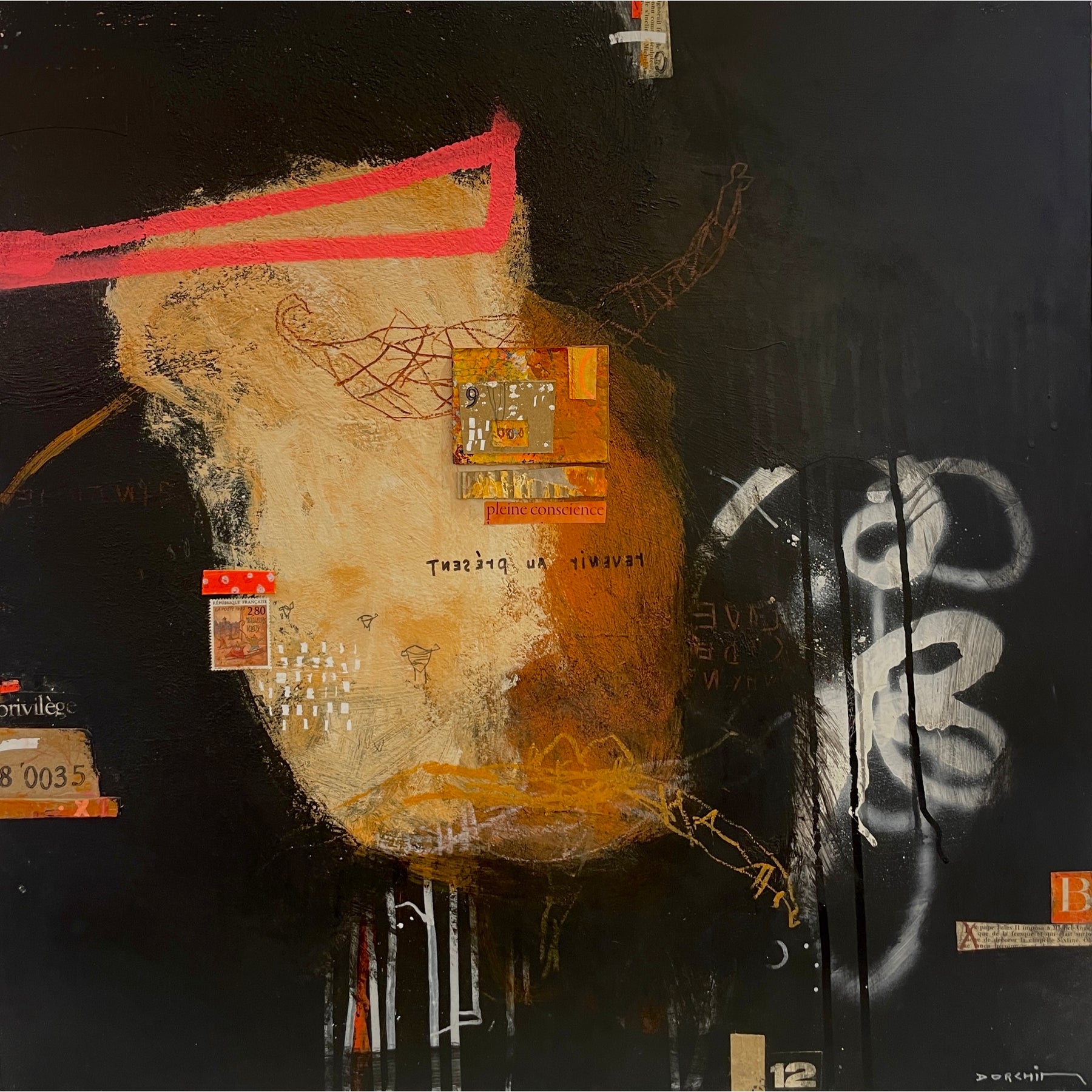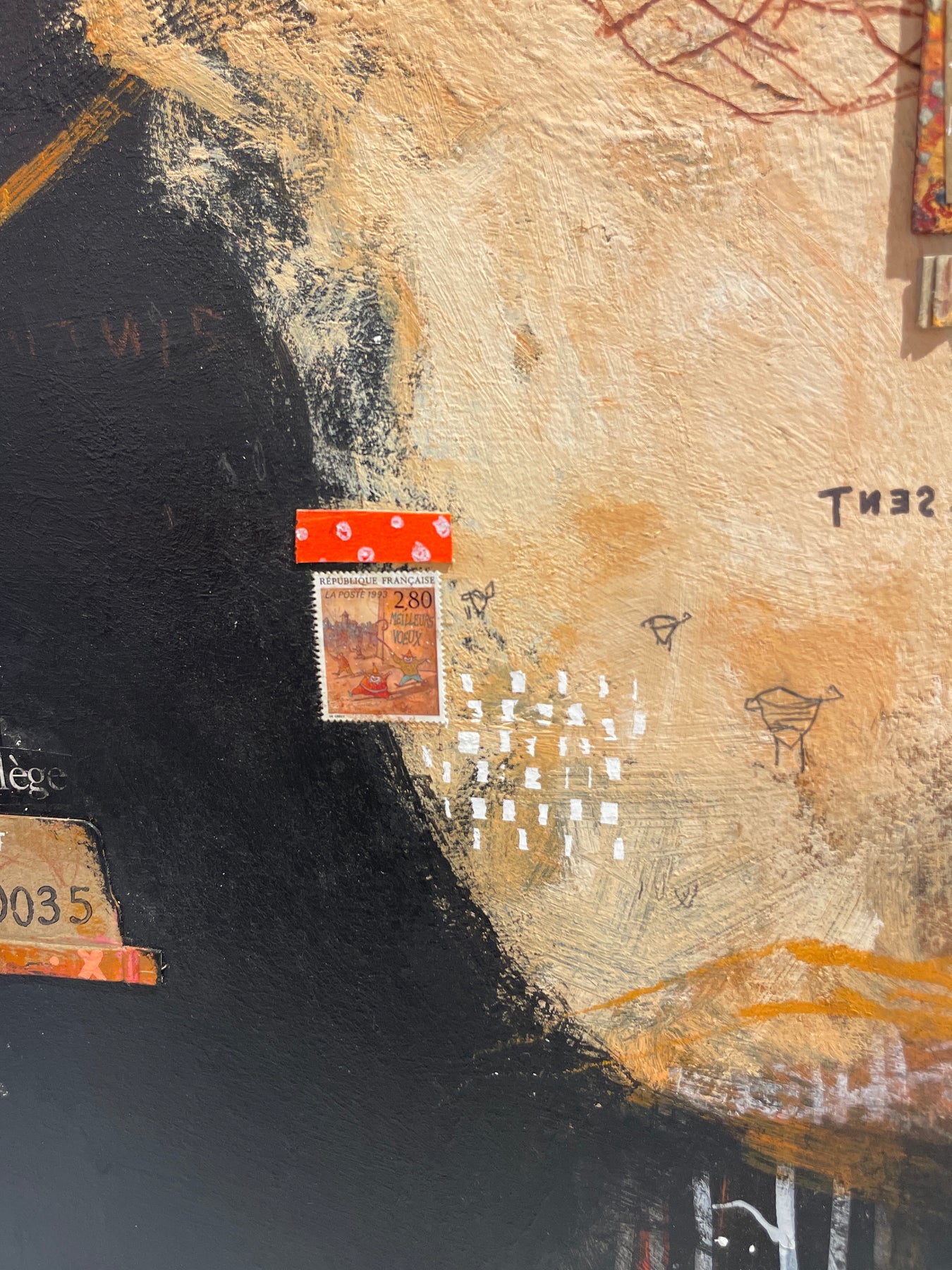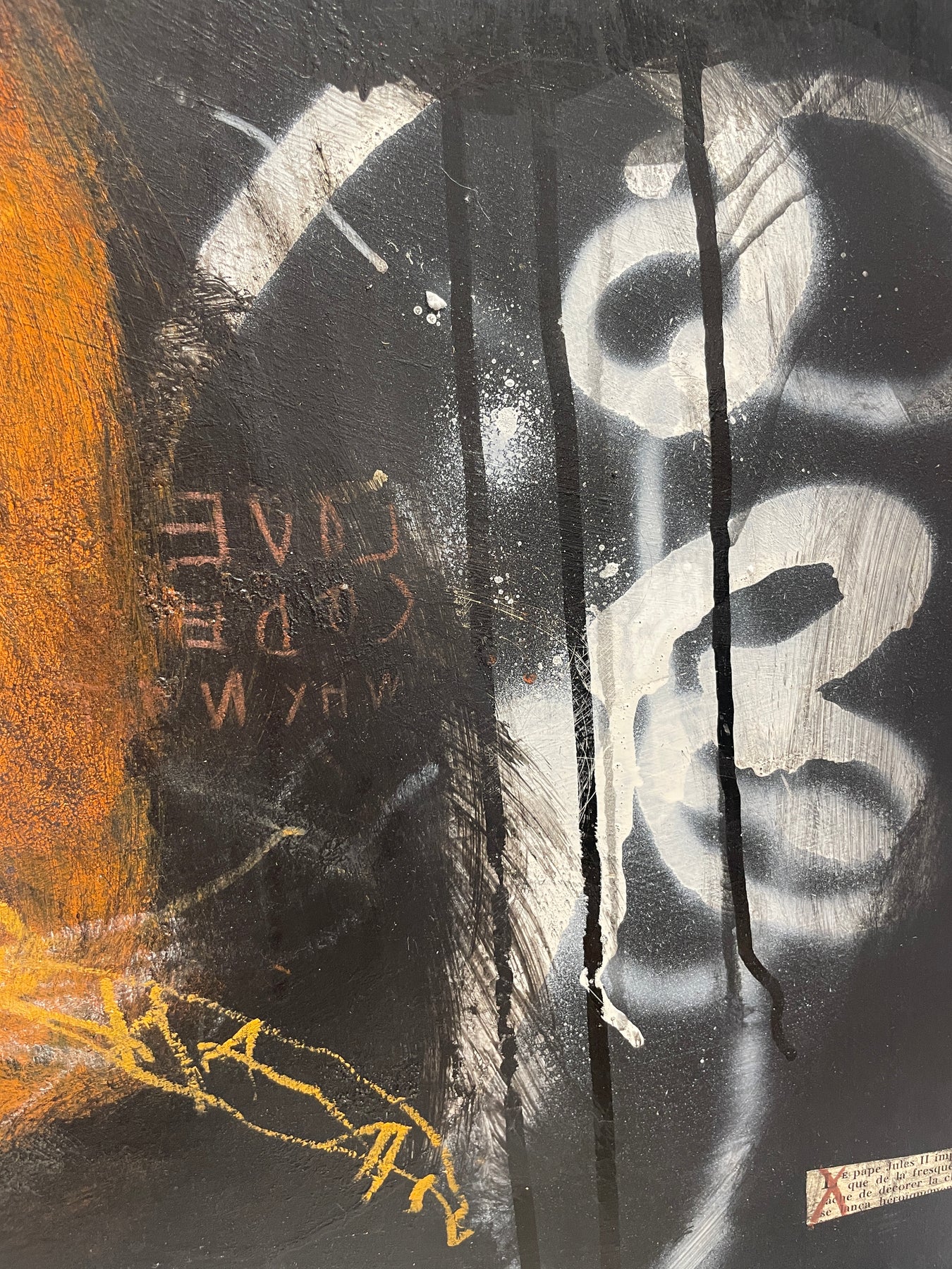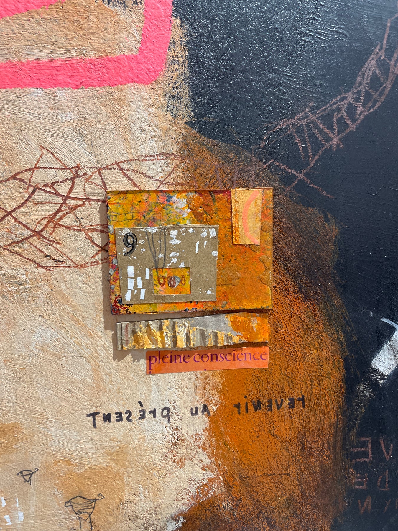• Acrylic paint, collage, graphite, pastel and spray paint on canvas