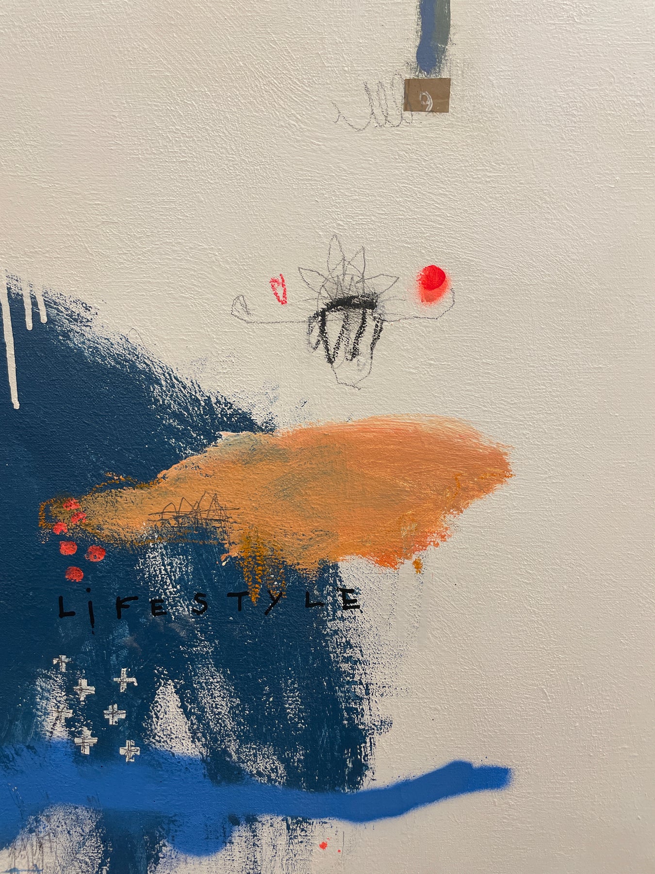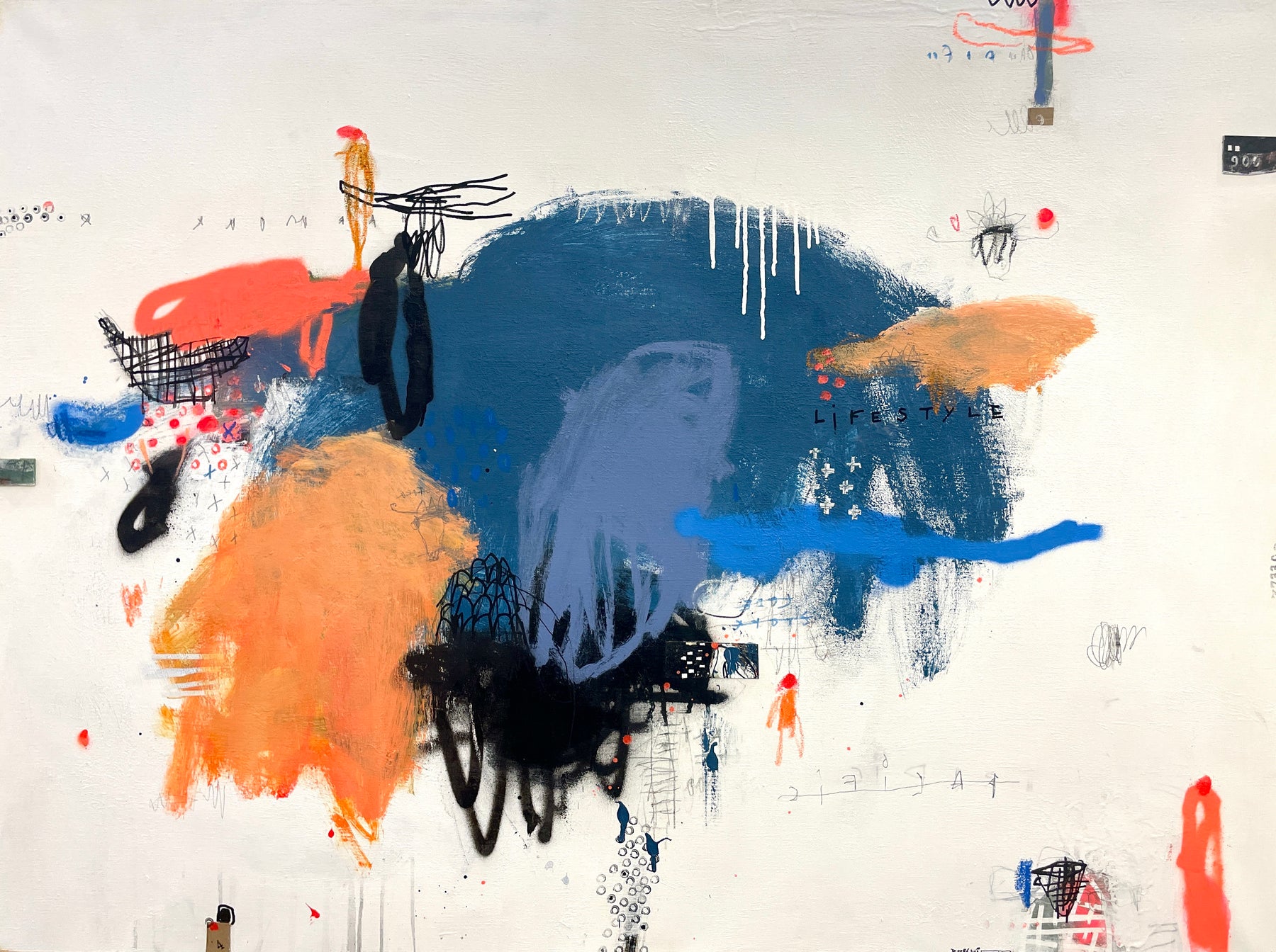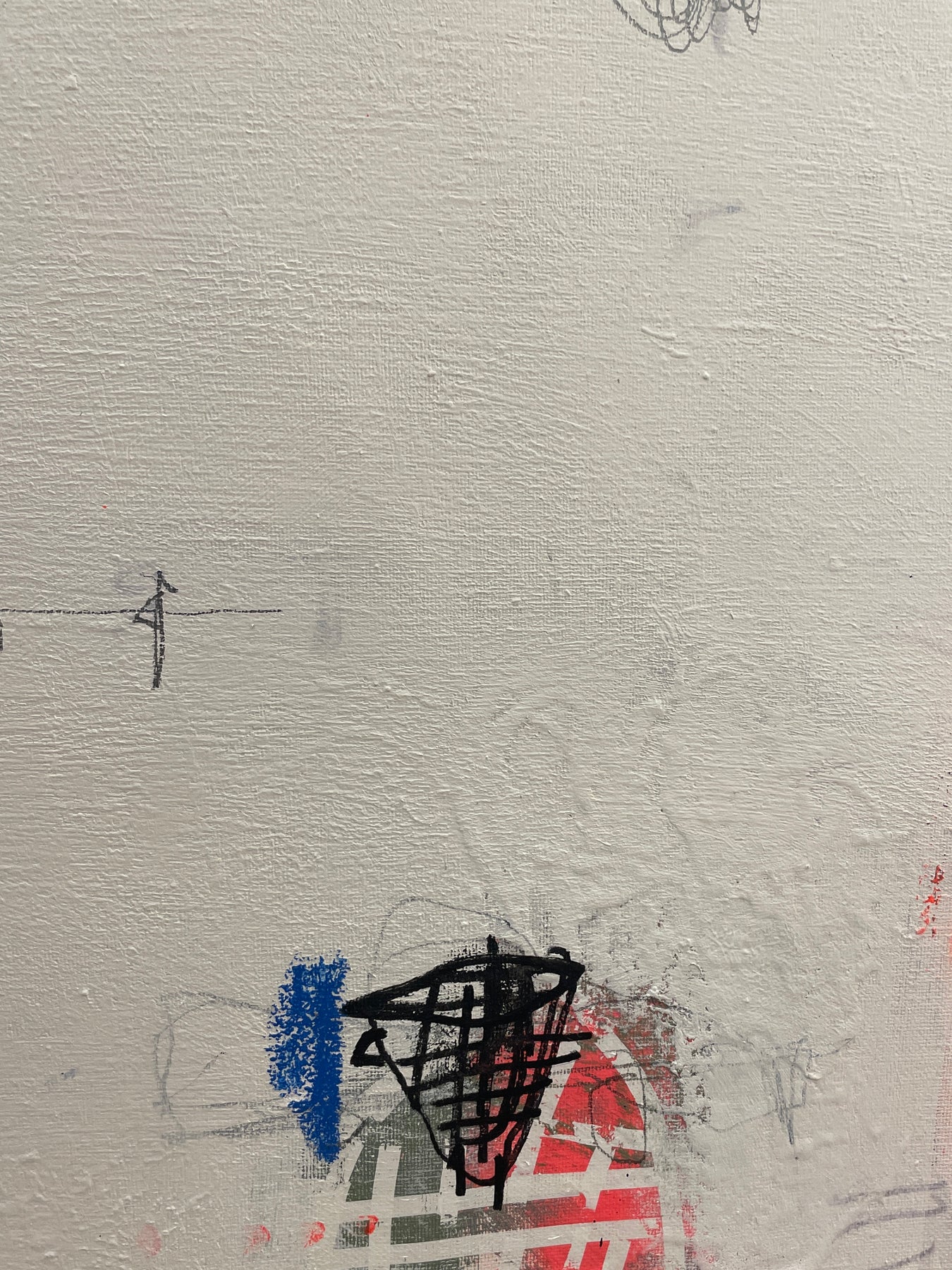 • Acrylic paint, collage, graphite, pastel and spray paint on canvas