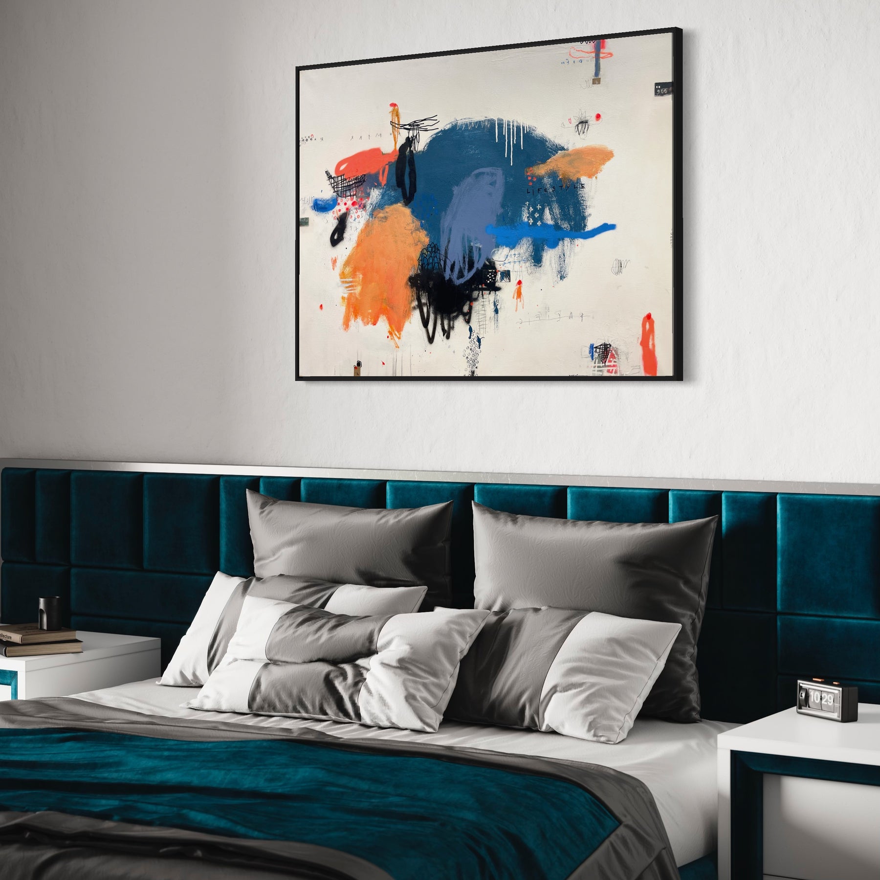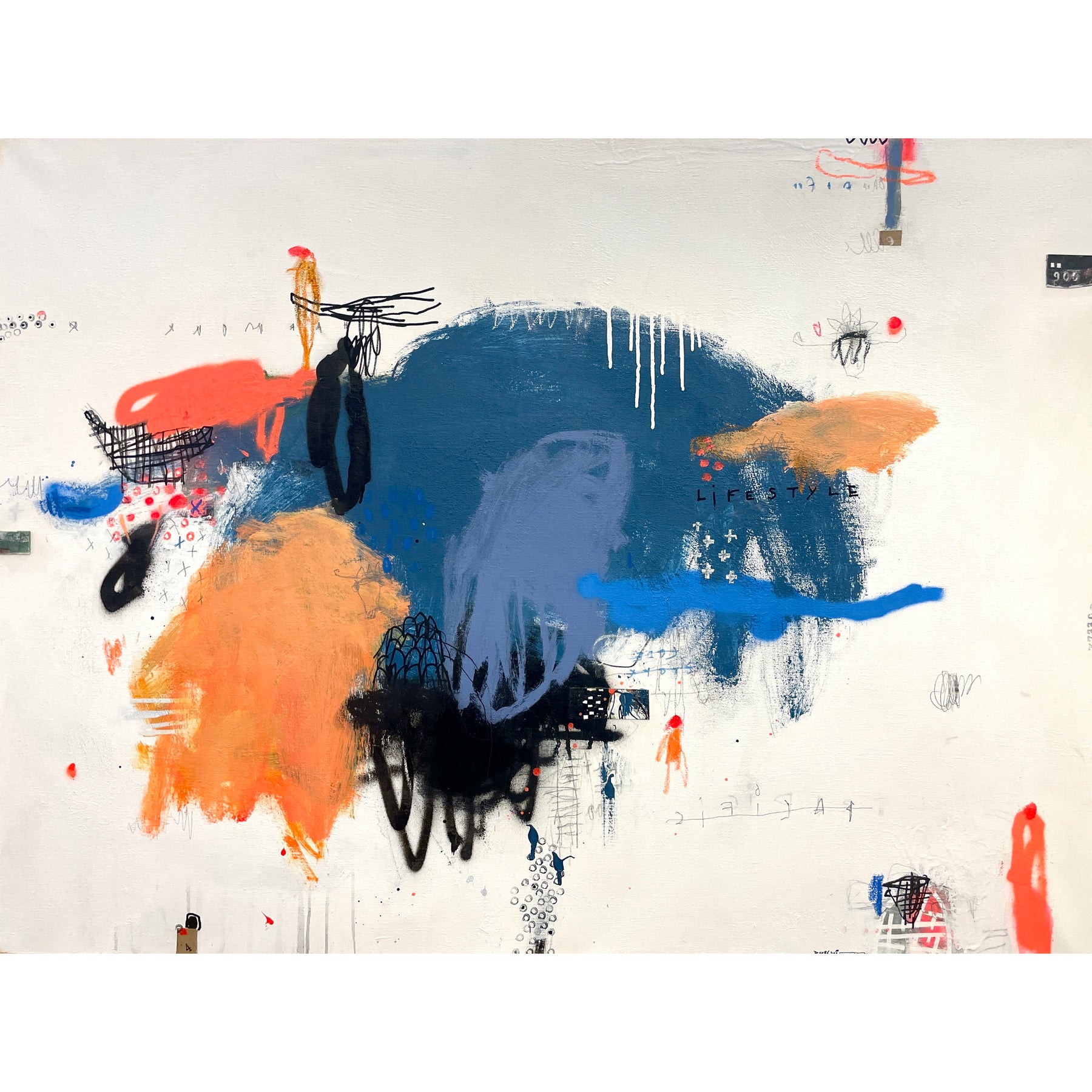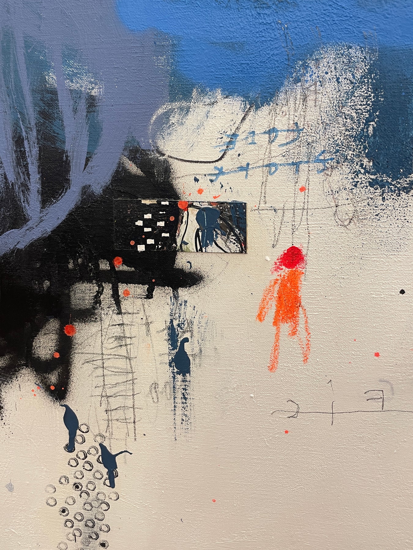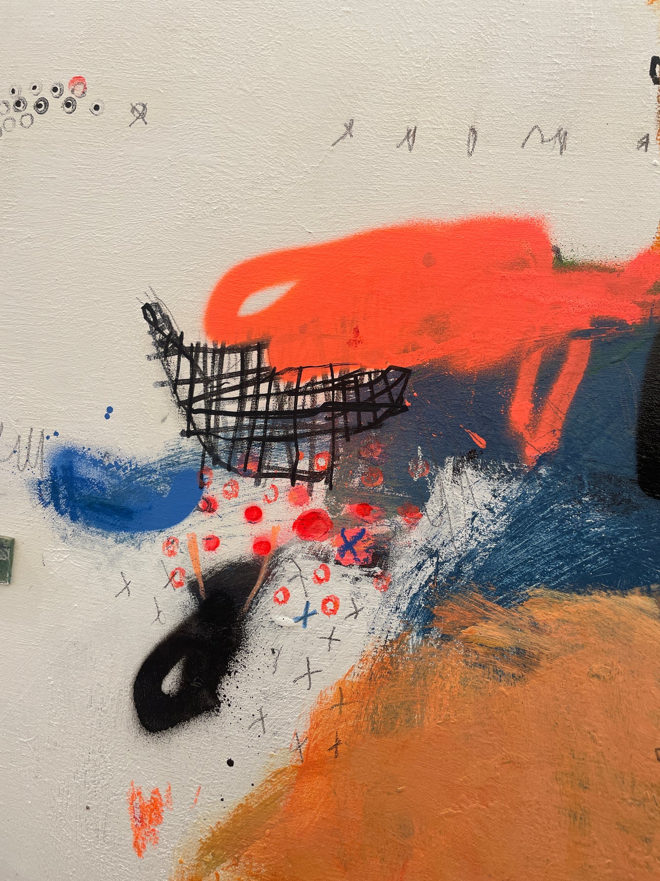 • Acrylic paint, collage, graphite, pastel and spray paint on canvas