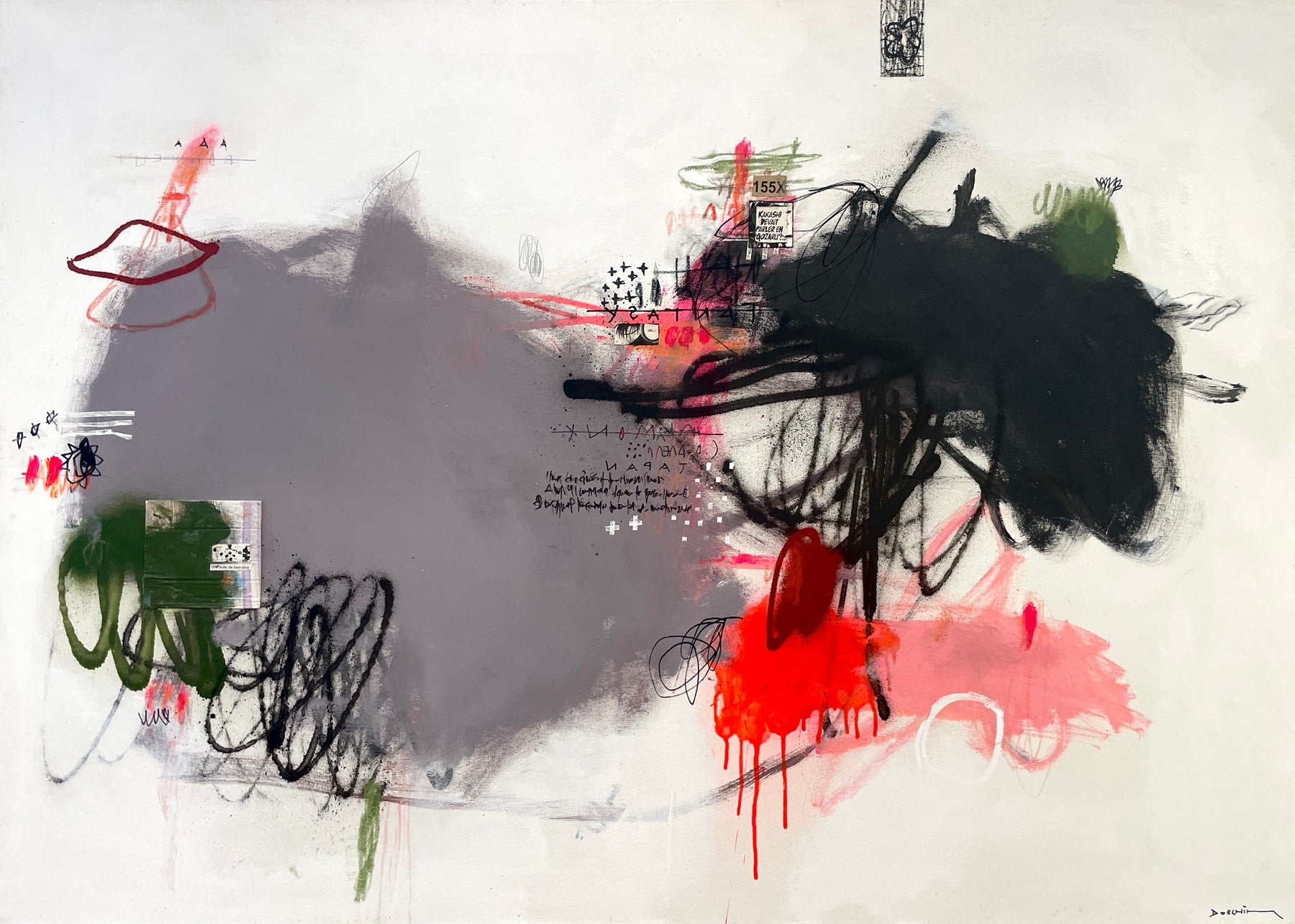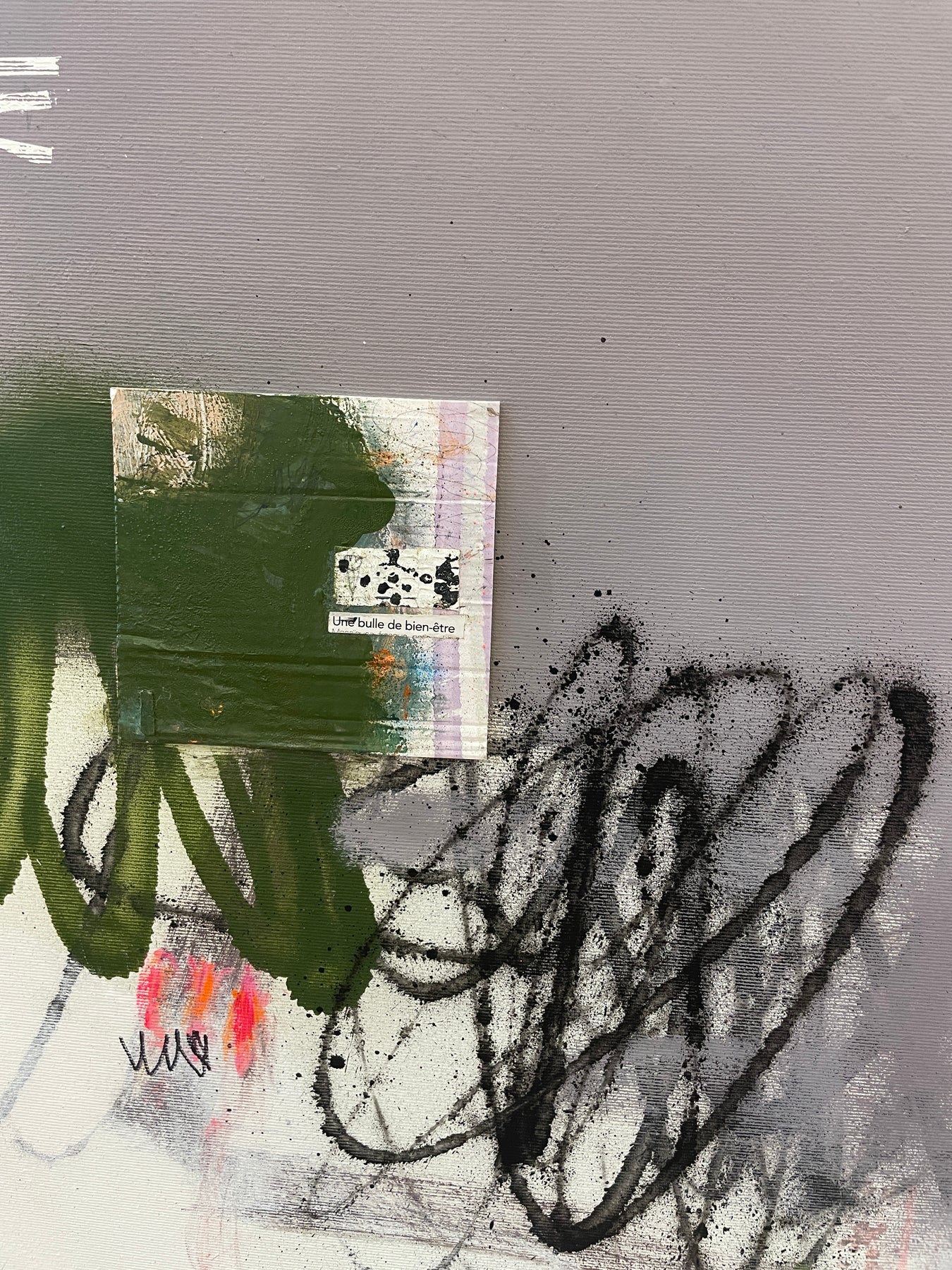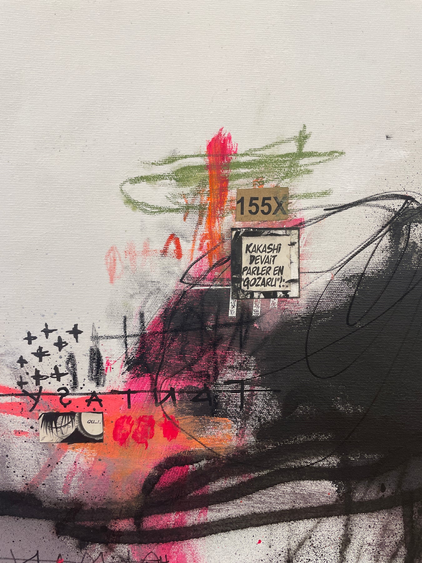 • Acrylic paint, collage, graphite, pastel and spray paint on canvas