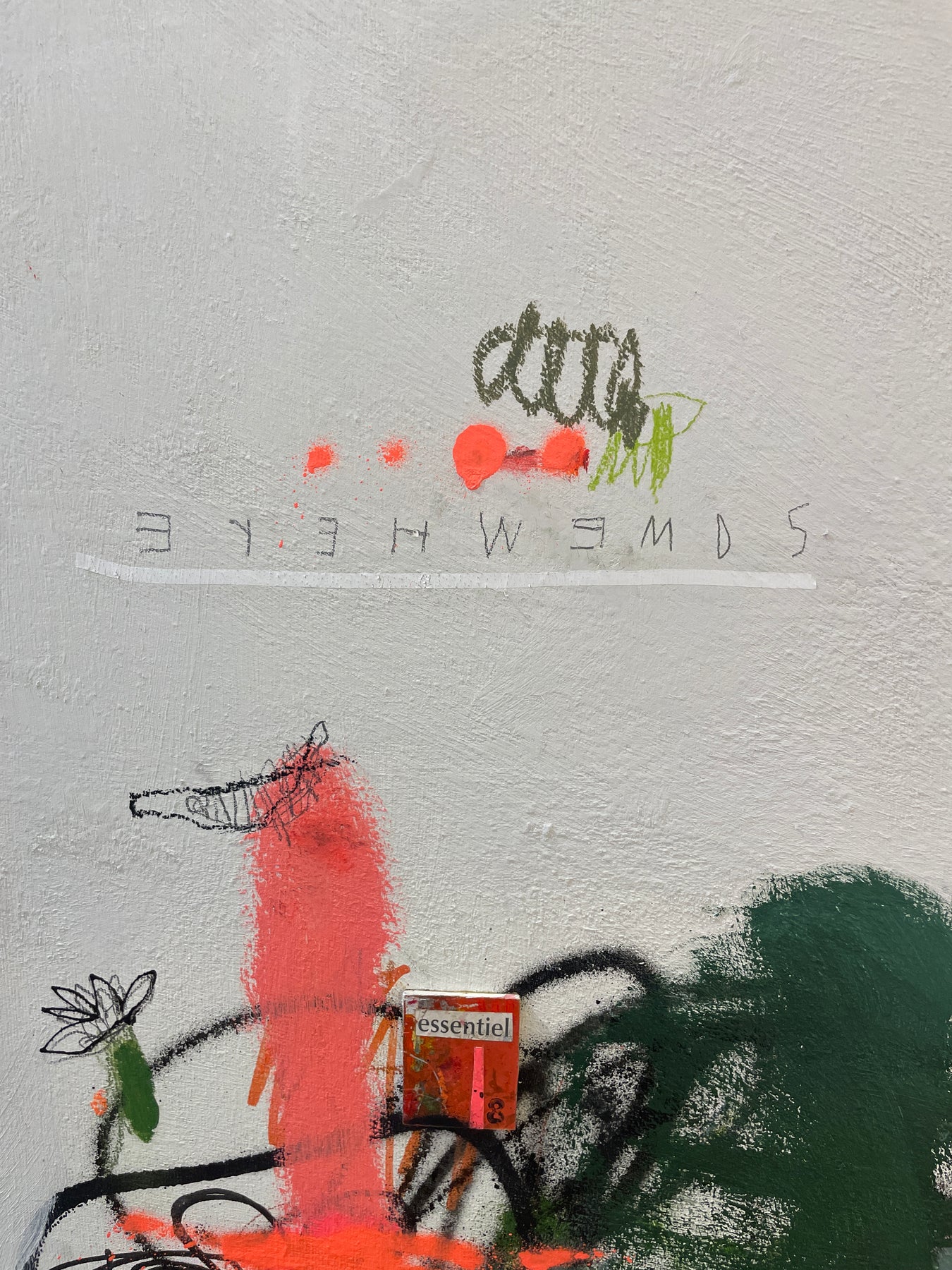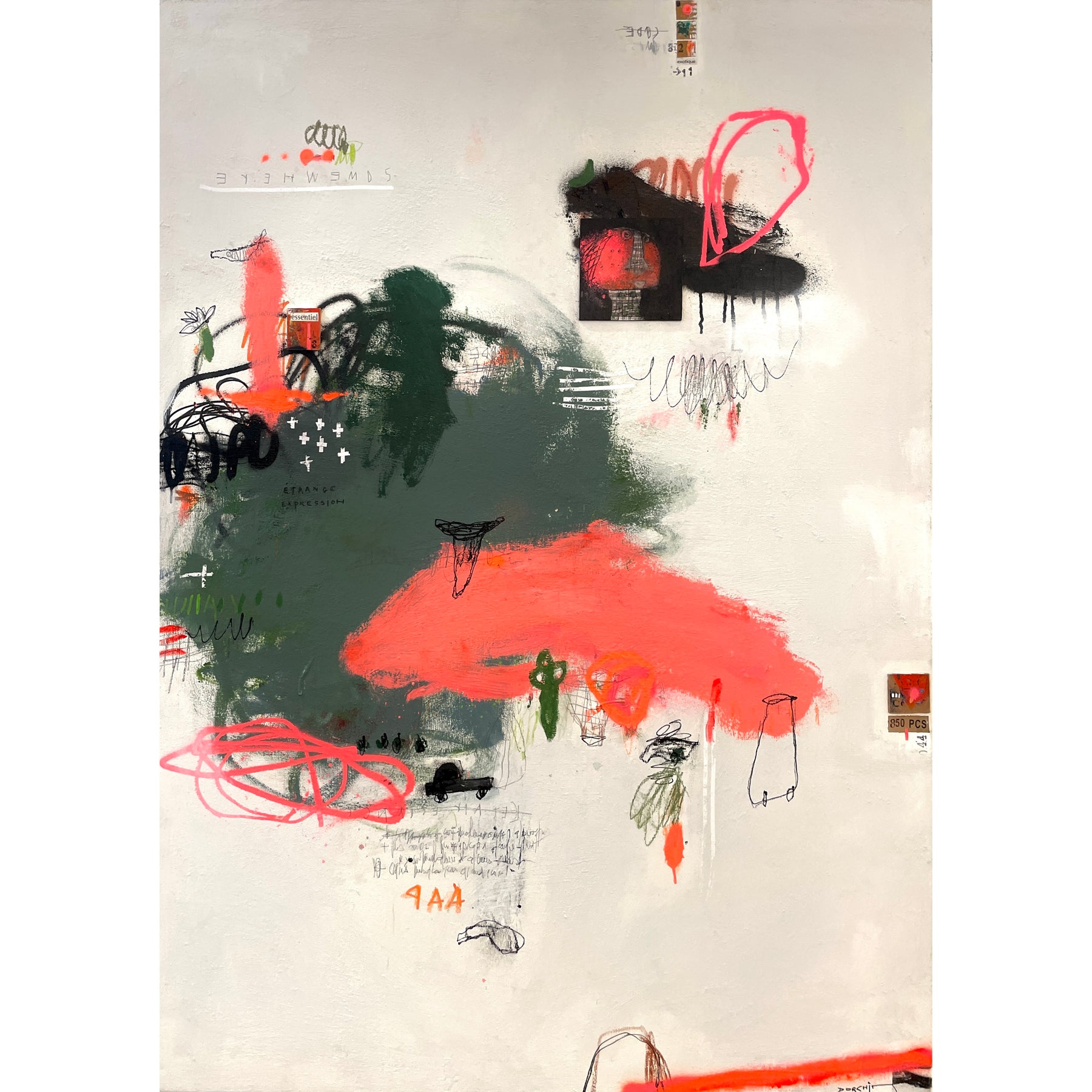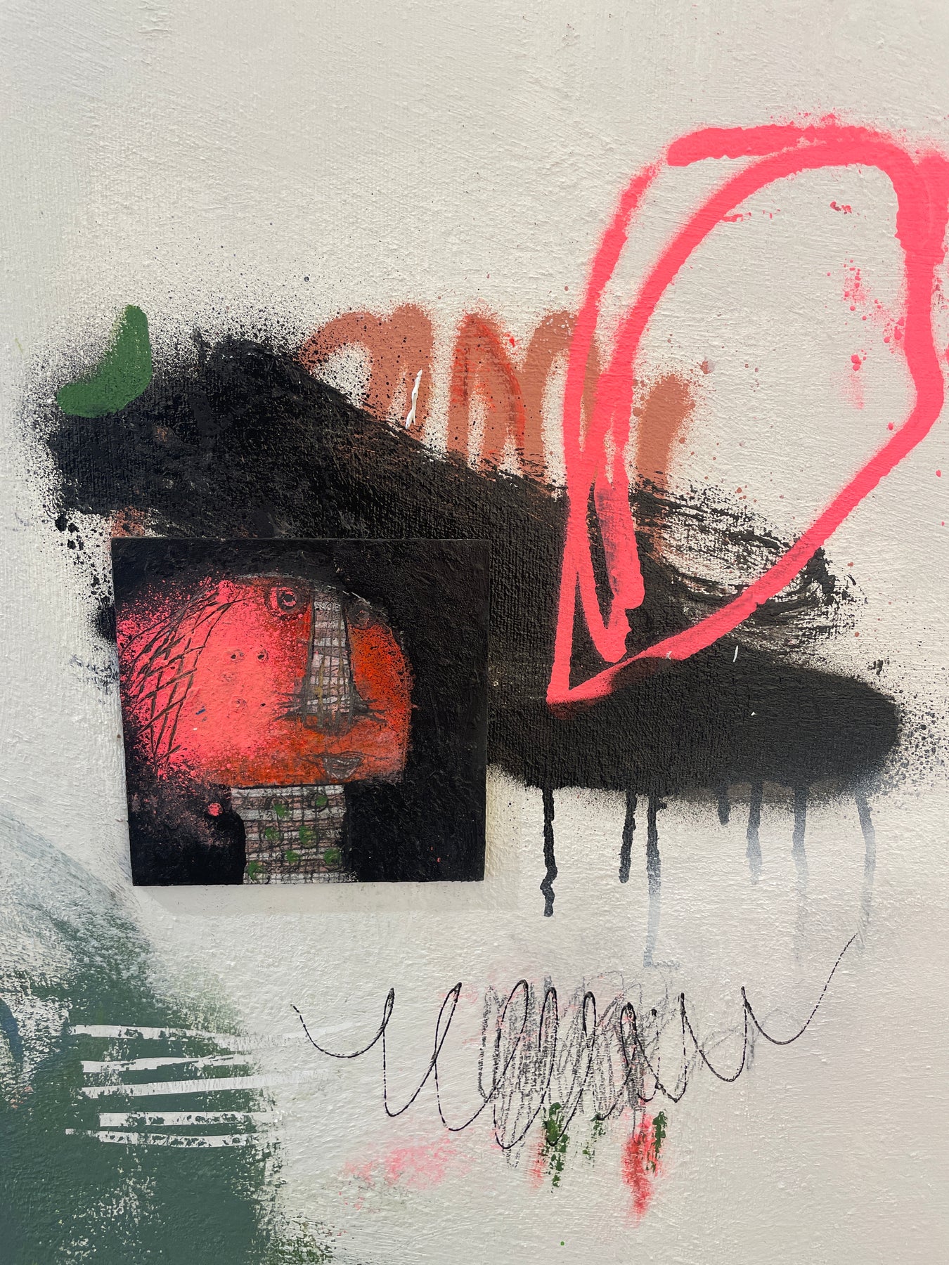 - Acrylic paint, collage, graphite, pastel and spray paint on canvas