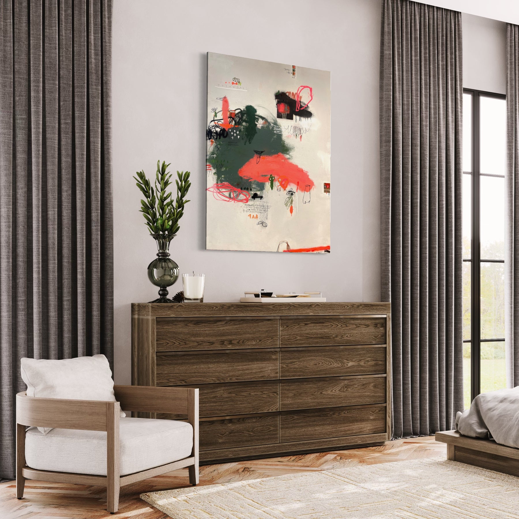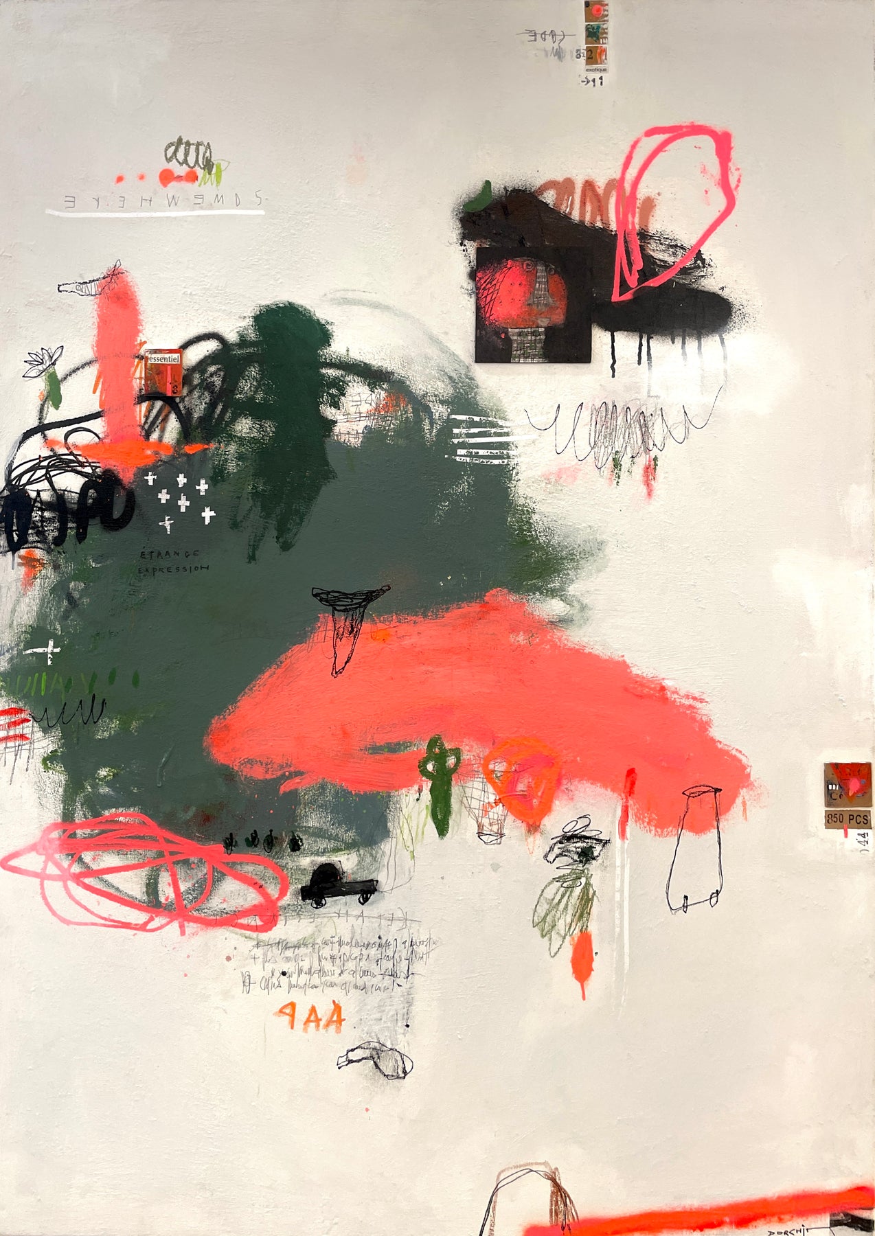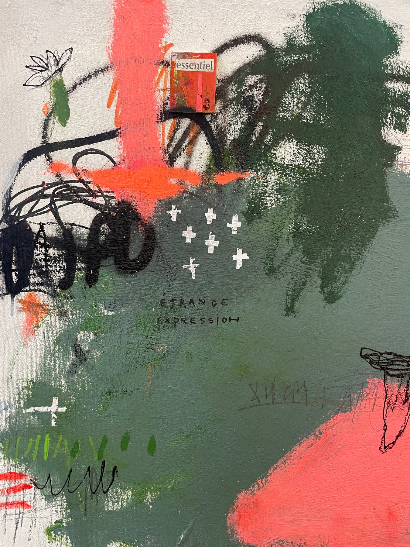 - Acrylic paint, collage, graphite, pastel and spray paint on canvas