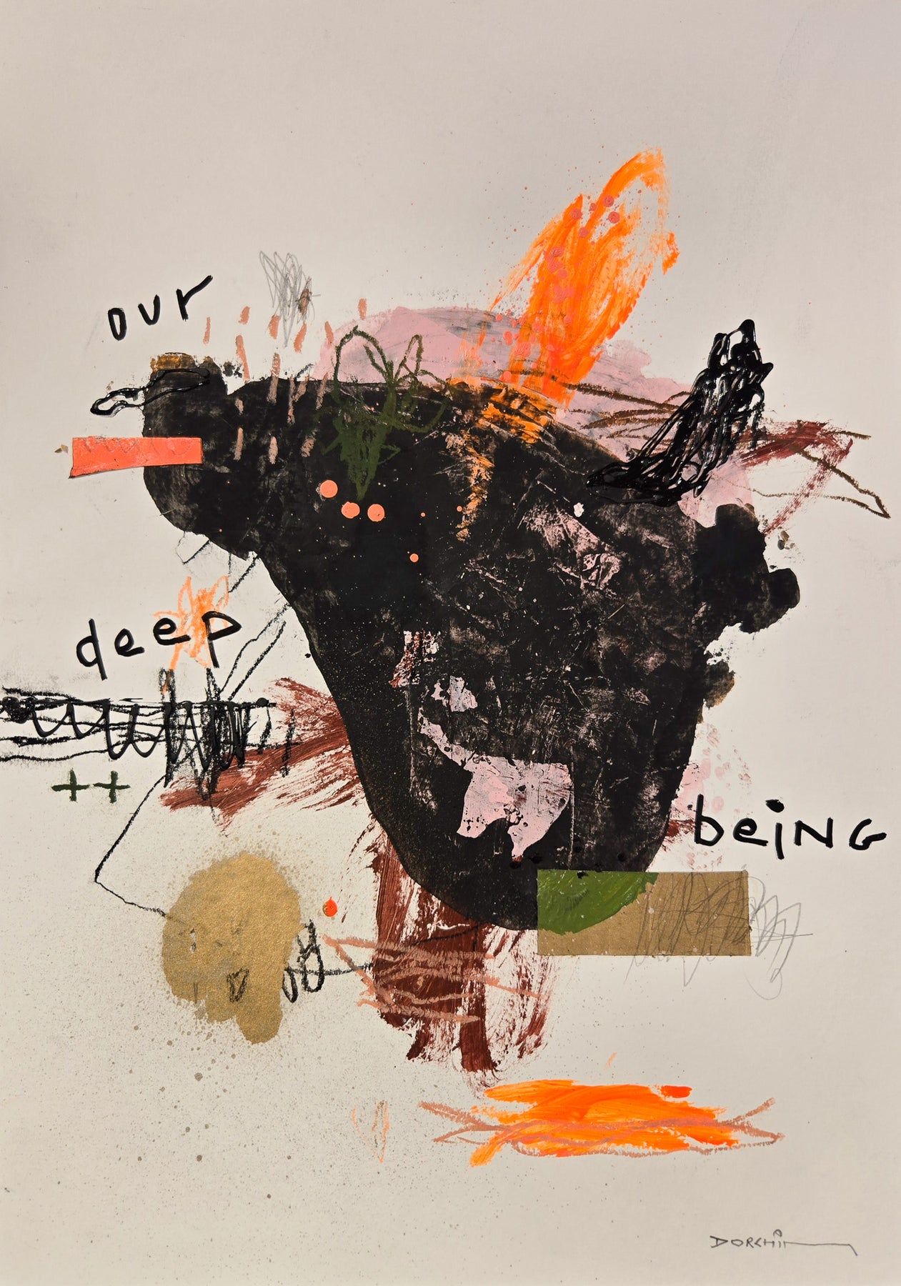 Abstract mixed media artwork on paper by Laurent Dorchin in brown, pink, orange and white. Organic linework and minimal illustrations with collage and text elements.